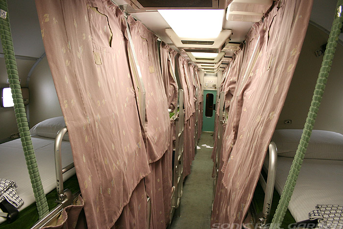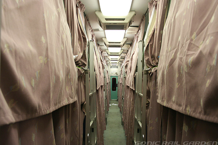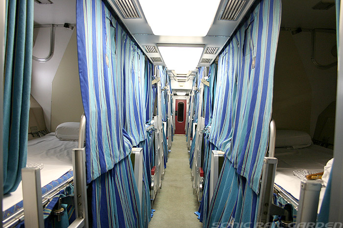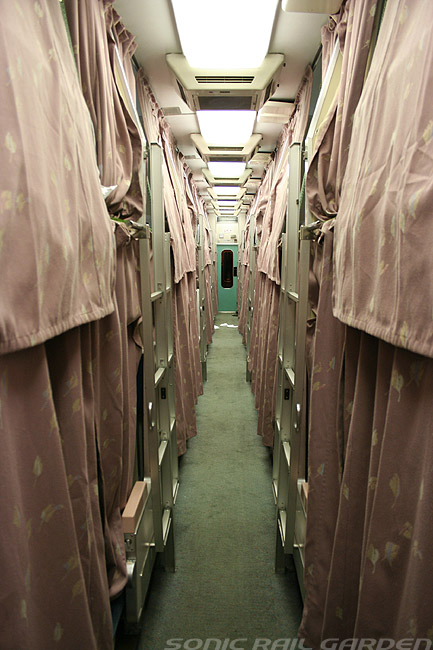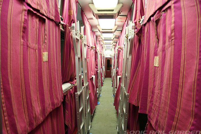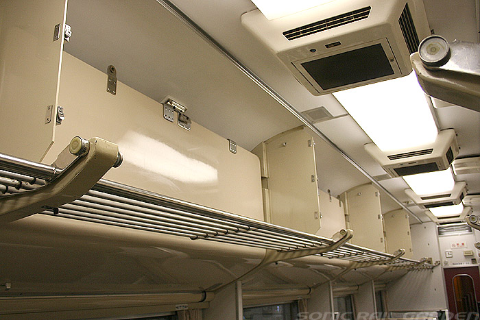 5号車と8・9・10号車の4両はB寝台車。「583系らしい雰囲気」が最も味わえる空間となっています。 客室仕様は登場時から普遍の、中央通路に両脇を寝台で固めたスタイル。ことB寝台では両脇が「カーテンの壁」のような様相。 一部分を除き、基本形は下段・中段・上段の3段式寝台。各寝台のサイズは、 上段は、幅が約700mm・長さが約1,900mm・高さが約680mm。 中段は、幅が約700mm・長さが約1,900mm・高さが約680mm。 下段は、幅が約1,000mm・長さが約1,900mm・高さが約750mm。 下段は側面窓を寝台内で完全に抱え込むので大きな窓からの車窓が楽しめますが、上中段はシャッター開閉式の小窓のみ。 また、下段では首が窮屈ながらもなんとか座る体勢が取れますが、上中段では完全に寝る姿勢しか取ることができません。 各寝台位置による利点・弱点は、上の「A寝台」の項で述べたとおり。 下段は寝台から通路への出入りが容易な反面、物音や走行音が気になり、上中段では物音が軽減される反面、狭さがキツい。 そんな中、B寝台にはちょっとした「お買い得」な寝台区画があり、通称「パン下」と呼ばれる、パンタグラフ下の寝台区画。 ここは車体上部にパンタグラフが設置されているため天井が低く、3段寝台が設定できないため、下段と中段の2段式になっています。 下段はほかの区画と同じサイズとなっているのですが、中段がほかと比べて圧倒的な広さとなっているのが特徴。 そんな「パン下・中段」のサイズは、天井高さが1,000mmを超える寸法になっており、583系のB寝台では最大サイズ。 パンタグラフのある8号車のみに設定されていて、1・2・11・12・13・14番寝台中段のわずか6区画のみのプレミアムゾーン。 繁忙期はもちろん、通常の時期でも他がガラガラでもここだけは満席ということも。 ただし、中段寝台なので側面窓は小型のシャッター開閉窓のみなので、そこだけ気にしなければかなりお買い得な寝台です。 寝台設備のアメニティとして、浴衣とハンガーが各寝台上に、ビニルスリッパは寝台下にセットされています。 テーブルは、下段では窓下の大きなものと肘掛の窪みを小物置きとして使えます。 中段には小さな小物置きがありますが、上段にはテーブルや小物置きの類のものが一切ありません。 読書灯は全寝台に完備。「消灯」「豆電球「蛍光灯」の3段設定が可能なものとなっています。 一部の車両には着替え室や大型荷物置き場、スキー板収納スペースなどがあります。(編成によってはこれらが無い場合もある) 5号車と8号車は「喫煙車」となっていますが、デッキのみでの喫煙が可能となっていて、寝台客室内は全て禁煙です。 B寝台でも米原〜長岡間で減光が行われます。 |