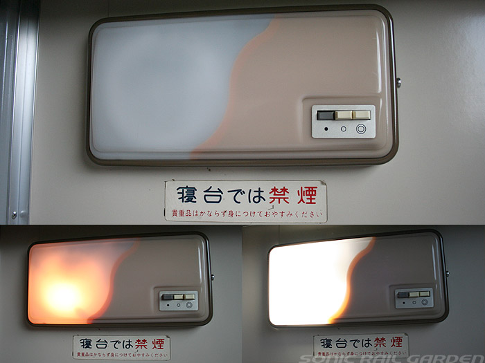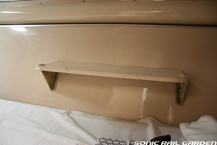 中段寝台の読書灯。配線が完全に剥き出しで這わせてあるのがすごい。 | ![]()