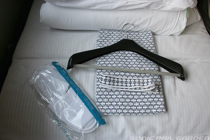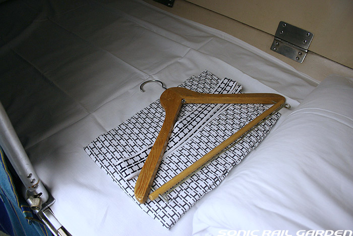 B寝台の乗客にサービスされるアメニティ。浴衣とハンガー。 | ![]()