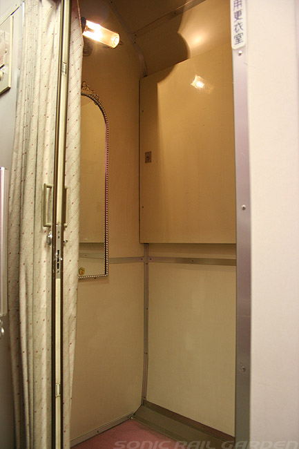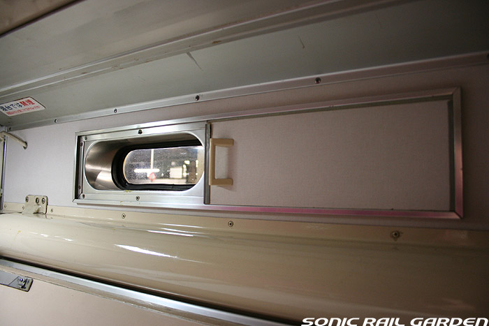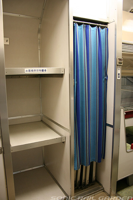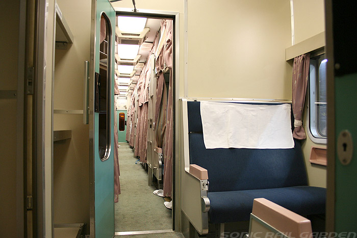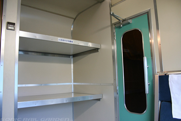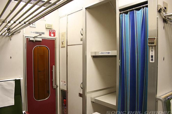 編成中に1両だけ、7号車に連結されている「A寝台」車。 元々583系で「A寝台車」は製造されませんでしたが、「きたぐに」号を14系客車から583系電車に車種変更する際に、 14系編成に連結されていたA寝台車のニーズが高かったため、B寝台「サハネ581」をA寝台化改造して連結されたという経緯があります。 通路を中央に配し、その両脇を寝台とする仕様はB寝台と同じですが、3段式のB寝台に対してA寝台では2段式に改造されました。 寝台サイズは下段が、幅が約1,000mm・長さが1,900mm・高さ約1,200mm。上段は幅が約900m・長さが1,900mm・高さが約1,000mm。 下段寝台は側窓全体を寝台内に抱え込むようになるので、車窓を独り占めすることができます。 寝台内の高さは1,200mmあるので、普通に座った姿勢でも頭が上段寝台の天板につっかえることはありません。 窓下にはテーブル、座席展開時に窓側席の肘掛となる窪みは小物置き場として使えます。 通路が寝台への出入りが容易な反面、床下からの走行音や通路を行き交う人の足音が気になる嫌いはあります。 特に「きたぐに」号では深夜帯の停車駅での乗降が頻繁にあるので、乗客が動く物音や気配に熟睡できないという人もいるかもしれません。 上段寝台は、B寝台の上段と比べるとかなり高い天井高さ(1,000mm)が、寝台内の空間に余裕を感じさせます。 ただし、寝台のほぼ半分が湾曲したカーブ天井となっているので、この独特さに圧迫感を感じるかもしれません。 窓はシャッター式で開閉可能な小窓があるだけなので、純粋に車窓を楽しむという点では下段にかなり劣ります。 その反面、下段で感じるほどの走行音や乗客の足音などに悩まされることは、下段に比べてかなり軽減されるので、 単純に「寝て移動するだけ」という利用に割り切るなら、けっこう積極的に選ぶ要素は大きいです。 A寝台の乗客に与えられるアメニティとしては、ハンガー・浴衣・使い捨てスリッパが各寝台にセットされています。 ハンガーが服を掛けた状態では、下段では服が完全に吊るされた状態になりますが、上段では服の下方が寝台面にやや引っ掛かります。 浴衣は昔から寝台列車でサービスされていた古めかしいスタイルのもの。 使い捨てスリッパは、履いてみるとかなりフワフワの履き心地。航空会社の上級クラスでサービスされるものに匹敵する上質感。 素材としては、「トワイライトエクスプレス」のスイートやロイヤルでサービスされているものと同じものです。 このほか、寝台内の設備としては、上段・下段とも読書灯が設置されています。 カバーの付いた蛍光灯で、ボタンの調節によって「消灯」「豆電球」「蛍光灯」の3段階が選べます。 A寝台車両はデッキ側に乗客の共用空間があります。 大阪方の乗降デッキ側には、対面のボックス座席と着替え室、大型のバゲージスペースが。 ボックス席はA寝台専用のちょっとしたサロンスペース。ここは喫煙スペースとなっていて、座席袖部分に灰皿が設置されています。 着替え室は中がカーペット敷きで、ちゃんとしたフィッティングルーム仕様。 大型の姿見鏡があるので、下車後にビシッとビジネススーツに着替えて出かけるとか、女性に着替えにも充分通用するでしょう。 なお、A寝台は米原〜長岡間で通路の照明が落とされる減光が行われます。 |
