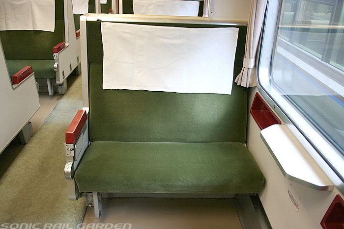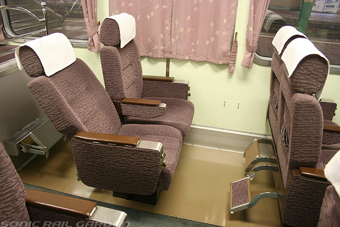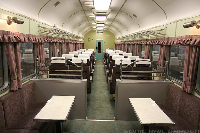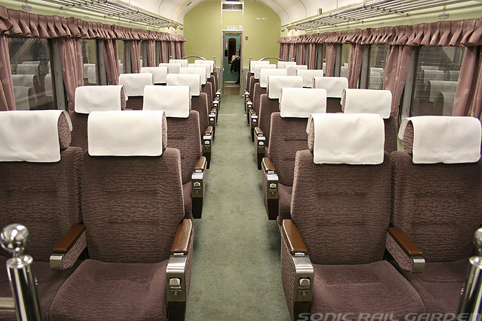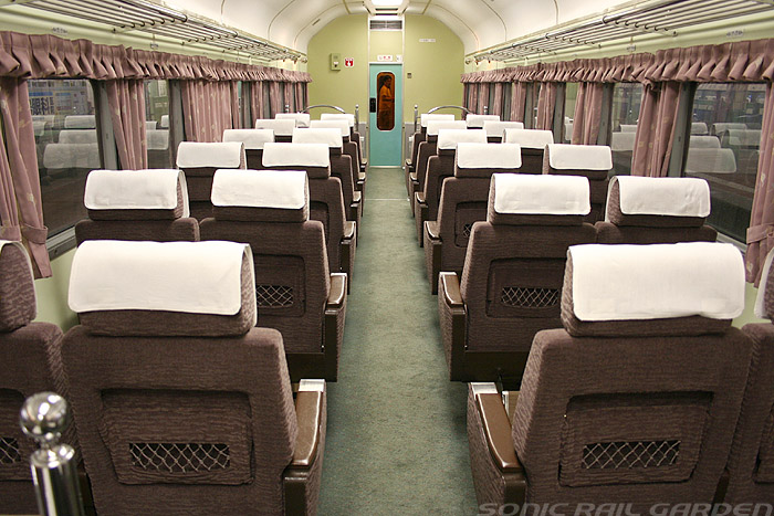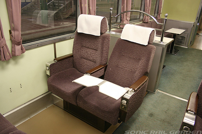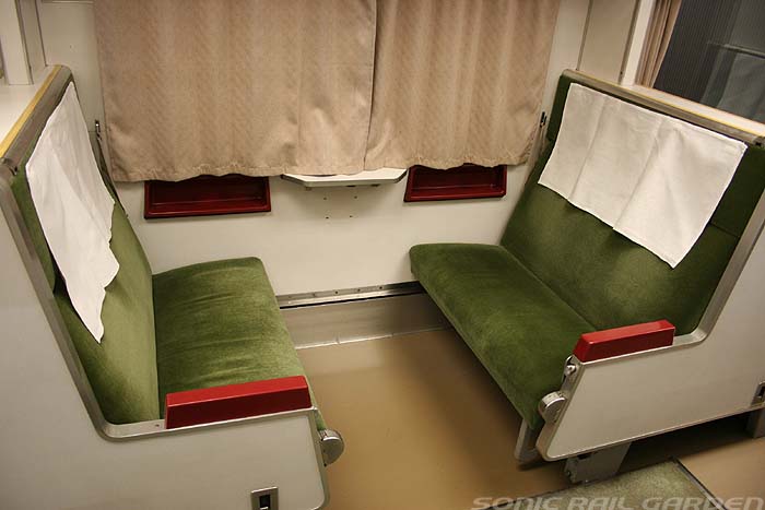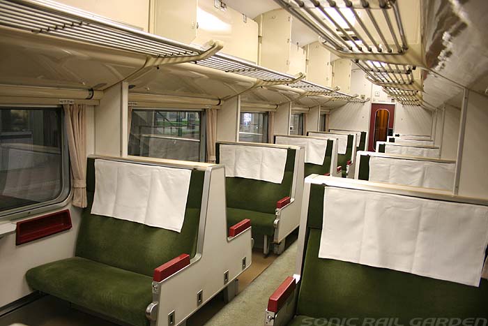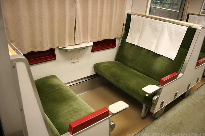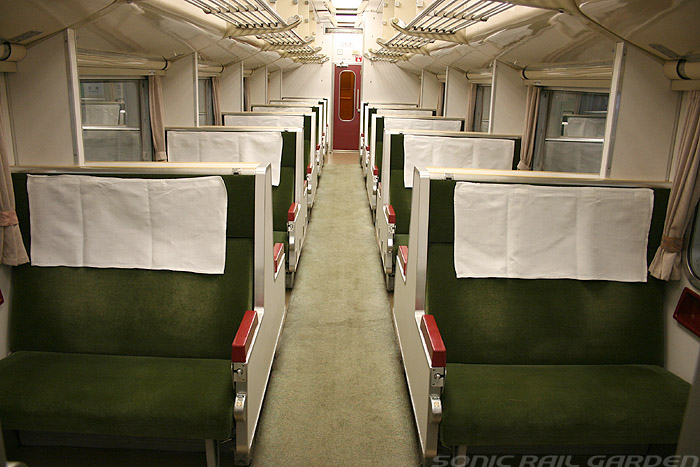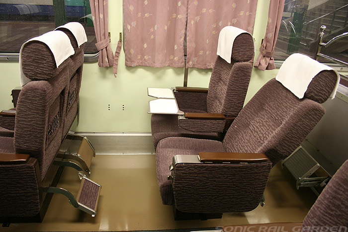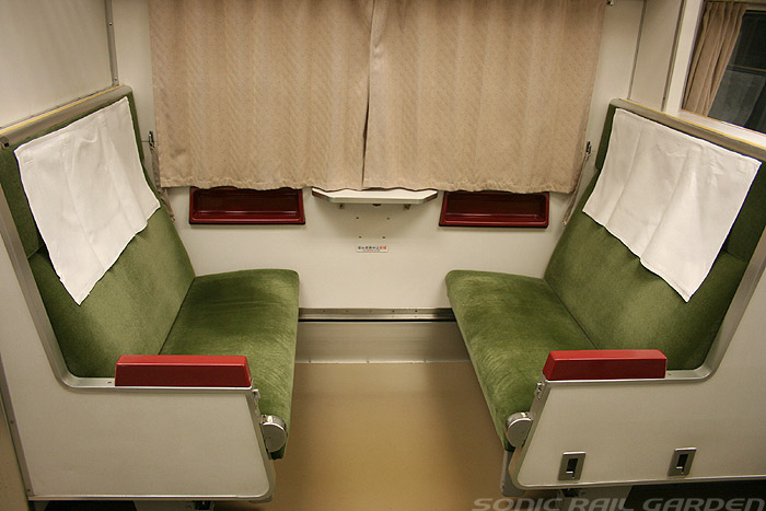 6号車には「グリーン車」が組み込まれています。 座席は2人掛けのものが2+2で配置され、シートピッチは国鉄型特急車の標準ピッチ、1,160mmとなっています。 画像は「サロ581-103」のもので、これは「サロ581」基本形から改造された車両です。 平成元年に「シュプール号」などの特殊用途向けに改造が施されたもので、客室の前後がサロンスペースになりました。 そのため座席数が、2+2の4アブレストが6列の、全24席という極端に定員の少ない車両となっています。 座席は、平成元年改造時でもR27型リクライニングシートが設置されていましたが、 381系グリーン車の改座によって余剰となったフリーストップリクライニングシートが583系へと転用されて設置されました。 また、この「シュプール」向けに改造されたグリーン車は、トイレと洗面台が撤去され、車内販売準備室とリネン室に改造されました。 このように、もともと「きたぐに」専用編成であったグリーン車とは大きく姿を変えているのが特徴。 現在の「きたぐに」ではこの「シュプール編成」も混用されているので、このタイプのグリーン車に当たるかどうかは乗車当日次第。 ちなみに、元々「きたぐに」用編成のグリーン車のトイレには、改造によって洋式トイレが設置されています。 「きたぐに」には普通車指定席が連結されていないため、確実に予約しておける座席車はこのグリーン車のみ。 そのため、「指定席」代わりにこのグリーン席を購入する乗客も多いそうです。 グリーン車でも米原〜長岡間で減光が行われます。 |