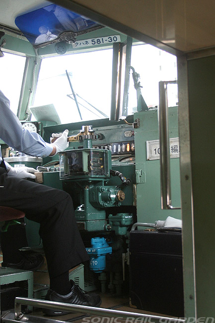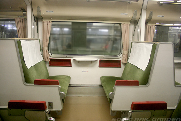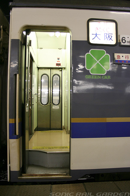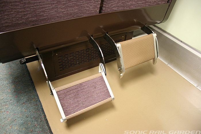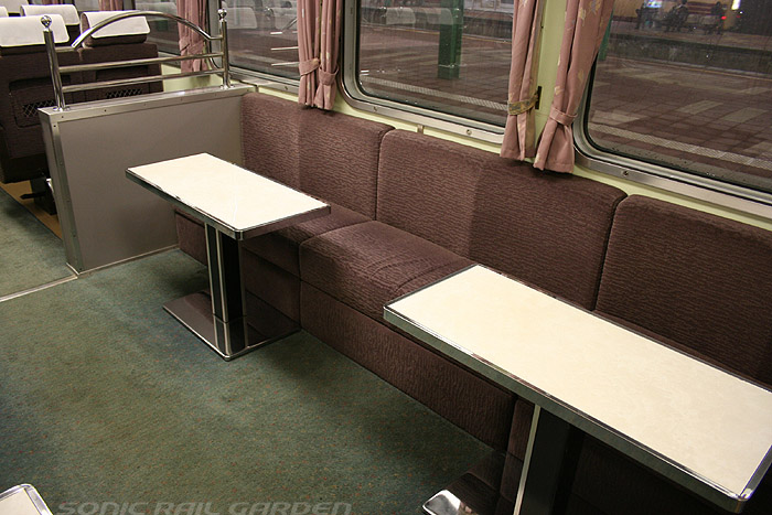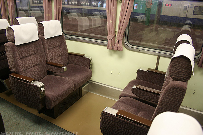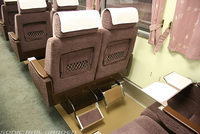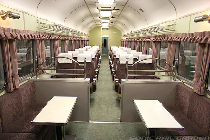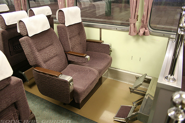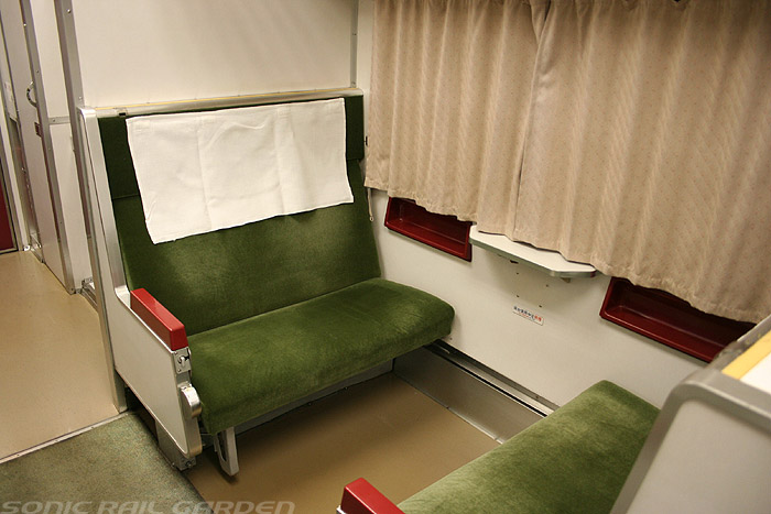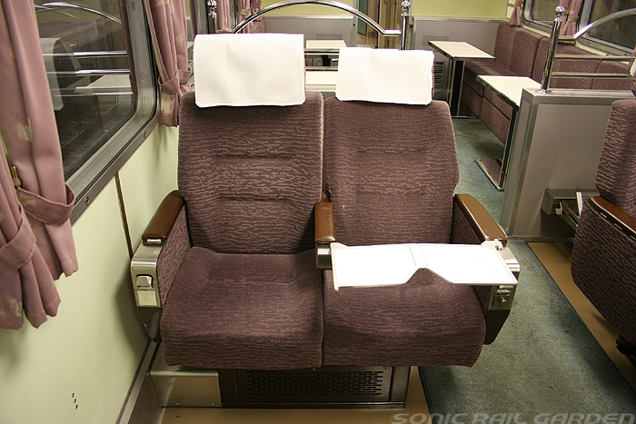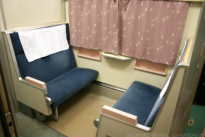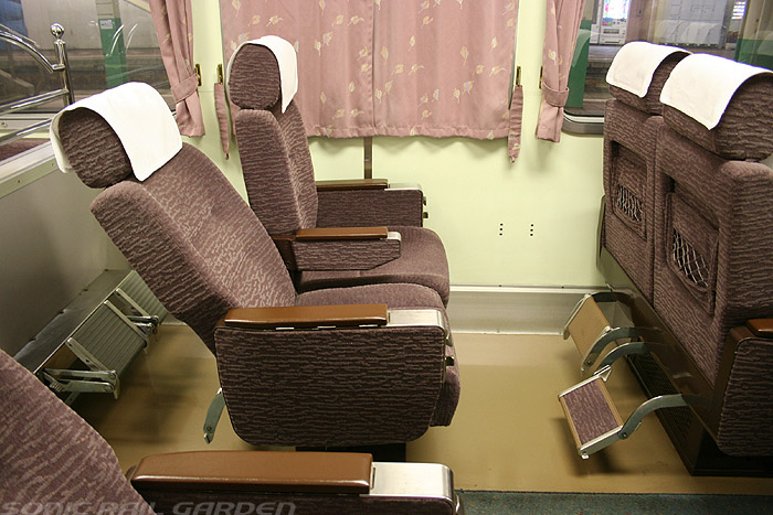 6号車には「グリーン車」が組み込まれています。 座席は2人掛けのものが2+2で配置され、シートピッチは国鉄型特急車の標準ピッチ、1,160mmとなっています。 画像は「サロ581-103」のもので、これは「サロ581」基本形から改造された車両です。 平成元年に「シュプール号」などの特殊用途向けに改造が施されたもので、客室の前後がサロンスペースになりました。 そのため座席数が、2+2の4アブレストが6列の、全24席という極端に定員の少ない車両となっています。 座席は、平成元年改造時でもR27型リクライニングシートが設置されていましたが、 381系グリーン車の改座によって余剰となったフリーストップリクライニングシートが583系へと転用されて設置されました。 また、この「シュプール」向けに改造されたグリーン車は、トイレと洗面台が撤去され、車内販売準備室とリネン室に改造されました。 このように、もともと「きたぐに」専用編成であったグリーン車とは大きく姿を変えているのが特徴。 現在の「きたぐに」ではこの「シュプール編成」も混用されているので、このタイプのグリーン車に当たるかどうかは乗車当日次第。 ちなみに、元々「きたぐに」用編成のグリーン車のトイレには、改造によって洋式トイレが設置されています。 「きたぐに」には普通車指定席が連結されていないため、確実に予約しておける座席車はこのグリーン車のみ。 そのため、「指定席」代わりにこのグリーン席を購入する乗客も多いそうです。 グリーン車でも米原〜長岡間で減光が行われます。 |