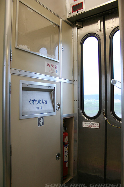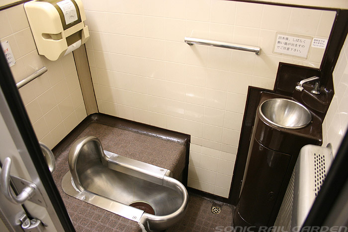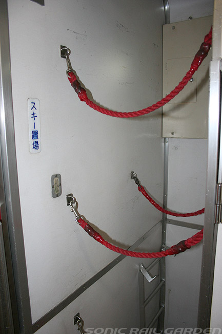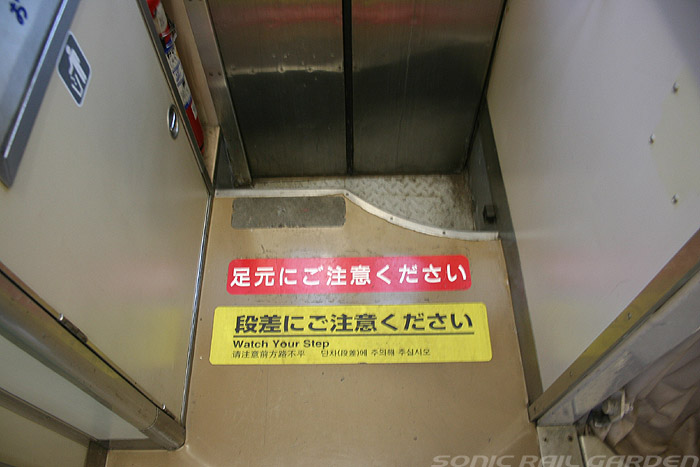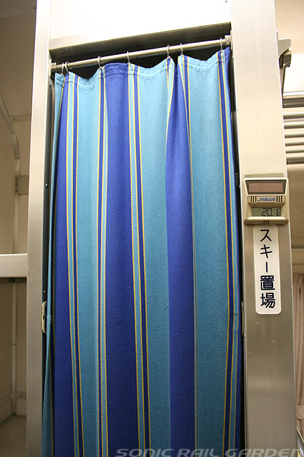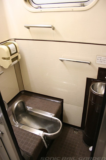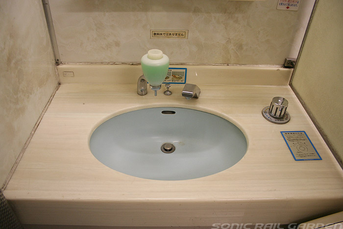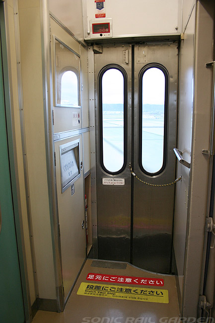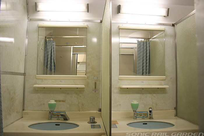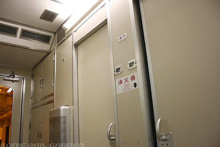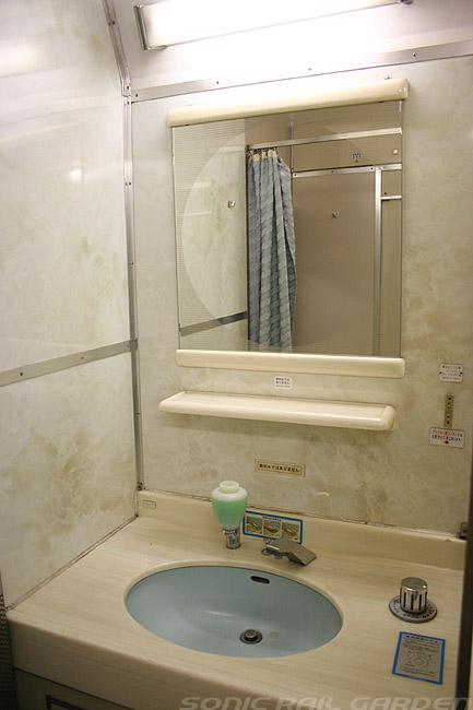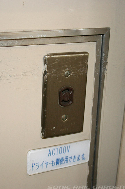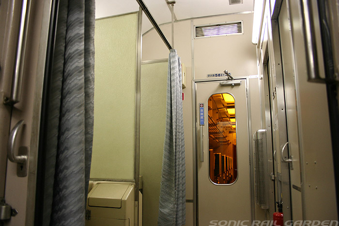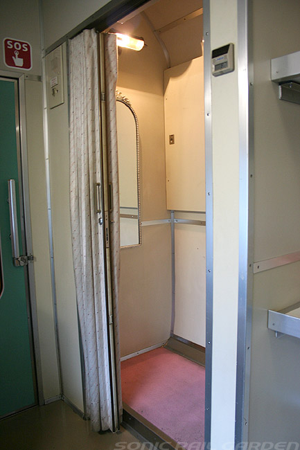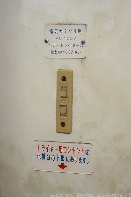 サニタリースペースは全ての車両に完備されていて、いずれも和式個室・洗面台から構成されています。 洗面台は、登場当時の3台から2台へと改造され、1台あたりの幅が広くなって使い勝手が増しています。 それぞれが大きな壁で完全に仕切られていて、通路との仕切りにカーテンもあります。 給湯温度の調節ダイヤルも付いていて、温めのお湯ならわりと給湯され、ダイヤル最大にするとそこそこ熱めにもなります。 カガミ下のコンセントは電気シェーバー用。一部の洗面台にはシンク下部にドライヤー用の大容量コンセントも備えています。 トイレは和式仕様となっていて、リニューアルの手が加えられていますが、やはり昔ながらの設備といった感は拭えません。 デッキは、車内の空間を客室に多く割いたためか、かなり狭め。 折り戸の乗降ドアも昔ながらの姿のままで懐かしく、手前に折れるためにデッキステップの一部が切り抜かれています。 喫煙車の設定がありますが、基本的に客室内では禁煙。デッキのみでの喫煙が可能となっていて灰皿が設置されています。 「シュプール号」向けに改造された編成は、一部デッキに飲料の自動販売機が置いてありますが、現在は全機が営業停止。 「きたぐに」号では車内販売などもありませんので、乗車前に飲料・食料は調達しておく必要があります。 |