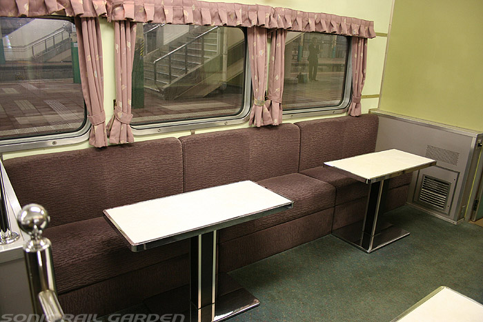 大阪方の1〜4号車は普通車自由席。 583系の昼行仕様のボックスシートを展開して、夜行列車の座席車両として使用しています。 元々が「特急車両」として開発された583系。そのためボックスシートといってもそれなりの居住性が保たれています。 座席面のクッションは若干ビョンビョンとハネる嫌いもありますが、そこそこの柔らかさと座り心地。 座席間ピッチも1,900mmとなっていて、けっこう広いなと感じます。 (もっとも1人で座ったときの感想で、大人4人で座って一晩を向き合って過ごすのはかなりキツいかと。) 窓下にテーブルがあるほかに、通路側席にもサイド部分からの引き出し式テーブルが設置されています。 ほんとに小さなテーブルでちょっとした「小物置き」程度の大きさ。ペットボトルくらいなら置いておくことができます。 自由席では夜間の減光は行われず、一晩中煌々と天井の蛍光灯が点灯した状態で走り続けます。 |