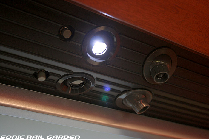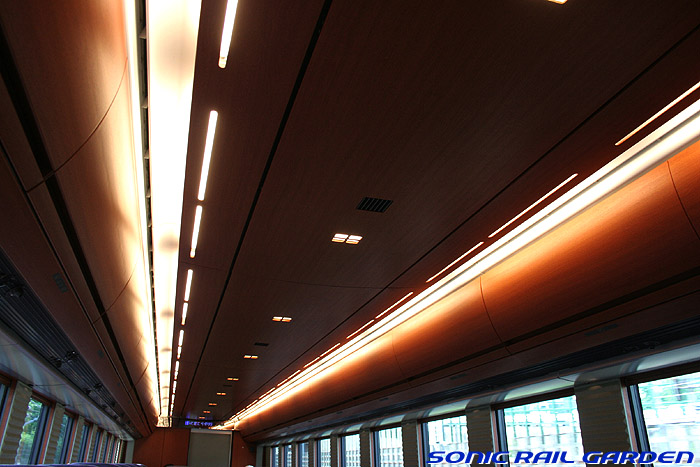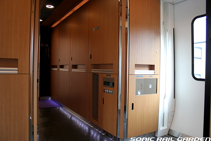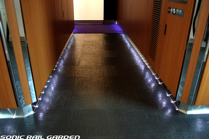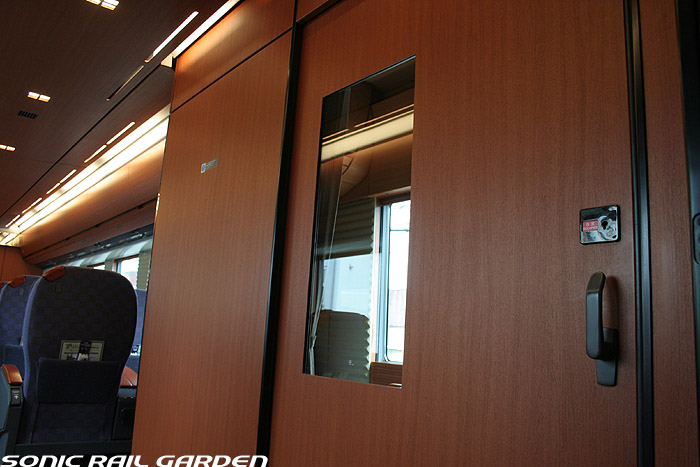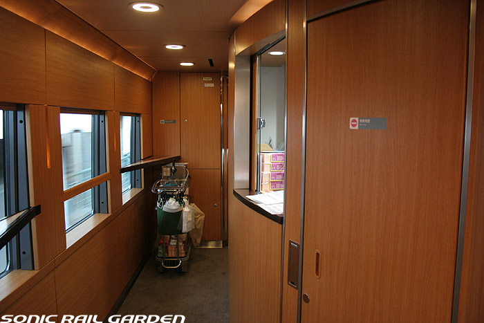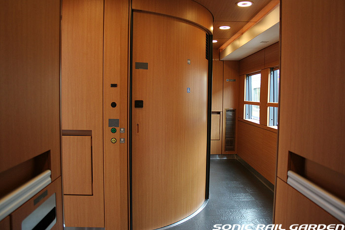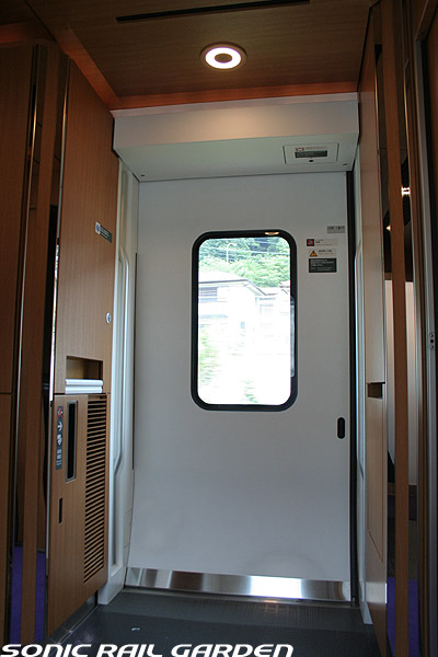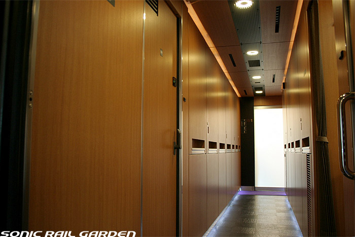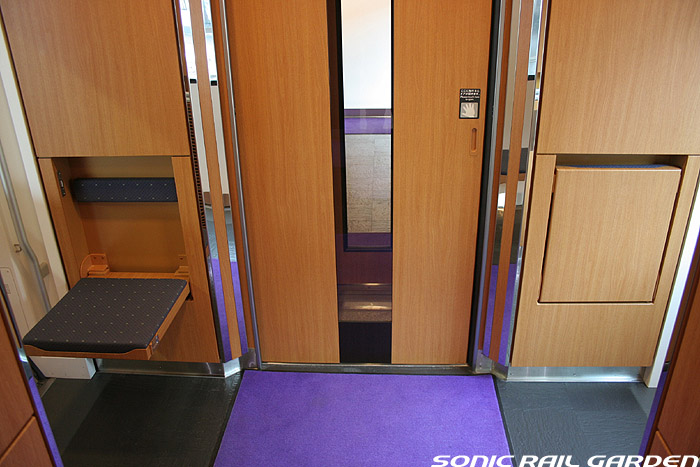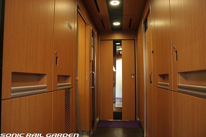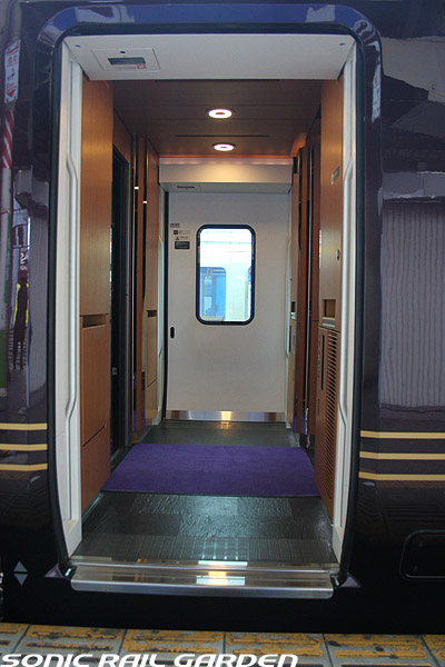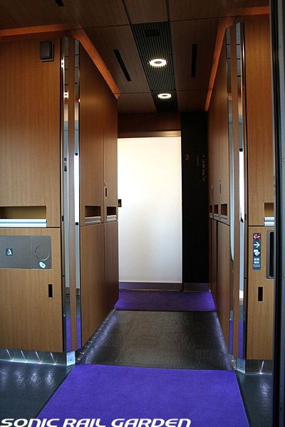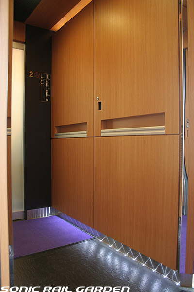 デッキと客室アプローチ部分にはパープルの絨毯が敷かれていて、ここから豪華な旅の始まりを感じさせます。 足元にはLEDの間接照明が、アルミパネルの照明効果でまるでクリスタルが光っているような明かりが灯ります。 デッキと客室との仕切りドアは、全てタッチセンサー式。全ての通路部分には手摺りが設置されています。 1号車を除くすべてのデッキにはジャンプシートが設置されていて、要人輸送の際の警備員配置場所と思われます。 デッキには、やたらと長いアプローチが多いことに気がつきますが、非電化区間を行く際のサービス電源や、 万が一の時のためのバックアップ用機器の二重系システムが格納された機器室となっているためです。 |