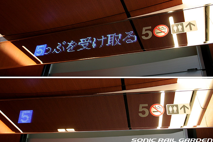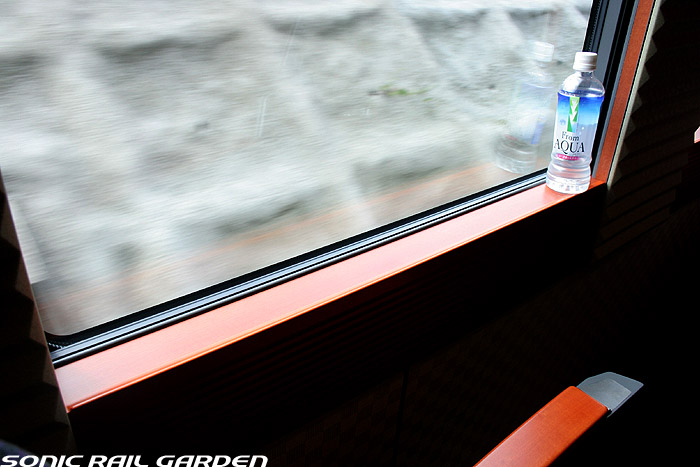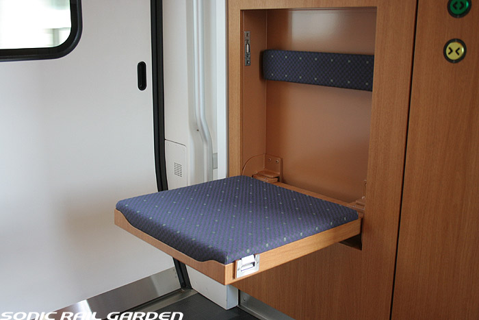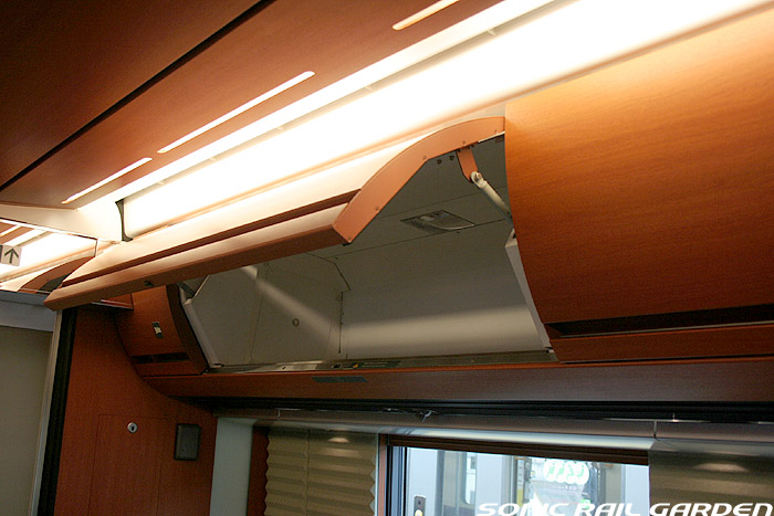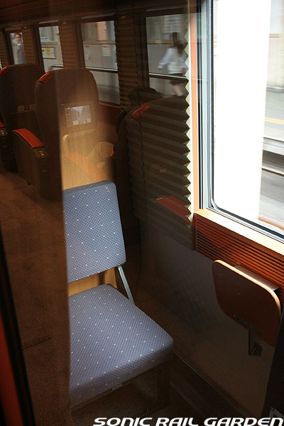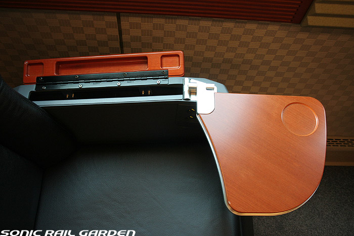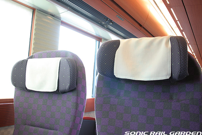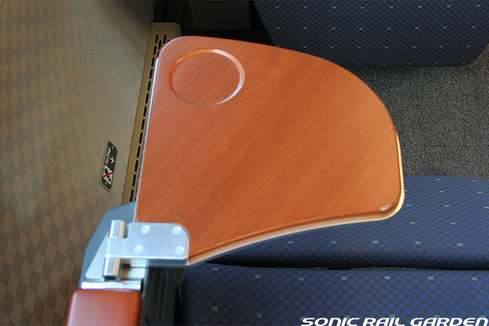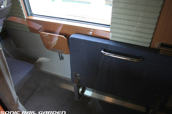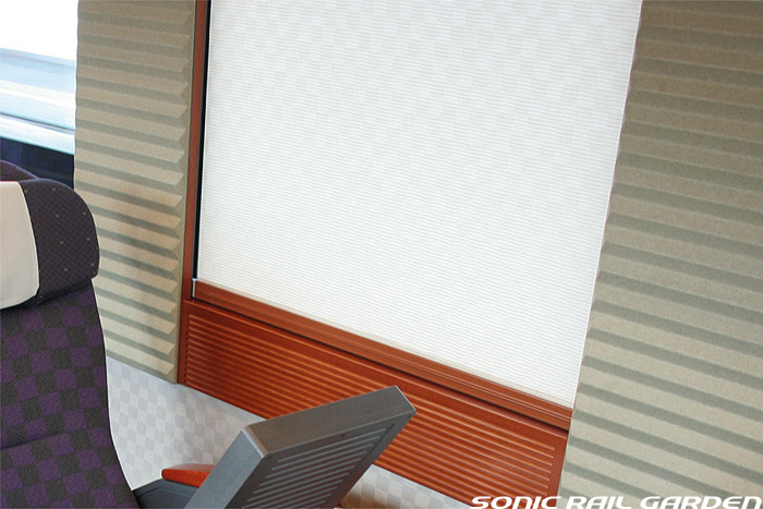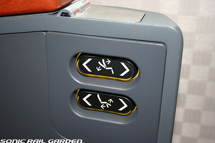 1号車(クモロE654-101)・2号車(モロE655-201)・4号車(モロE655-101)・5号車(クロE654-101)は「ハイグレード・グリーン車」。 「なごみ」ではこの4両が一般車ということになりますが、さすが「ハイグレード車両」を謳うだけの設備を誇ります。 全車両が2+1の3アブレストで、シートピッチは特急グリーン席の標準ピッチの1,160mm。 座席の表面は、和装を意識した市松模様の布織物が全面に張られています。 窓下の化粧板はプラスチックではなく布素材と思われるものが張られていて、ここも細かい市松模様が入れられています。 窓間には鎧戸を思わせる飾りがあり、上下式のロールカーテンは障子のように明るい透明感を持っています。 このように、全体的に「和室」「和装」のイメージに重点を置いた仕上げとなっていますが、重々しさはなく好印象。 外国人が好みそうな派手な日本の装いに傾くこともなく、実にしっとりとした雰囲気となっています。 着席した時のバランス感は、あの革張りVIP席よりもこちらのほうが落ち着きあるように感じられました。 リクライニング時には座席の後方がチルトしますが、あのN700系グリーン席よりはチルトの落ち込みが浅め。 この座面落ち込みをもうちょっと深くするか、でなければ日本航空のクラスJのようにチルトスライド式の座面であれば、 もっとこの座席は居心地の良いものになったんじゃないかなぁと、思いました。 |