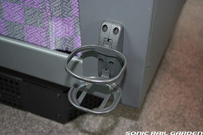 前席の背面の下部にはドリンクホルダー。 | 首都圏の普通グリーン席と同じもので、ちょっと安っぽい感じ。
