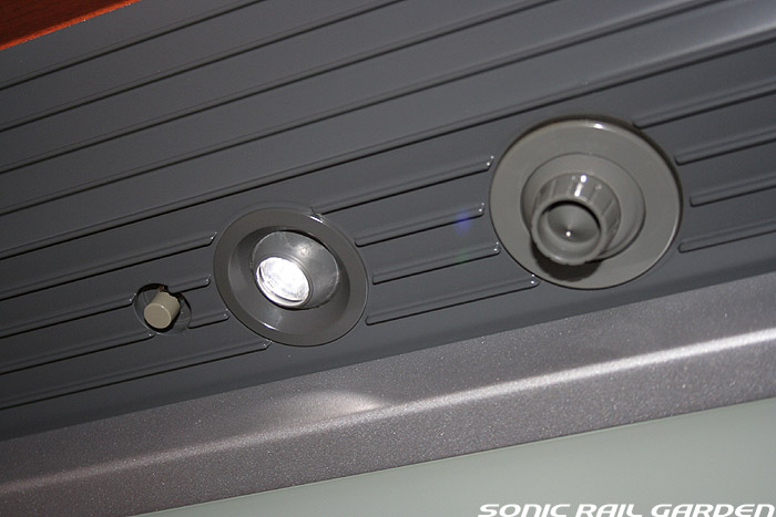 窓上部には読書灯とスポット空調。 | 読書灯のスイッチは手元ではなくこの部分へ手を伸ばす必要がある。 読書灯の照明は白色LEDで、手元はかなり明るく照らされる。