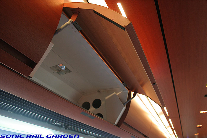 荷物棚は旅客機のハットラックタイプ。 | 蓋付きなので、空間がスッキリとして見える。