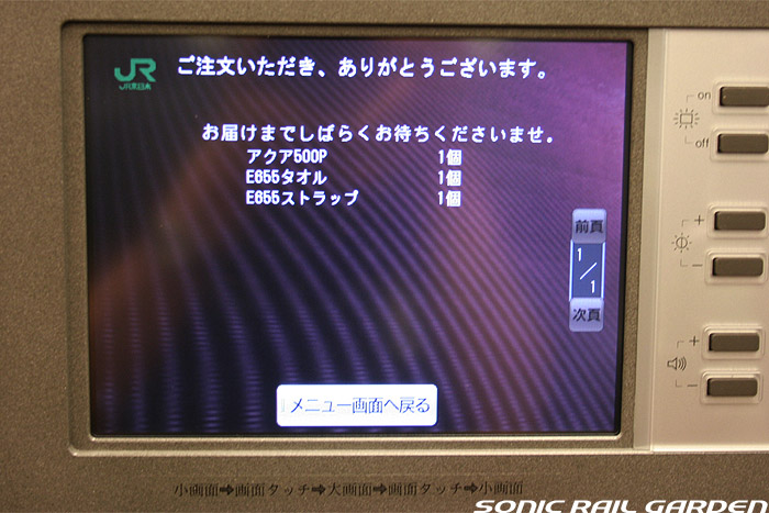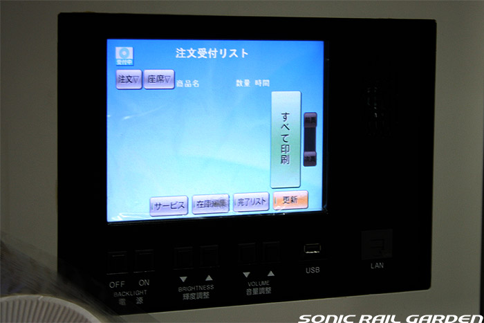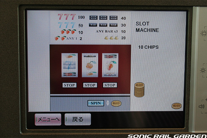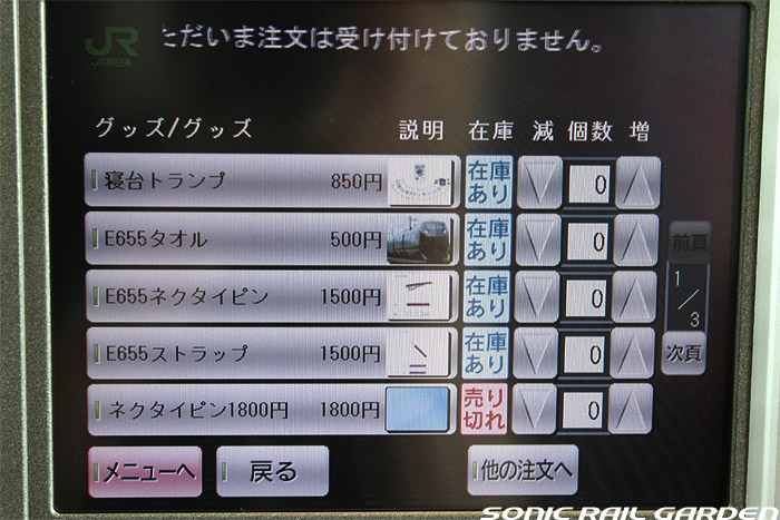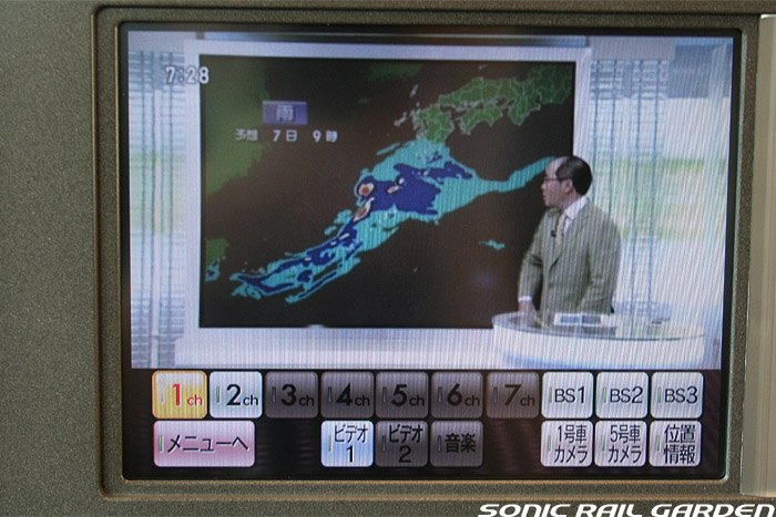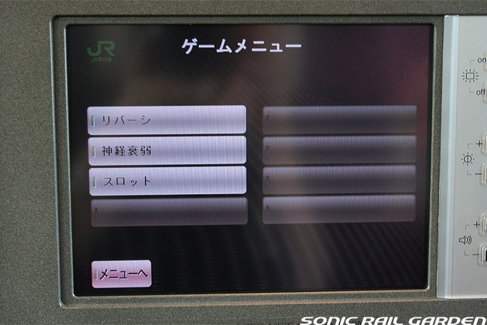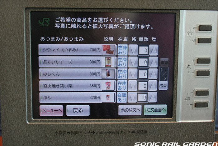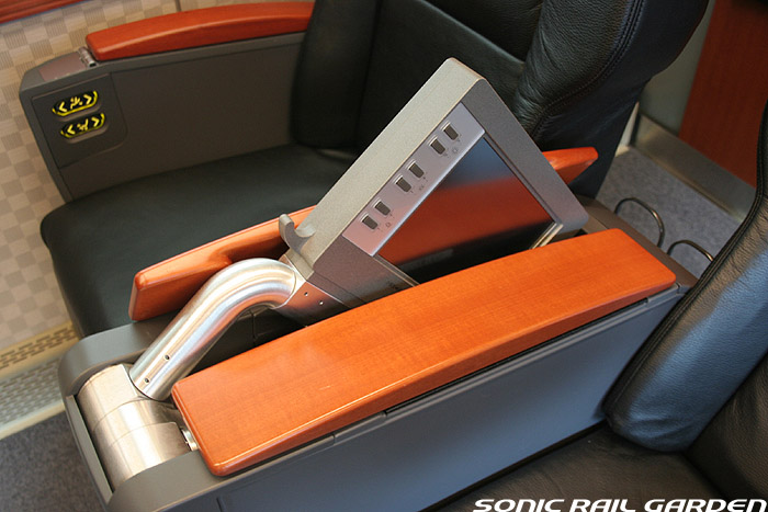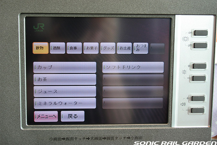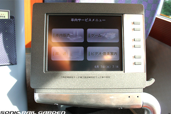 「なごみ」に装着された座席の一番の見どころであり興味をそそるのが、全席に装備されたシートモニター。 画面をタッチすることで操作することができるので、誰にでも簡単に使えるようになっています。 サービスメニューはおおまかに「車内販売」「ゲーム」「オーディオ・ビジュアル放送」の3メニュー。 「車内販売」では、さまざまな商品をモニターに表示される写真を見ながら注文ができます。 在庫があるか、売切れになっているかも画面ですぐ分かるので便利。 商品を決定して「注文」ボタンにタッチすると、情報が売店へと送信され、アテンダントさんが商品を席まで届けてくれます。 「オーディオ・ビジュアル放送」は、地上デジタル放送やBS放送、運転台カメラ放映など多彩なチャンネルがあります。 地上デジタル放送は、NHK(1ch)とNHK教育(2ch)、BS放送はBS1・BS2・BS-Hi(BS3)。 「ビデオ1」ではJR東日本を代表する新幹線や特急、リゾート列車やローカル線を紹介するPVが放映されています。 「運転台カメラ」は1号車・5号車が選べ、座席に居ながらにして全面展望と後方展望のどちらも楽しめます。 「位置情報」はGPSによる位置情報が表示され、列車が今どこを走っているのかが一目で分かります。 イヤホンジャックはパネル脇に。その下にはUSBポートがあり、将来なにか広がりのあるITサービスが展開されるかも!? (これらの画像にあるシートモニターは、現在はすべて撤去されています。) |