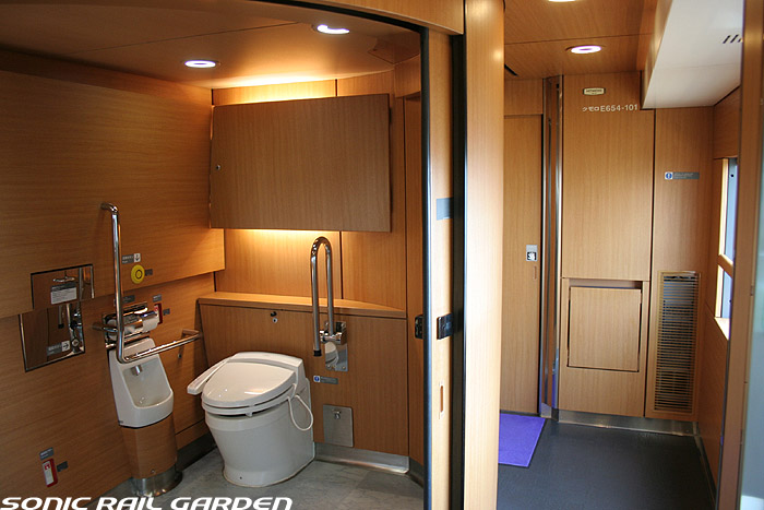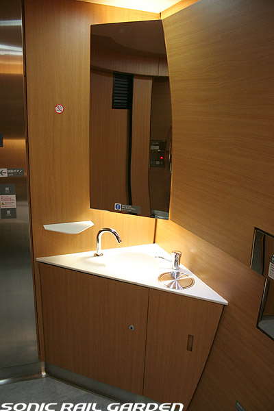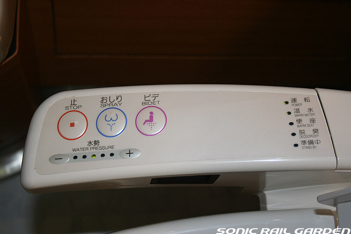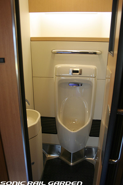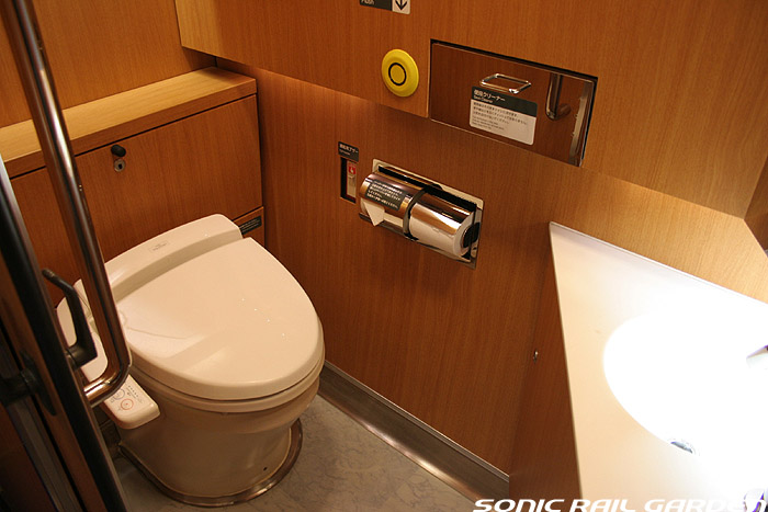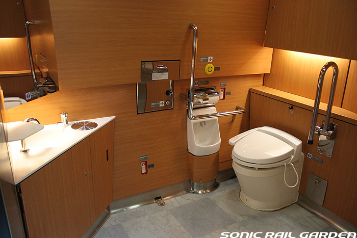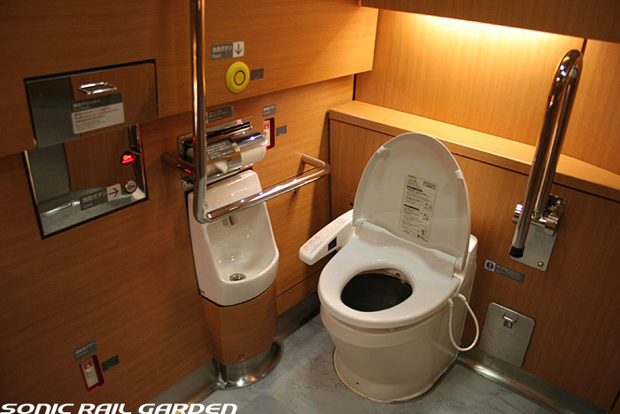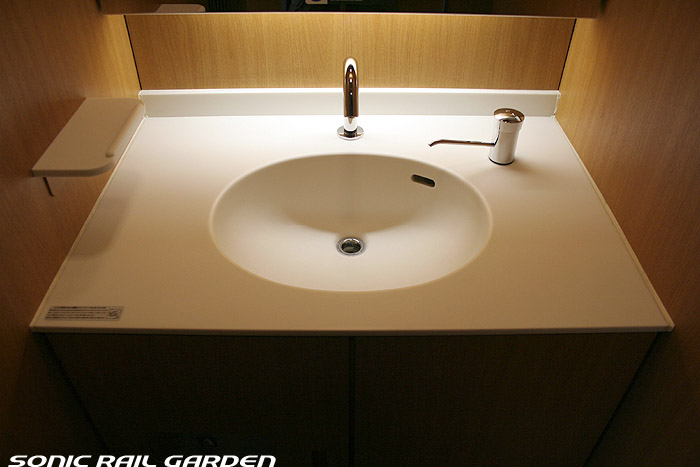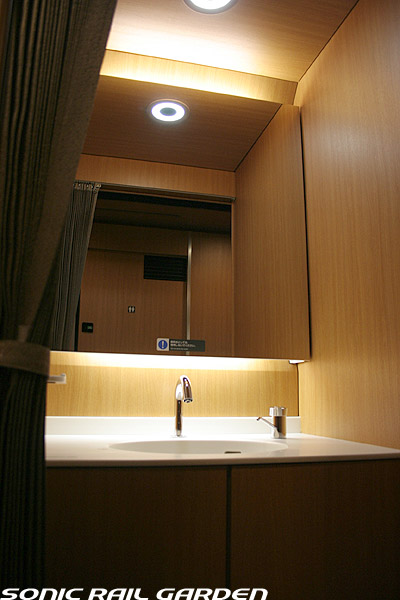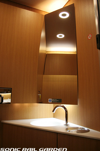 サニタリーコーナーは1号車・2号車・5号車に設置されています。 1・2号車は洗面台・洋式個室・男性用個室で構成されていて、5号車は車椅子対応の大きなマルチ個室。 洋式便座はTOTO製、全てにウォシュレットを標準装備。日本の在来線列車のトイレでは初装備となります。 |
