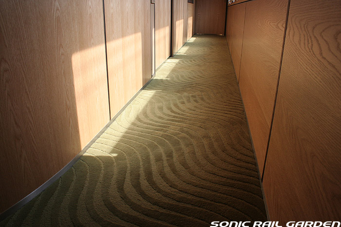 絨毯は波模様を描き、まるで「枯山水」が電車の中に敷かれたかのように見える。 |