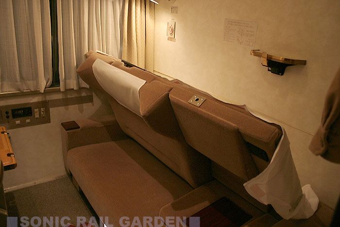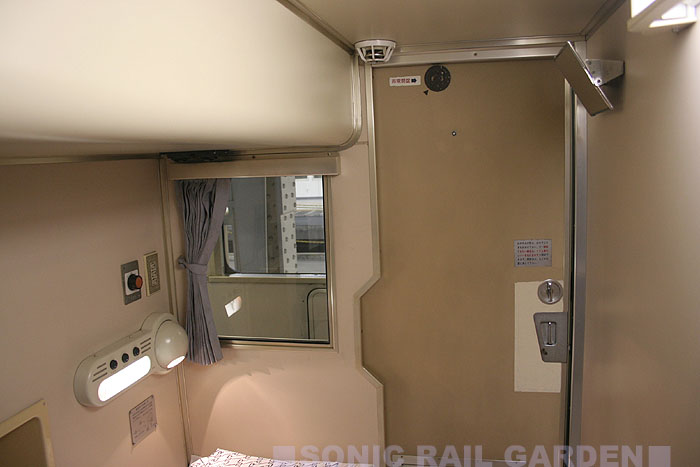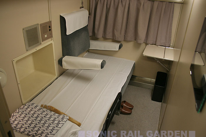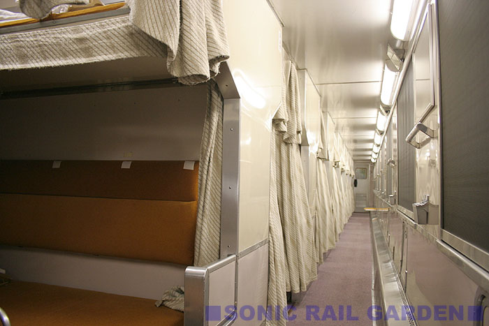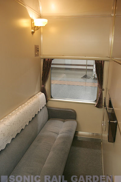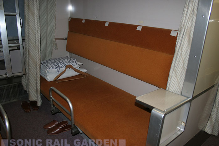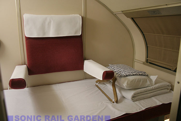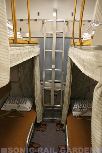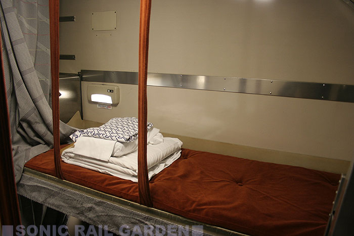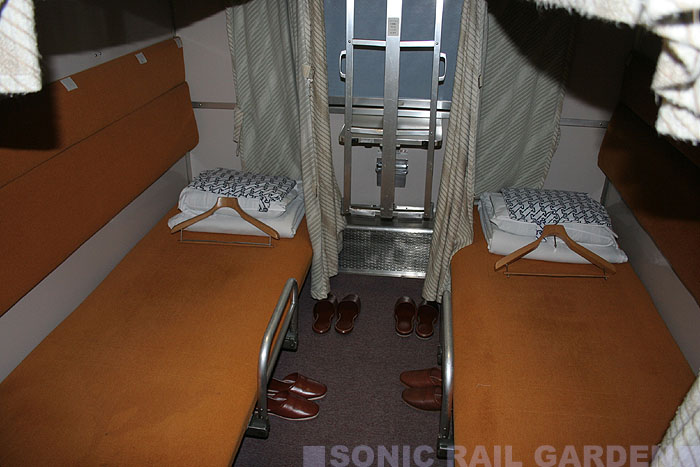 8両編成中、4両が前述の「シングルデラックス」「ソロ」の個室車ですが、残りの4両は昔ながらの開放型B寝台。 寝台はブラウン系のモケットに張り替えられていて、リファインの手が入っていますが・・・ やはり個室車に比べると古めかしさが漂い、「ソロ」と同料金という点でバリューさが皆無に等しいのが実感です。 室内が狭い「ソロ」に比べるとプライバシー感はないものの、空間の広さからくる開放感ではこちらのほうが上。 また、ベッドが向かい合いになっているので、グループ利用ならこの開放型B寝台のほうが利点がありそうです。 デッキ寄りの壁と向き合いになった「2人用区画」は、1・5・8号車の15番上下寝台に設定されています。 (検査などによる車両の入替があった場合はこの限りではありません。あしからず) |