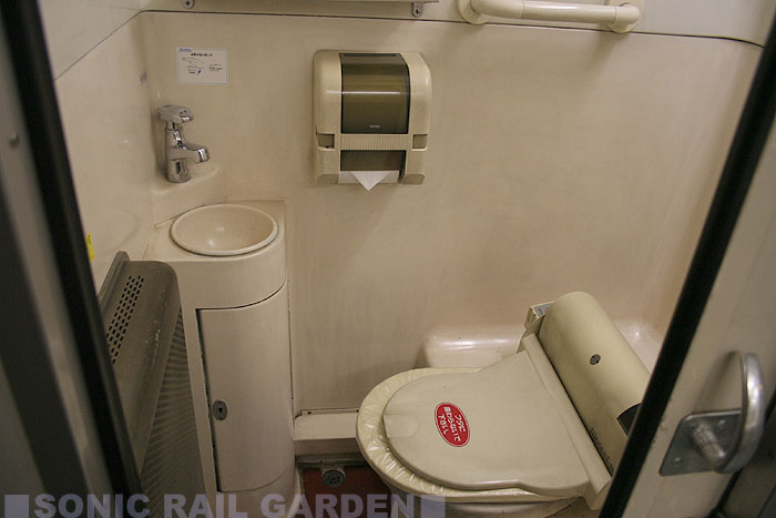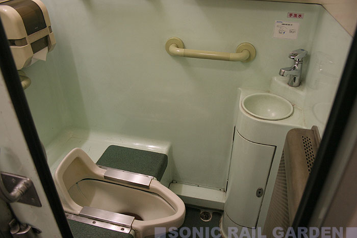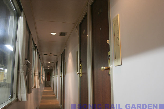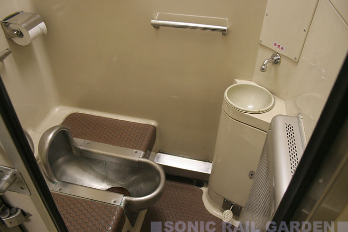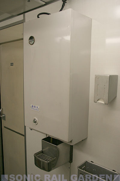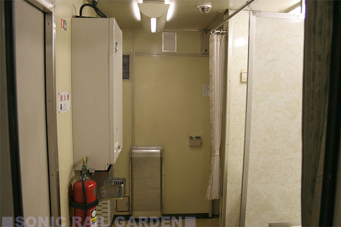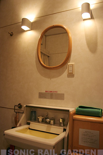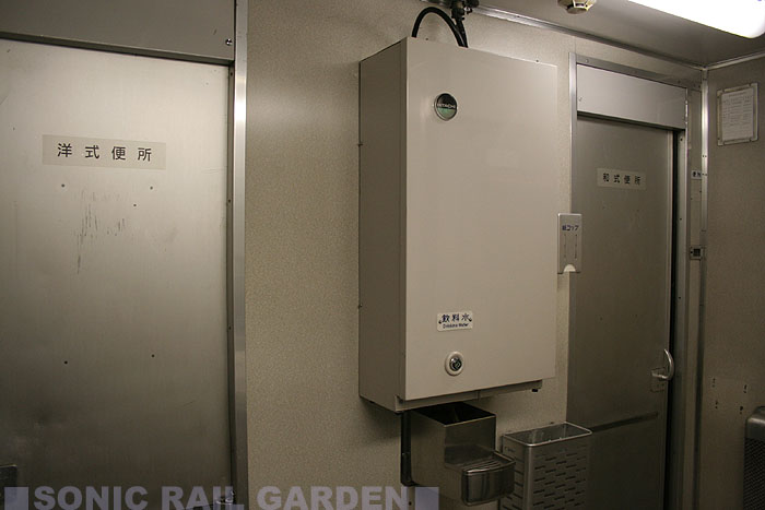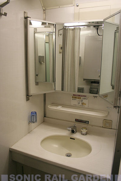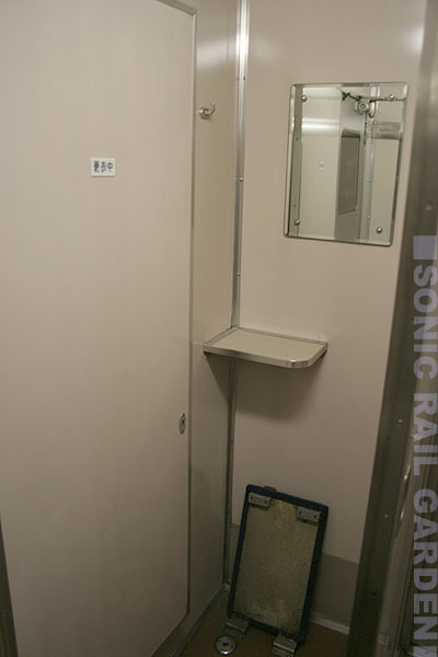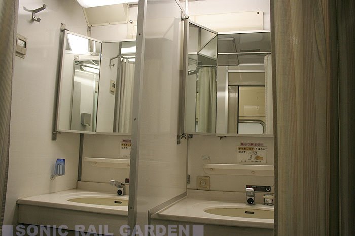 サニタリースペースは、洗面台・トイレ個室ともに改造の手が入ってリファインされたスタイルがほとんどですが、 まだ旧式の古めかしいスタイルを残している車両もあり、編成内で新旧トリドリの“品揃え”となっています。 3号車A寝台個室車のデッキにはドリンクの自販機があります。7号車のデッキには更衣室が1室設置されています。 |