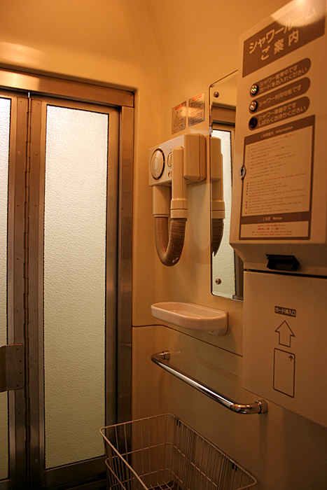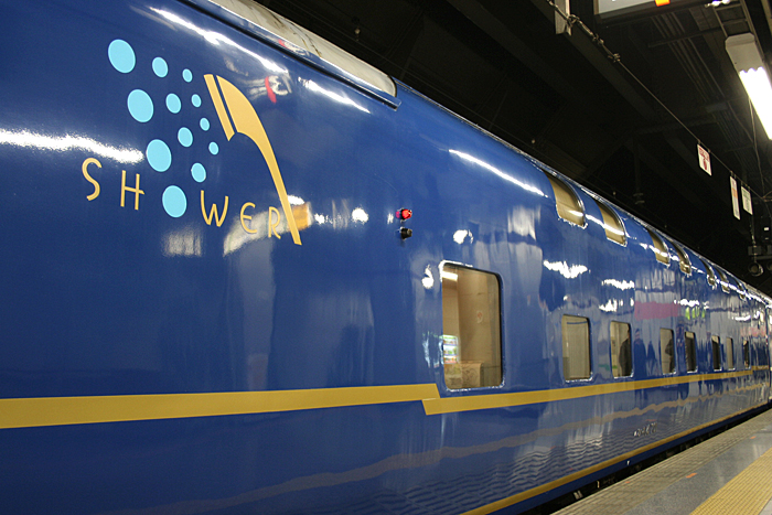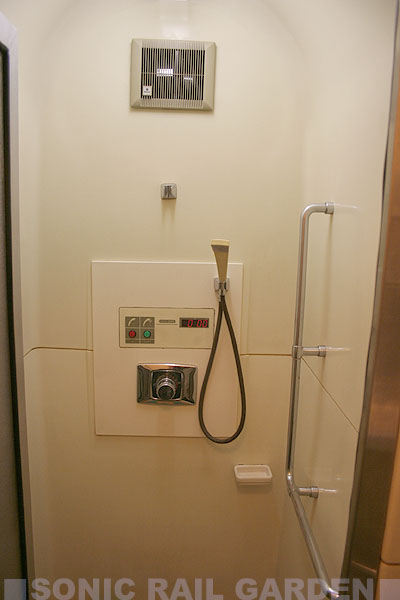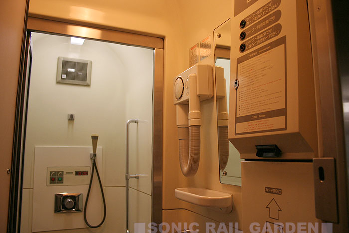 2号車にはシャワーコーナーがありますが、そのシャワーコーナーと個室の間に小さなロビースペースがあります。 3〜4人掛けの長ソファーが隙間を埋めるようにドン!と置かれているだけで、 一晩の旅路の気分転換のためのフリースペースというより、シャワーの順番待ちのためのスペースといった風情です。 ロビースペースの隣りには、全乗客が使える「パブリックシャワーブース」が2部屋あります。 車掌さんから1枚310円でシャワーカードを購入すると、1回で6分の給湯時間でシャワーを浴びることができます。 脱衣室にはドライヤー・カガミ・脱衣カゴがあります。ドライヤーは無料ですが、あまり風量が強くありません。 シャワーカードは枚数限定なので、シャワーを使いたい時は早めに車掌さんから購入しておきましょう。 また、タオルやシャンプーなどがセットになったシャワーセットも個数限定で車掌さんから購入できます。 |