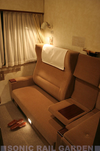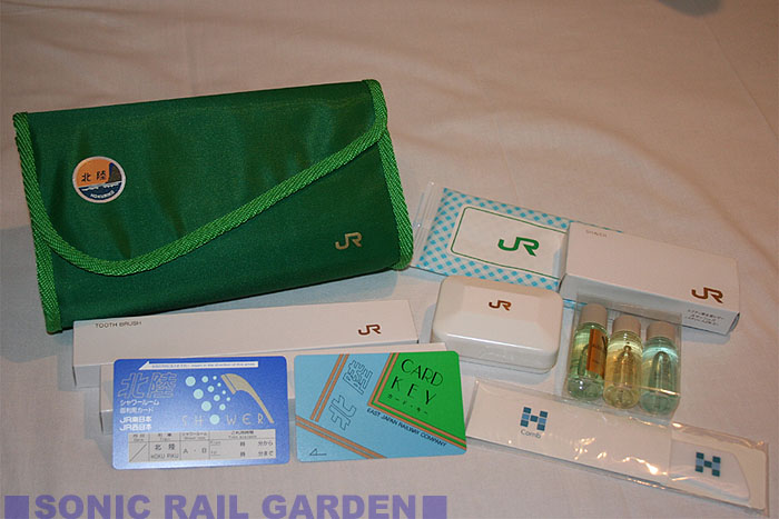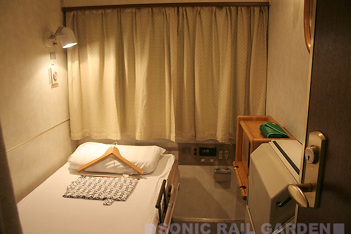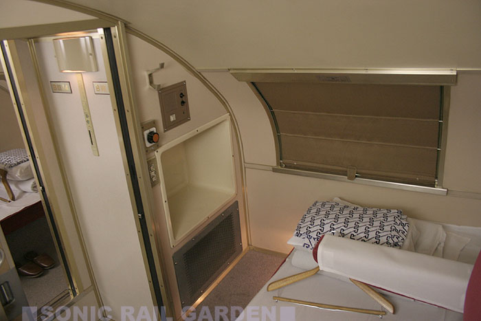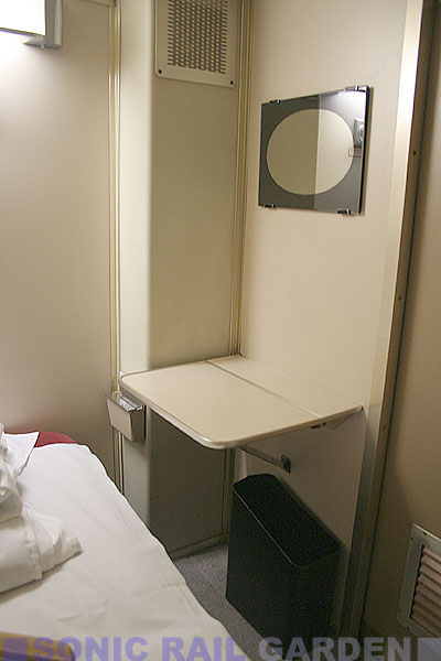 「北陸」号の3号車に連結される個室車は1人用A寝台個室「シングルデラックス」。全11室の設定です。 JR化2年目の1988年、まだJR各社が前途洋々の未来へ走り出した頃に登場したこの個室車。 JR東日本ではこの1年前に寝台特急「北斗星」をデビューさせているだけあって、個室内は豪華でキッチリした作り。 ベッドの幅は80cmで「ロイヤル」と同じサイズ。収納式の洗面台、AVモニターによる映画放映と室内BGMサービスを完備。 この個室レイアウトは、のちにJR西日本の「あさかぜ」号・「あかつき」号の「シングルDX」へと発展していきます。 テーブルはAVモニタの下から引き出すのですが、大きく広がるテーブルではないので使い勝手は良くありません。 ビジネス利用が多い列車なので、「パソコンを持ち込んで車内で一仕事」なんて利用者も少なくないとは思いますが、 このテーブルではパソコンどころか書類をちょっと置くだけでも無理があります。 ちなみに、コンセントは洗面台の上部(カガミの脇)に、なんと2つ口も用意されています。JR東日本さん、太っ腹! ほかには、洗面台の脇にスーツのホコリ落しと靴磨き用のブラシと靴べらが装備されています。 この個室の大きな特徴は、ベッドがソファーに早変わりする“変身機能”を備えているという点。 通常「上野」「金沢」発車時点では寝台状態でベッドメイクがなされていますが、 ベッドを壁側へと持ち上げるだけで簡単にソファーになります。 ただ、せっかくの機能ですが「北陸」号は下り上りとも深夜発早朝着の運転なので、 ソファー状態にして室内でのんびり寛ぐほど、時間のゆとりがないのがちょっと残念です。 ドアのロックはカードキー式。「北斗星」同様に持ち帰ることが出来るので、乗車のよい記念になります。 また、この「シングルデラックス」利用者には、歯ブラシやシェーバーなんかがてんこ盛りのアメニティセットがもらえます。 隣の2号車にはシャワー室がありますが、「北陸」のシングルデラックスではシャワーカードの無料配布はありません。 A寝台利用者も車掌さんから購入となります。 個室のベッド(ソファー)は上り向きの部屋と下り向きの2タイプがあり、長岡での方向転換でさらに向きが変わります。 個室番号が奇数の部屋は、下り列車の上野→長岡で正向き・長岡→金沢で逆向き。(上り列車はこの逆)。 個室番号が偶数の部屋は、下り列車の上野→長岡で逆向き・長岡→金沢で正向き。(上り列車はこの逆) |