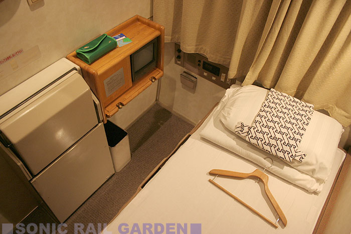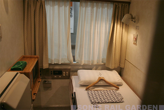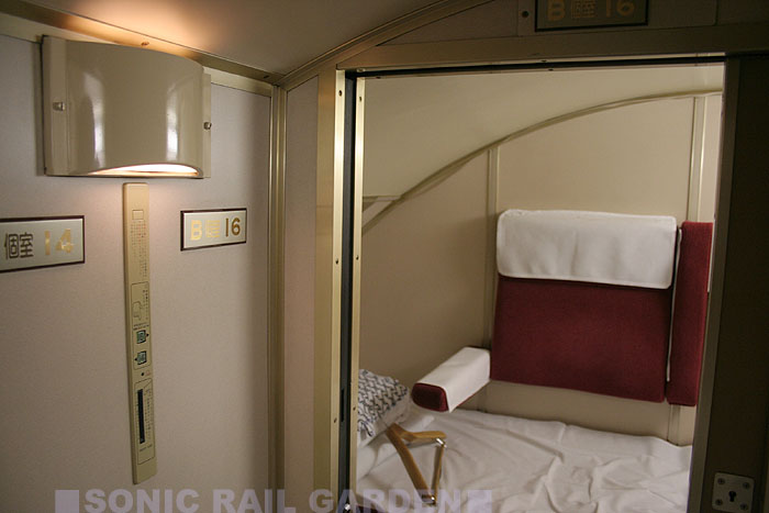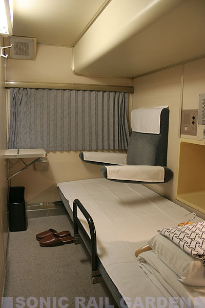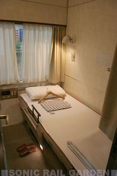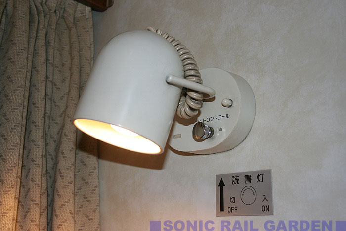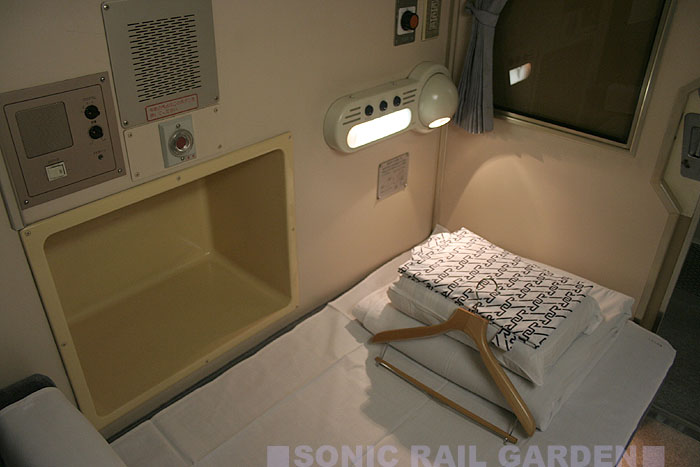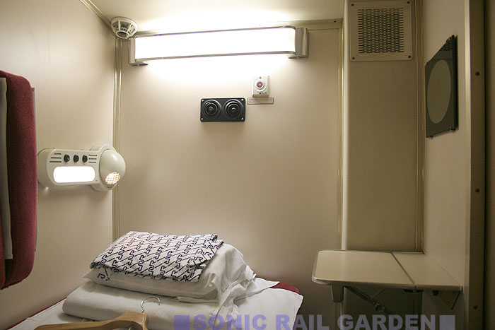 「北陸」号の「ソロ」は、この個室車の前年に登場した「北斗星5・6号」用の「ソロ」がベースとなっています。 上段個室は室内に階段を抱え込まない、上段2室で階段を共有するタイプ。 そのため、室数設定は多めですが室内空間は若干狭めに感じられます。 ベッド幅はスタンダードな70cm。室内BGMシステムを装備し、冷暖房も好みに応じて個別操作が可能。 3つの室内照明も個々にON/OFFが可能で、狭いながらもプライベート空間としては充分。 室内のテーブルは簡単な折りたたみ式ですが、シングルデラックスのテーブルに比べれば使い勝手は良いです。 壁の抜き取り部分には荷物を置く事が出来ますが、大きなキャリーバッグなどの持ち込みは無理があります。 なお、室内にはコンセントがないので携帯電話やパソコンなどの充電はできません。 「北陸」号では、この個室車が投入された1988年3月から前代未聞のサービスが行われていました。 それが「ステイオーバー・チェックアウトサービス」と呼ばれる画期的なサービス。 下り列車の「金沢」着後のみに行われていたもので、「金沢」着が早朝であることから、ビジネスが動き出す時間まで、 基地のある「東金沢」駅へ回送される列車内にそのままステイして寝ていることができるというもの。 車内では車掌さんがモーニングコールをしてくれたり、軽食の販売が行われたりと、まさに「ホテル」感覚。 午前9時まで滞在が可能で、東金沢から金沢までは普通電車に乗って戻ることができたそうです。 残念ながら、思ったほど利用者は定着しなかったようで、1991年6月で取りやめになってしまいました。 |