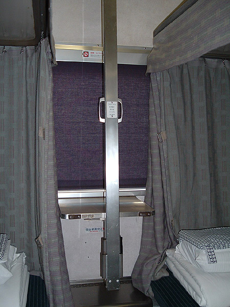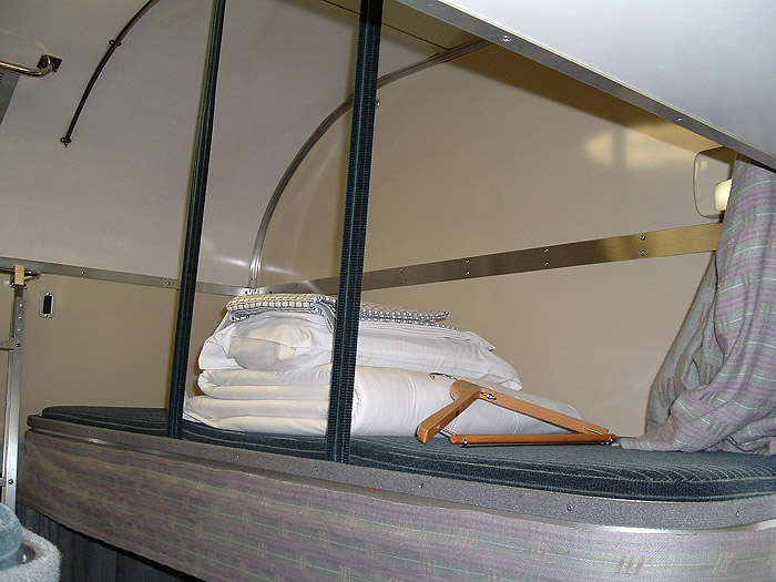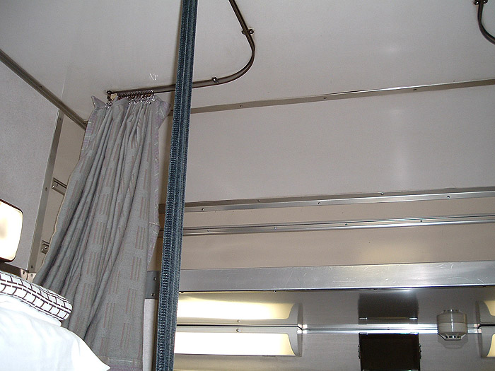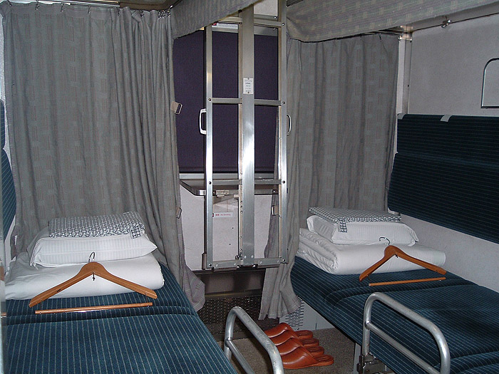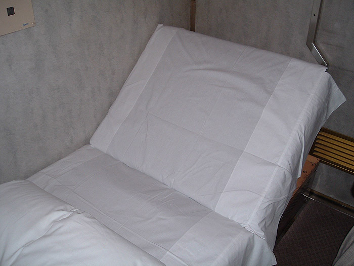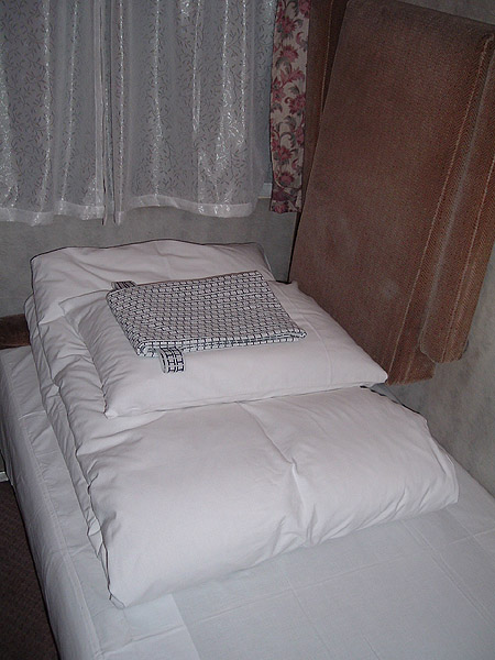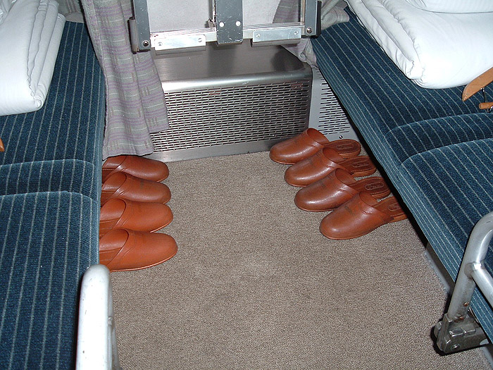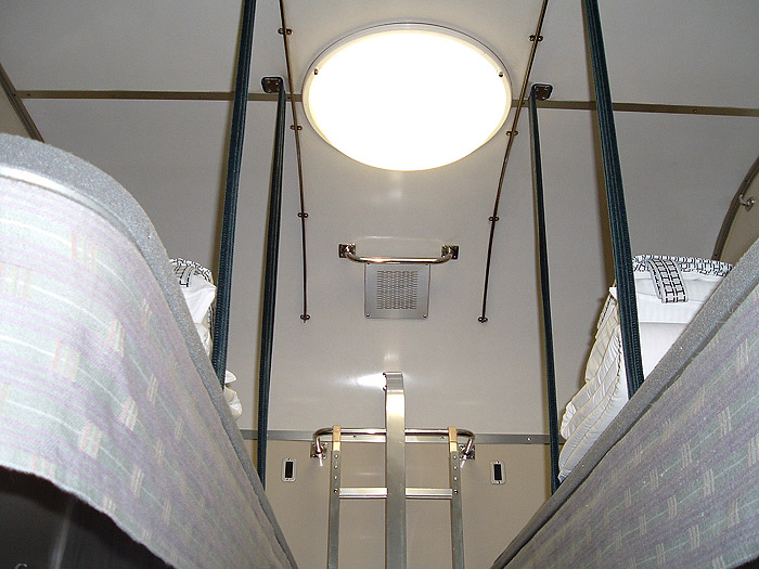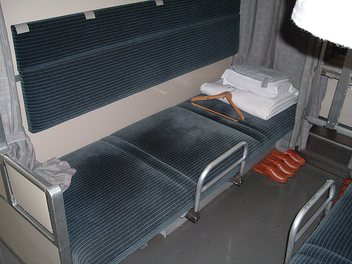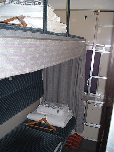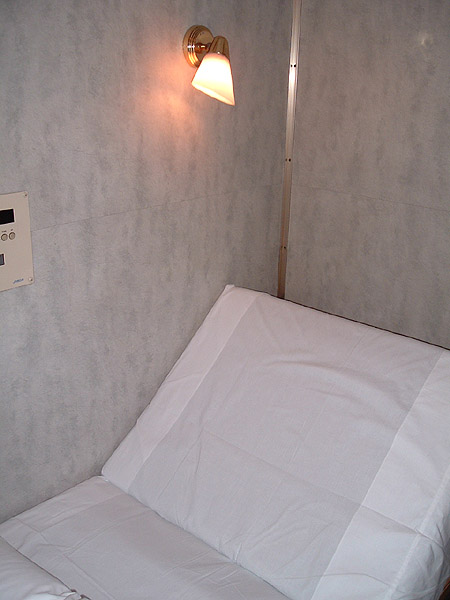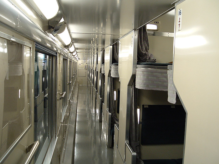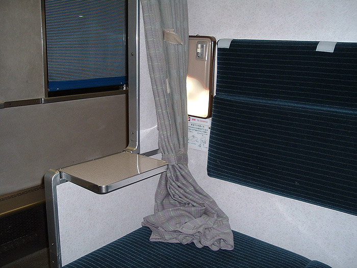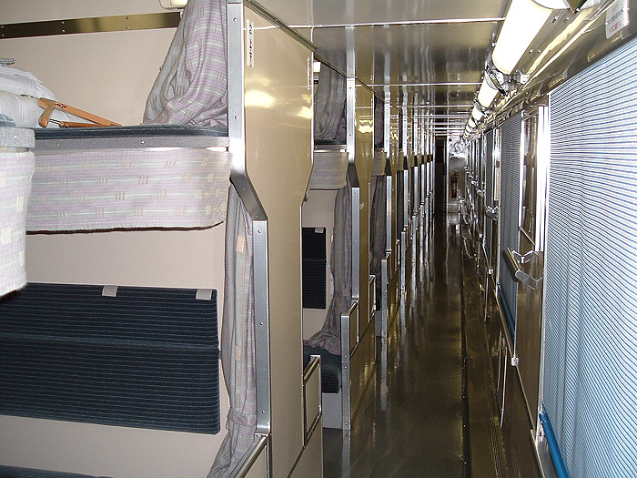 「あさかぜ」号の編成の大半を占めるのが、昔ながらのスタイルの開放型B寝台。 カーテンやモケットのカラーリングはブルー系で、ややもするとそっけない印象なのですが、 全ての寝台がこのカラーリングで統一されています。(JR西日本のコーポレイトカラーがブルーだからか?) ベッド幅も、この24系25型が登場して以来の70cmをキープ。 床面にカーペットを敷いている車輌と、リノリウムのままの車輌が混ざっていますが、 特に後者は化粧板の飾り気が無いのと相俟って、20系客車登場時のようなギラギラ感が萌え萌え(笑) 逆を返すと、室内自体には大幅改造のようなリニューアル工事はされなかったものの、 最後の最後までこれほどまでしっかり手入れがされて美しい状態だったというのは、特筆に価するかもしれません。 |