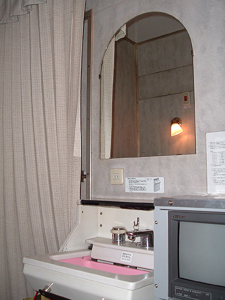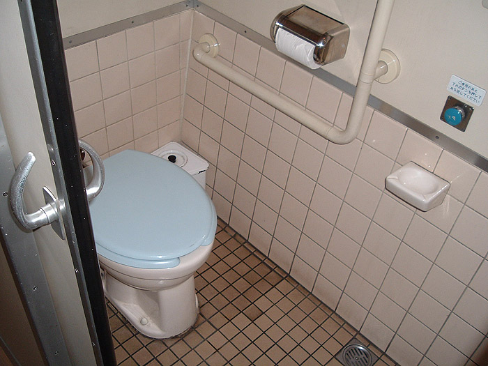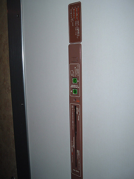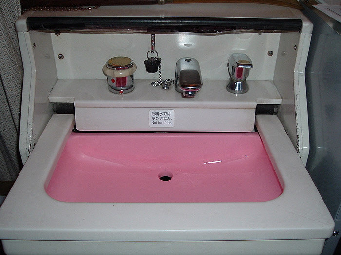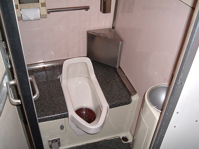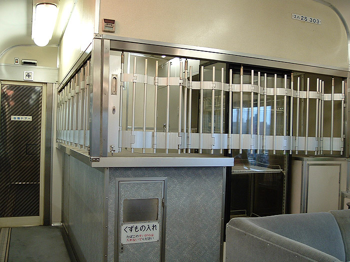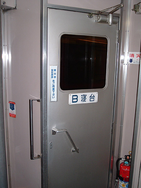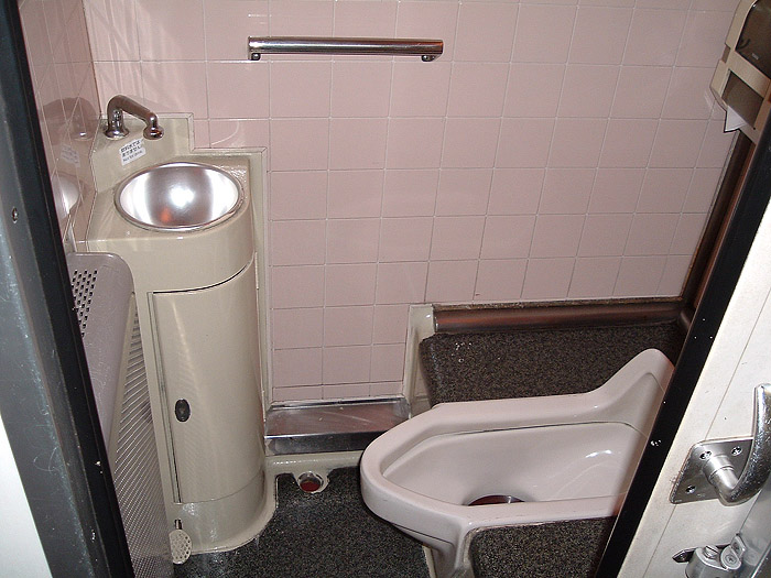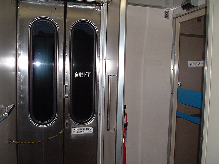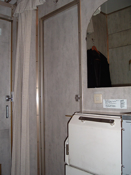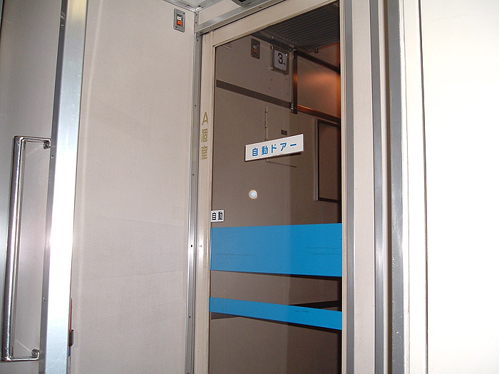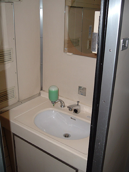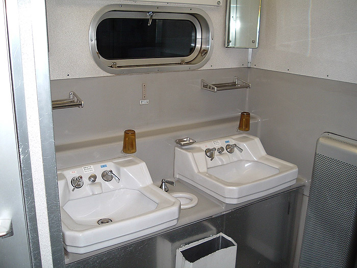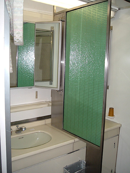 ほとんどのサニタリーコーナーは、「国鉄時代」炸裂の古めかしい雰囲気を色濃く残していました。 ホーロー製の仕切りの無い洗面台にアルミ製の便器。洗面台のスケルトンブラウンのプラ製コップが泣かせます。 サニタリーにリニューアルの手が入った車輌がありましたが、編成内ではごく一部。 A個室車輌のサニタリーは洋式トイレになっていて、洗面台も個室内に設置されていました。 デッキは、こちらも国鉄時代からの寒々とした雰囲気が漂っています。 「A個室車」のデッキ仕切りドアのみが自動ドアになっているほかは、すべて手動のドア。 |