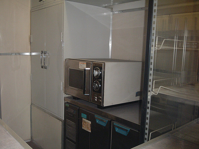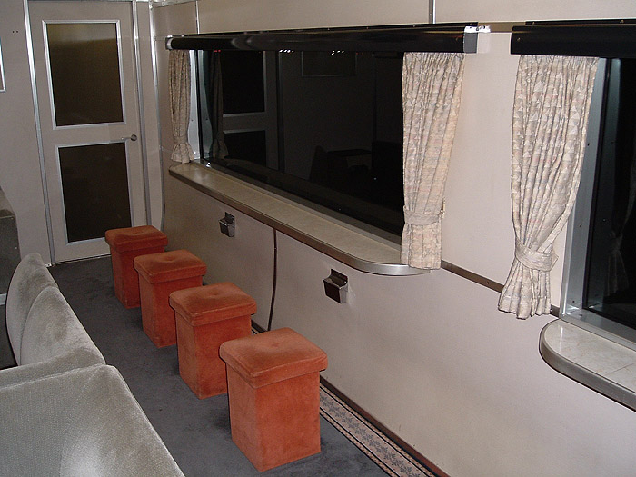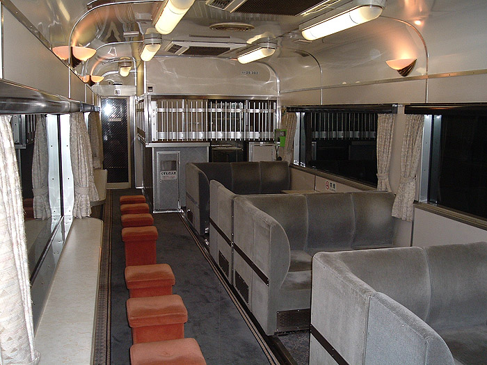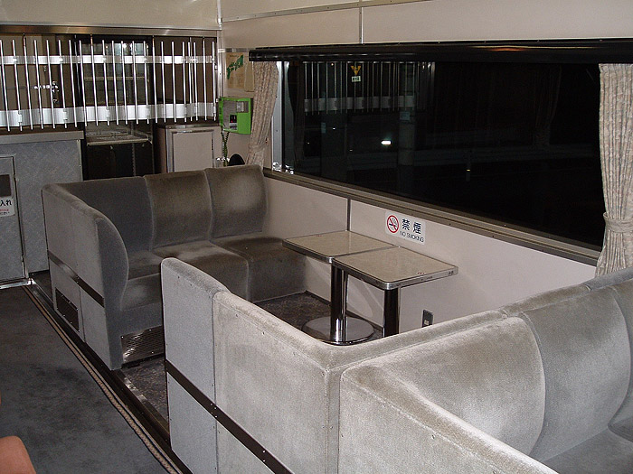 ソファーコーナーと簡単なスツールを備えたフリースペースです。 「ラウンジカー」と称していますがどちらかというと「ロビーカー」という印象。 車内の一角には売店カウンターが設けられていますが、常にシャッターが掛けられた状態で使われたことはなさそう。 中はアイスストッカーに電子レンジと充分な装備なのに勿体無い…。デッキ部分には、飲料の自動販売機があります。 |