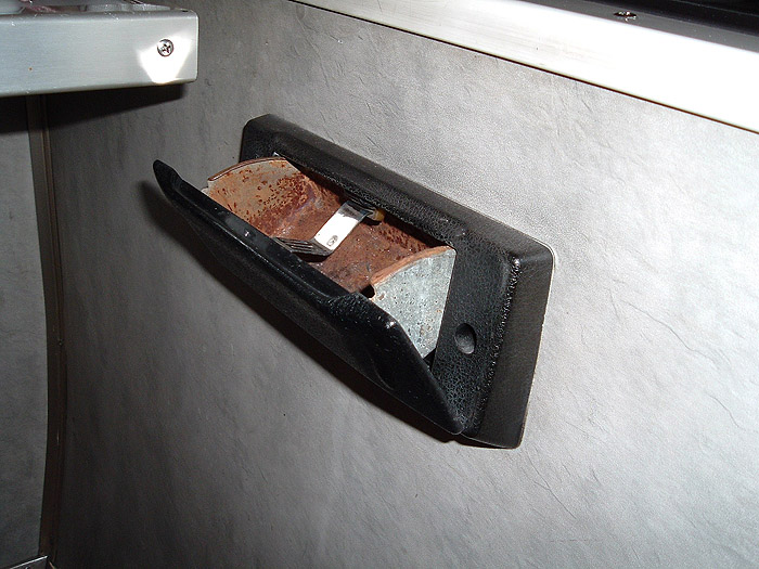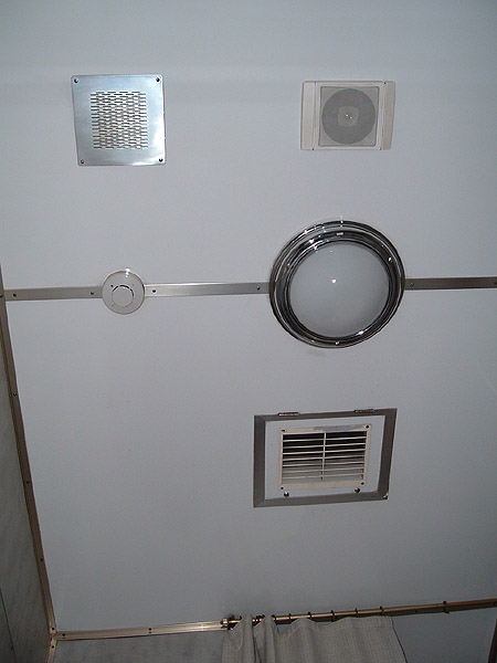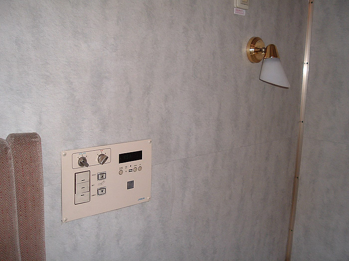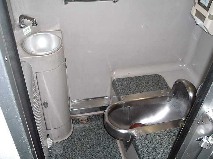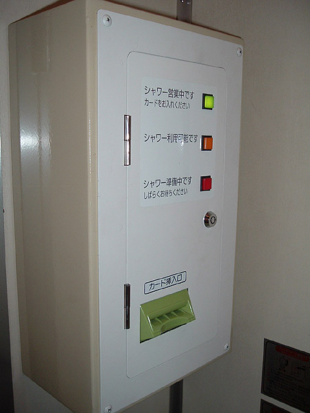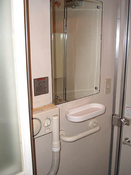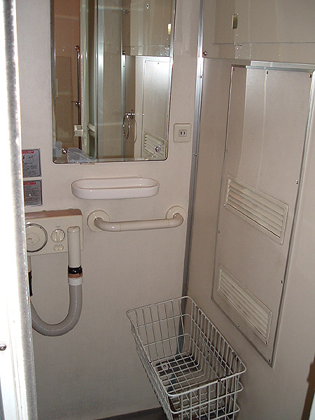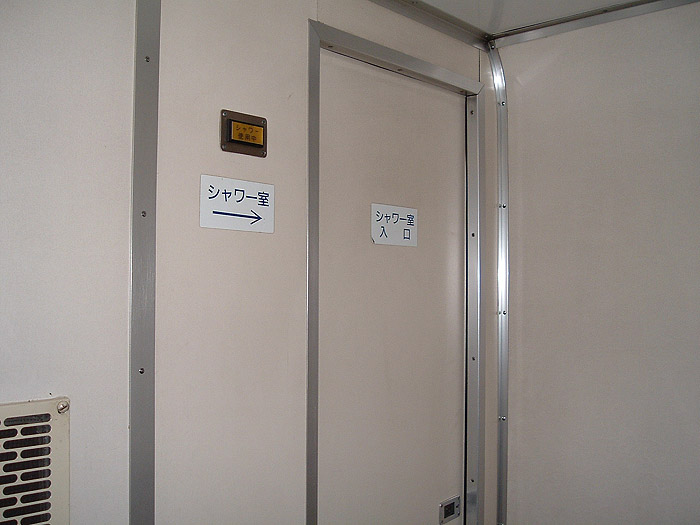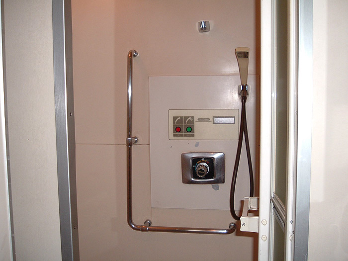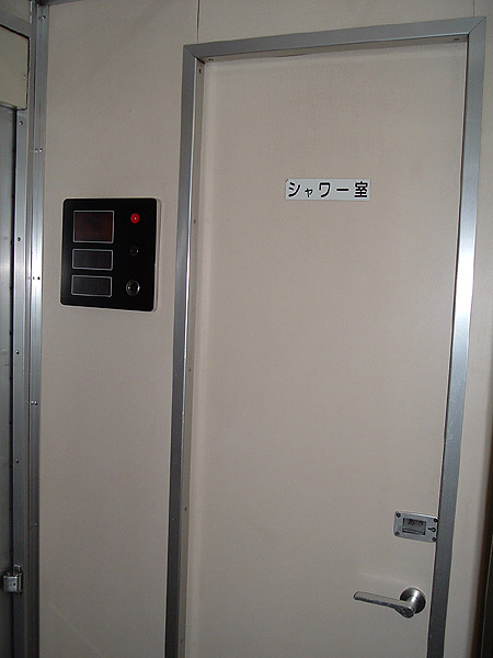 「ラウンジカー」の車端部には共用シャワールームがあります。 給湯時間は1回で6分間。シャワー利用カードは車掌さんが販売しています。利用時間の予約は必要ありません。 晩年のシャワーの設備状態は尋常ではなく、温水の途中で一瞬冷水が出たり、給湯が途切れたりとひどい状態でした。 |