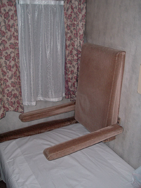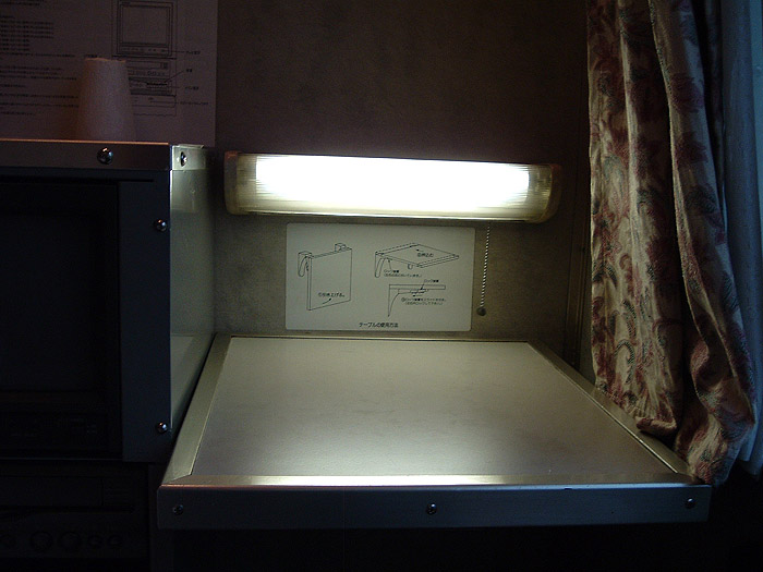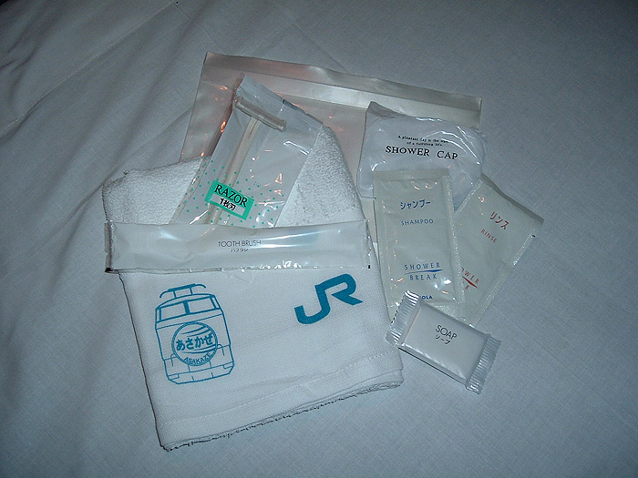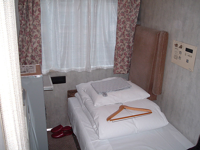 「あさかぜ」といえば20系客車。そして20系客車といえば一人用A寝台個室「ルーメット」でしょうか。 その頃の栄華とプライドを引き継ぐかのように、「あさかぜ」には最後まで一人用A寝台個室が連結されていました。 この「あさかぜ・シングルデラックス」は、一緒に残った東海道ブルトレの僚友たちのそれとは一線を画していて、 他の列車が昔ながらの“独房”スタイル(笑)を保っているのに対し、「あさかぜ」は全面的な改造が施されていて、 ほぼ「新製車」といっても過言ではないほどの車輌になっています。 ほかの「シングルデラックス」のベッド幅が70cmなのに対して、「あさかぜ」ではベッド幅80cm。 さらにこのベッド、通路側3分の1が電動リクライニングのように起き上がる機能を備えていて、 寝ながらに上半身を起こすような体勢でリラックスできます。 下り「あさかぜ」では午前中、上り「あさかぜ」では夕方〜夜にかけての走行時間が長く、 意外と車内で起きている時間が長いので、個室内でのんびり読書などをして過ごすには打ってつけの機能です。 ちなみに壁面の読書灯は、このベッドを起こした状態で本を読むのに適した位置にセットされています。 室内にはほかに折り畳み式の洗面台とビデオ再生機能を持ったAVモニターに、オーディオチューナーを備えています。 AVモニターでは月イチのプログラム改編で、映画と複数の音楽チャンネルが流れていました。 VHSビデオデッキもあって、手持ちのビデオが再生可能です。ビデオ端子付きなのでビデオカメラからの再生もOK。 (普段から旅行者がビデオソフトを持ち歩いているのか?という疑問はさておき(笑)) 中にはビデオデッキではなく、「テレビデオ」を設置している車輌もありました。 オーディオチューナーは一般家庭用のケーブルテレビチューナーと同型です。汎用性がある機械なんですねぇ。 洗面台の脇にはコネクトドアがあり、2部屋つなげてコネクトツインとする事もできます。 これは両部屋のロックを外さないと扉が開きませんので、隣の部屋から勝手な侵入をされるということはありません。 ちなみにこの個室はテーマカラーが2種類あり、奇数番号の部屋はブルー&グリーンで寒色系。 偶数番号の部屋はピンク&ベージュの暖色系になっています。 この車輌の車端部にはA個室利用者専用の「シャワー室」が備えられています。 車内改札時にシャワーカードが1枚手渡され、1回の乗車でシャワーが1回無料で利用できます。 シャワーの給湯時間は、ほかの寝台特急のシャワー室と同様に6分間。 またアメニティポーチもプレゼントされ、中には洗面用具がギッシリ詰まっています。 |