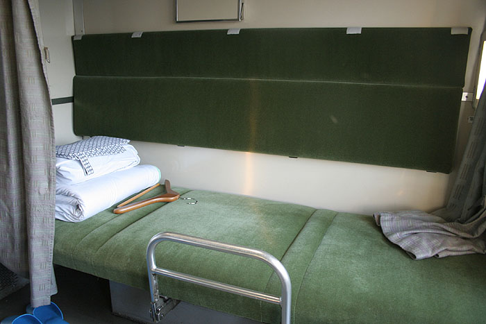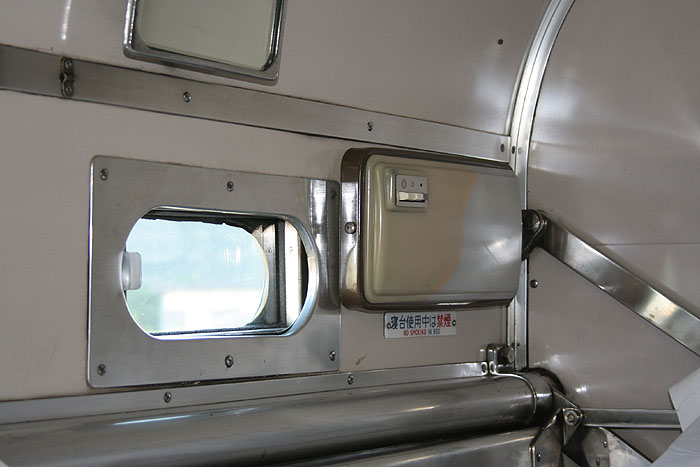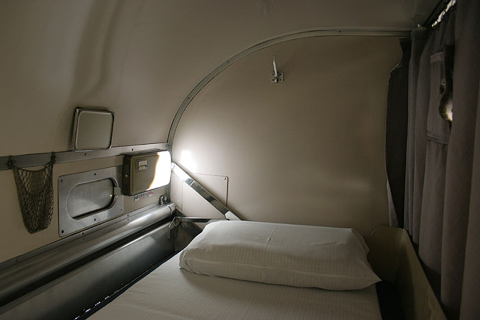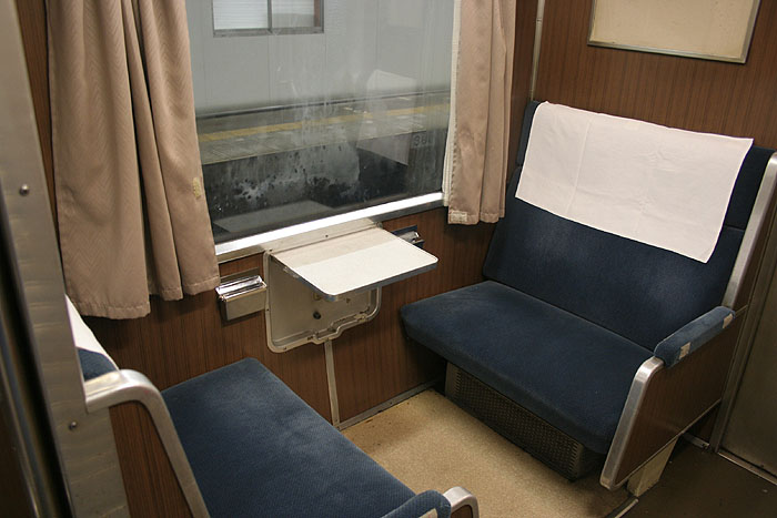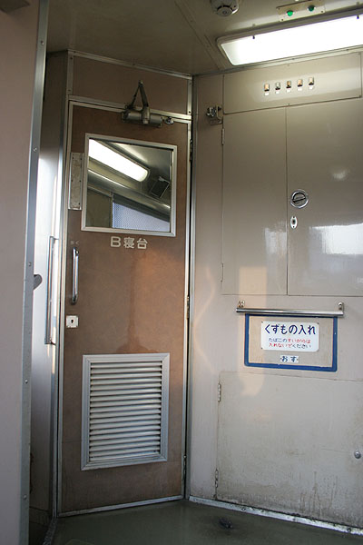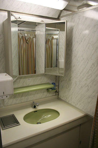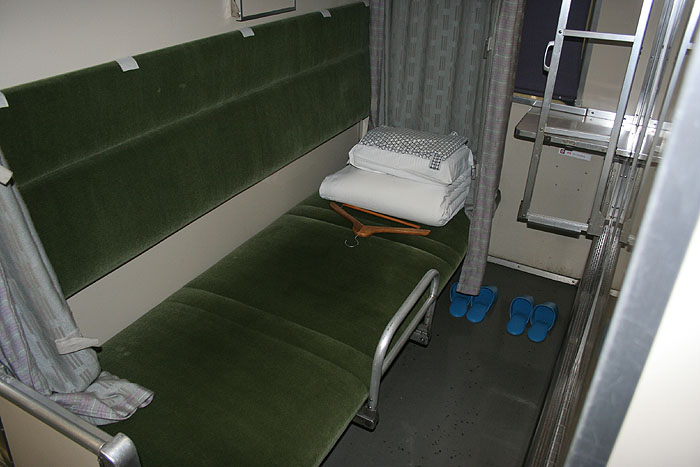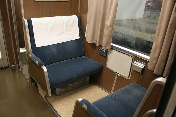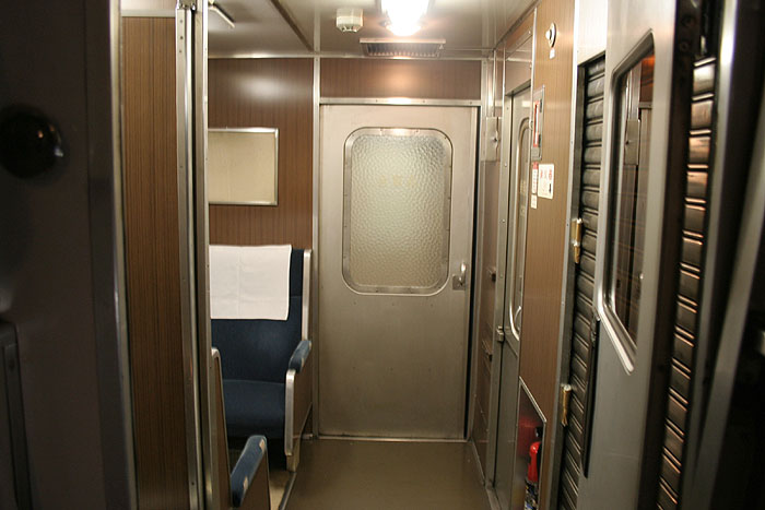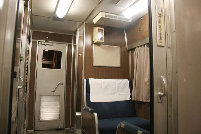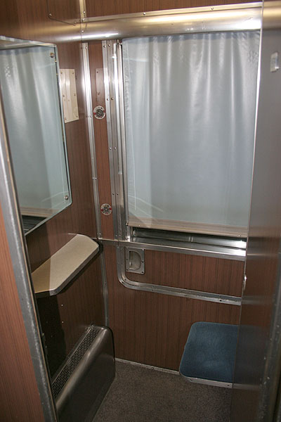 A寝台客室はデッキと直結ではなく、このような小部屋を介して客室が設定されています。 この空間には車掌室のほか、ボックスシート1区画と更衣室1室。 A寝台客室内は完全禁煙なので、このスペースが喫煙コーナーとなっています。 寝る前に一服・・・という乗客はもちろん、なかなか寝付けない人の息抜きの場としてけっこう使われています。 ただ、アルコール飲料を持ち込んで宴会を開くのだけは止めましょう。すぐ隣りは寝台客室です。 更衣室には大きな姿見と小物置き、収納式のミニ・スツールがあり、もちろんドアの内側から鍵をかけられます。 床面はカーペット敷きではなく、廊下と同じリノリウム。靴を脱いで着替えるのはちょっと抵抗がありますね。。。 ちなみに、シャッターが下りている区画は、大型バゲージを預けられる荷物室となっているそうです。 |