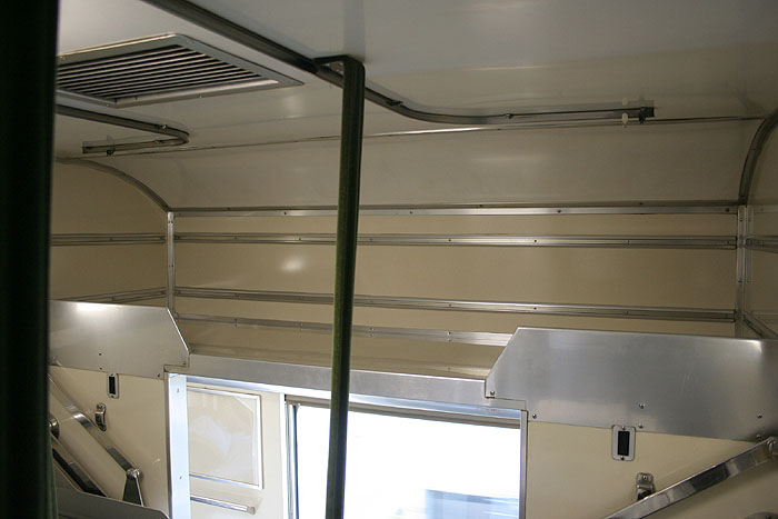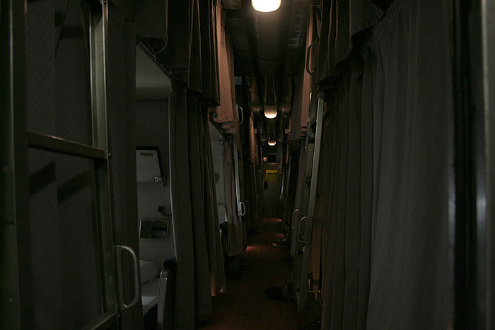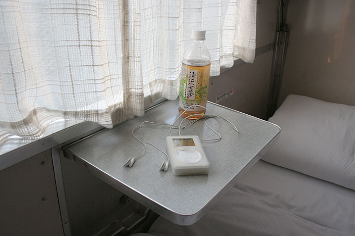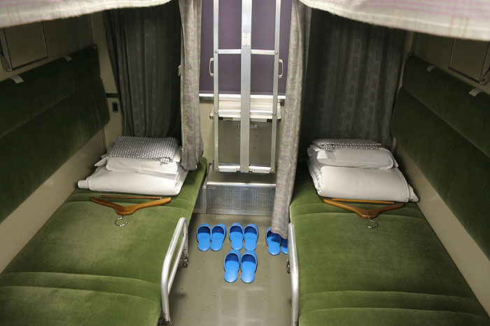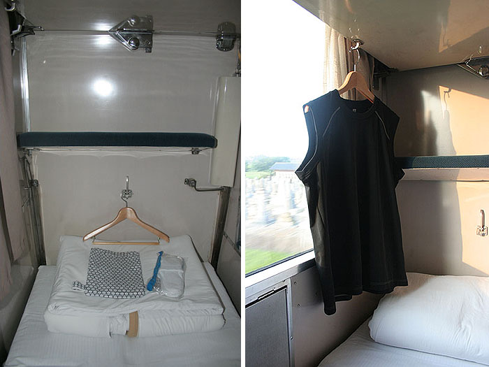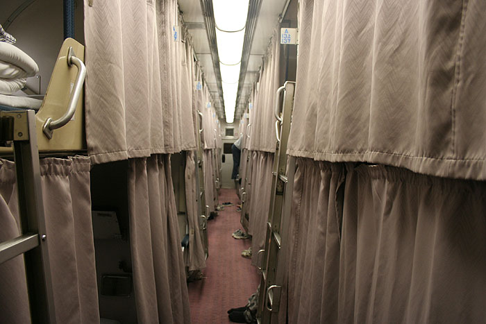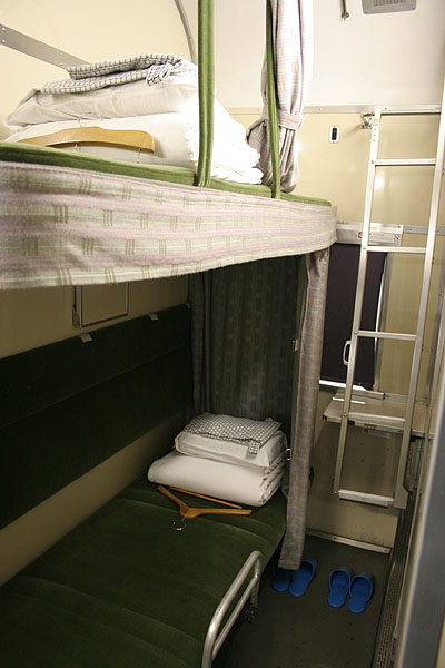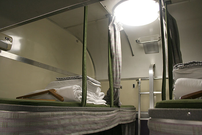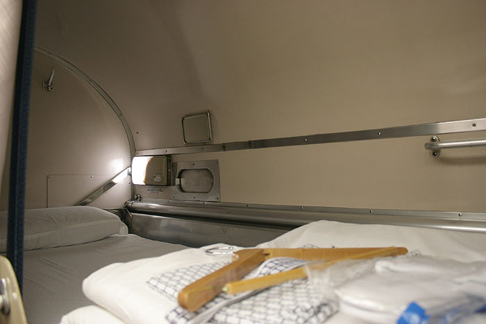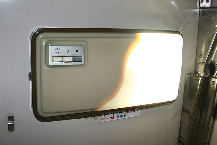 A寝台客室はデッキと直結ではなく、このような小部屋を介して客室が設定されています。 この空間には車掌室のほか、ボックスシート1区画と更衣室1室。 A寝台客室内は完全禁煙なので、このスペースが喫煙コーナーとなっています。 寝る前に一服・・・という乗客はもちろん、なかなか寝付けない人の息抜きの場としてけっこう使われています。 ただ、アルコール飲料を持ち込んで宴会を開くのだけは止めましょう。すぐ隣りは寝台客室です。 更衣室には大きな姿見と小物置き、収納式のミニ・スツールがあり、もちろんドアの内側から鍵をかけられます。 床面はカーペット敷きではなく、廊下と同じリノリウム。靴を脱いで着替えるのはちょっと抵抗がありますね。。。 ちなみに、シャッターが下りている区画は、大型バゲージを預けられる荷物室となっているそうです。 |