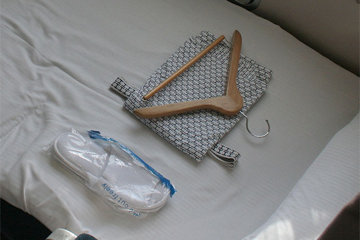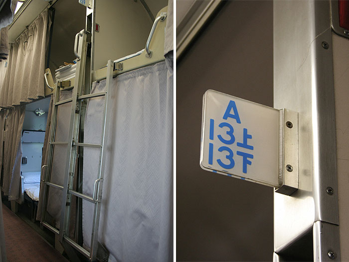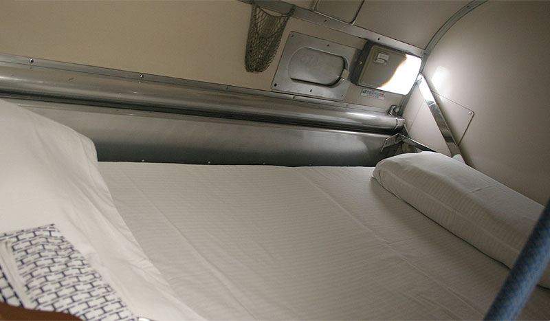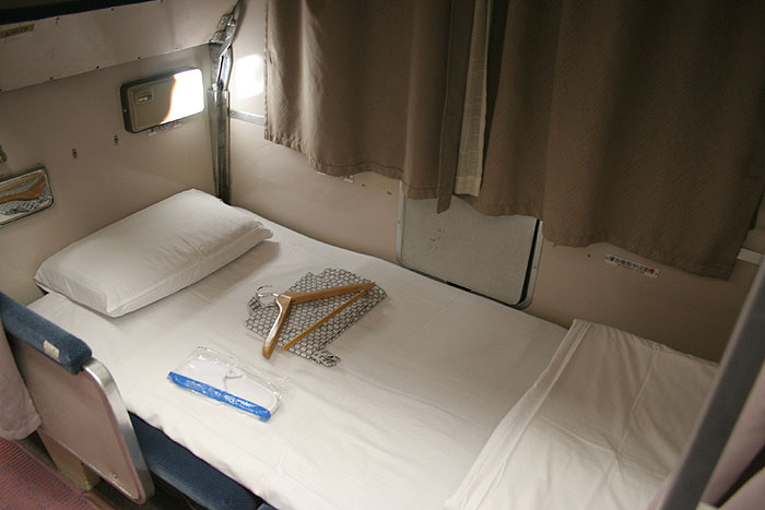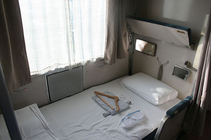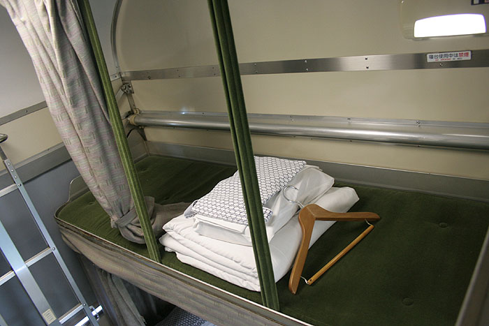 かつては多くの寝台列車に連結されたプルマン式のA寝台ですが、現在のA寝台は「個室」が当たり前の時代となり、 このような開放型寝台のA寝台は「銀河」と「きたぐに」「日本海3・2号」で見られるのみ。 上段寝台の小窓が特徴的な外観の原型「オロネ24」は、いまや貴重な存在です。 寝台内はセンターアイルに、その両脇に2段寝台をセット。 寝台は、上段を天井方向へ持ち上げて、下段をボックス席に組むことが可能ですが、 深夜に始発駅を発って早朝に終点に着く「銀河」では、このような「座席仕様」にすることはできません。 上段はシャッタークローズ式の小窓があり、寝そべりながら外の様子を覗き見ることができます。 下段は大きな窓が独り占めでき、なおかつ収納式のテーブルを引き出すことも可能。 さらに折り畳み式の荷物置き(コレ、実は座席時のヘッドレスト)があり、なにかと下段のほうが付帯装備は充実。 寝台照明・カガミ・コートフック・網製のメガネ入れは、上段/下段とも共通で装備されています。 ベッドサイズは、下段が190cm(長)×93cm(幅)×113cm(天井高)。上段は185cm(長)×88cm(幅)×92cm(天井高)。 こう書いてしまうと、なんだか上段はとても居住性が劣っているようですが(料金も下段より安いし)、 深夜・早朝の時間帯にもこまめに駅に停車して、頻繁に乗降のある「銀河」号では、 下段だと通路を行く人の足音や、床下から響いてくるブレーキ音や走行音がけっこう気になります。 その点、上段はこうした「騒音」の類がかなり軽減されるので、積極的に選択する大きな要素となります。 寝台にセットされたアメニティは、浴衣とハンガーと使い捨てスリッパのみ。 ハブラシや石鹸などの「アメニティキット」やタオルなどは配布されないので、乗車前に準備が必要です。 |