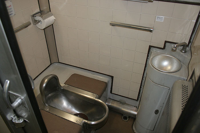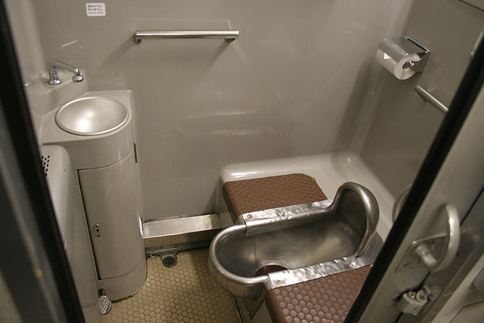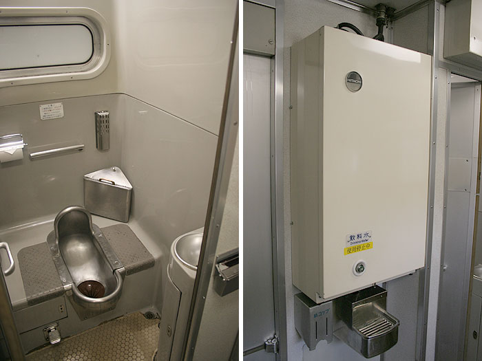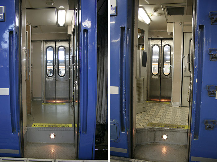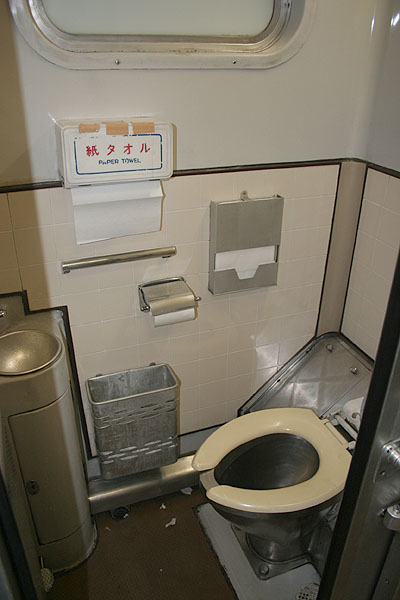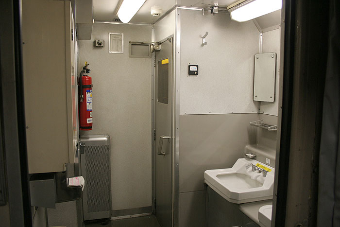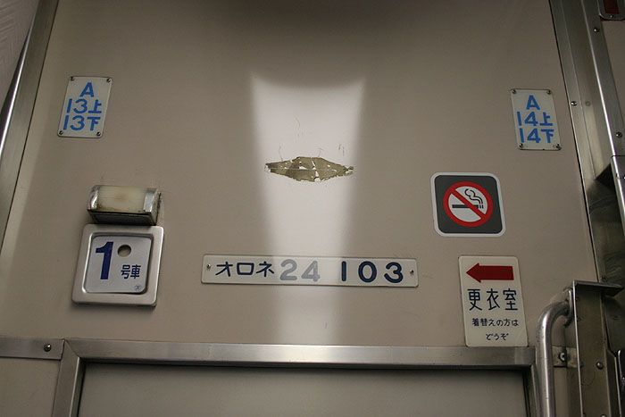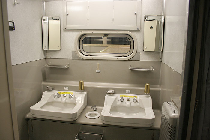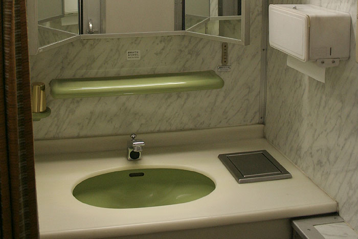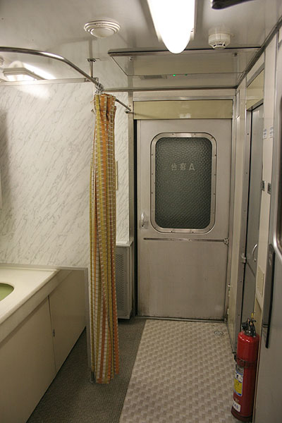 各B寝台車の大阪寄りには洗面台などのサニタリーコーナーが設置されています。 ご覧の通り昔ながらの陶器製のシンクに、和式便器は古めかしいアルミ剥き出しのもの。 冷水器は一部で撤去されているものの、ほとんどでまだ残されています。ただし全機が使用停止状態です。 前述のように編成内には飲料の自販機も無く、冷水機も使えないので、乗車前の飲料確保は必須です。 A寝台車も大阪寄りにサニタリーコーナーが設けられています。 こちらは位置的に「A寝台専用」となることから、大掛かりなリニューアルが施されています。 2ヶ所あるトイレは、片方がB寝台のと変わらない和式個室ですが、もう片方は洋式個室となっています。 洗面台もFRP製のキレイなものに交換され、もちろんセンサー式による自動給湯タイプ。 カガミは三面鏡が設置され、各洗面台を仕切るカーテンも設置されています。 デッキはノスタルジックな2枚式の折り戸が「さぁ、ブルートレイン!」というワクワク感と煽ってくれます。 ごく普通の素っ気無いデッキ部分ですが、よく見ると床面に模様が入ったリノリウムが敷かれている車輌もあり、 ちょこちょことリニューアルの手が入っていることが伺えます。 ちなみに、全ての出入り台のステップには「足元注意」の黄色い大きなステッカーが貼られています。 |