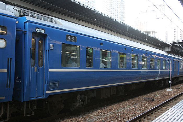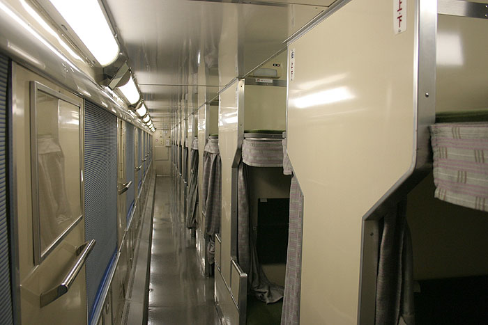 「銀河」号のB寝台車は、寝台特急と同等の「2段式寝台」となっています。 以前なら特急用車輌で運転される「急行」ということでお得感があったかもしれませんが、 B寝台でも「ソロ」などの個室が主流となる現在では・・・。ちなみに「銀河」号に個室車の連結はありません。 寝台モケットは、画像のグリーンのほかに、「あさかぜ」号で見られたブルーのモケットの車輌も混在しています。 2号車〜5号車・7号車の17番上下寝台は壁に対面した区画で、ちょっとした2人用個室の感覚で利用できます。 なお基本編成は1号車から6号車までの6両編成。7号車と8号車は繁忙期のみの連結となっています。 「銀河」号は上下列車・全区間とも車内販売はありません。 編成内に飲料の自販機すらもないので、乗車前には飲食物を購入しておくことをお薦めします。 |