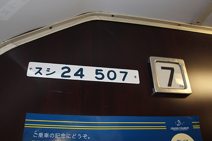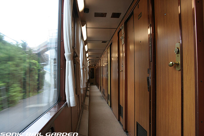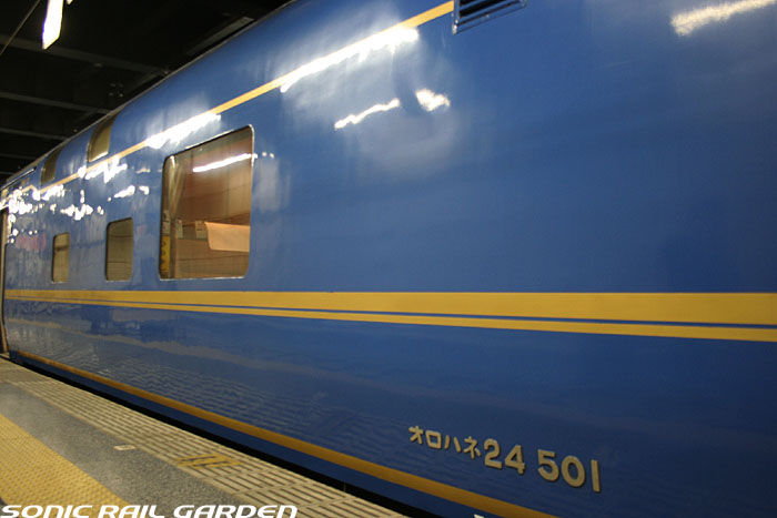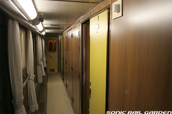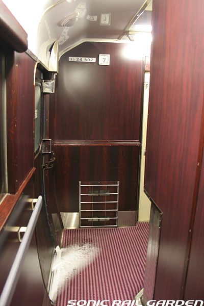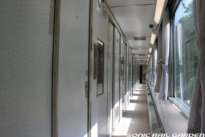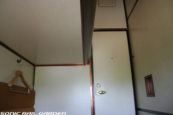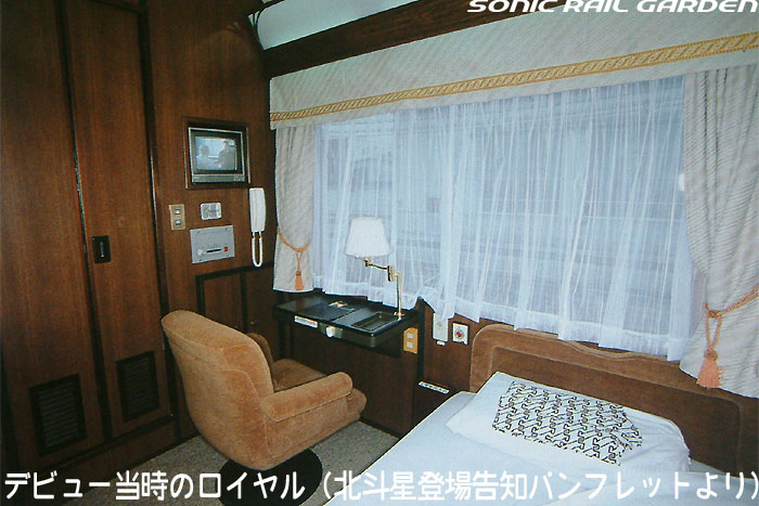 こちらの画像は「北斗星」登場当時から活躍しているロイヤル車両(オロハネ25-501〜503)です。 基本的な室内設備は、他の「北斗星・ロイヤル」と共通ですが、古参タイプとして後発タイプと若干の差異があります。 窓上部に緞帳が張り付けられ重厚さが増していて、その上部にある照明が蛍光色の間接照明になっている点、 また、コントロールパネルのスイッチ類がやや古めかしいものになっている点が相違として上げられます。 この「オロハネ25-501〜503」のタイプの「ロイヤル」は登場当時は、現在の仕様とかなり異なっていました。 デスクがシャワー脇の壁面ではなく窓下に設置されていて、ベッドは補助ベッドなしの幅900mmのシングルタイプでした。 これらは、その後の増備車の登場により、それらに合わせるように改造がなされ、現在の仕様に統一されました。 また、この車両のロイヤルだけは車体中央ではなく、デッキ寄りにオフセットされており、1号室は台車の直上に。 乗り心地の点では、「北斗星3・4号」ではこのタイプの車両が連結される9号車ではなく、 10号車(B個室「デュエット」と合造で、ロイヤルが車体中央にある)のほうがおすすめです。 |