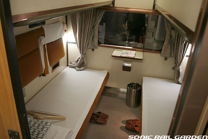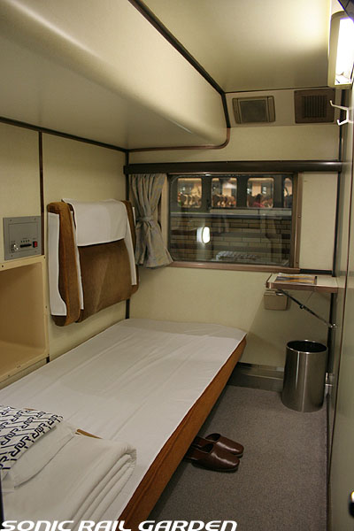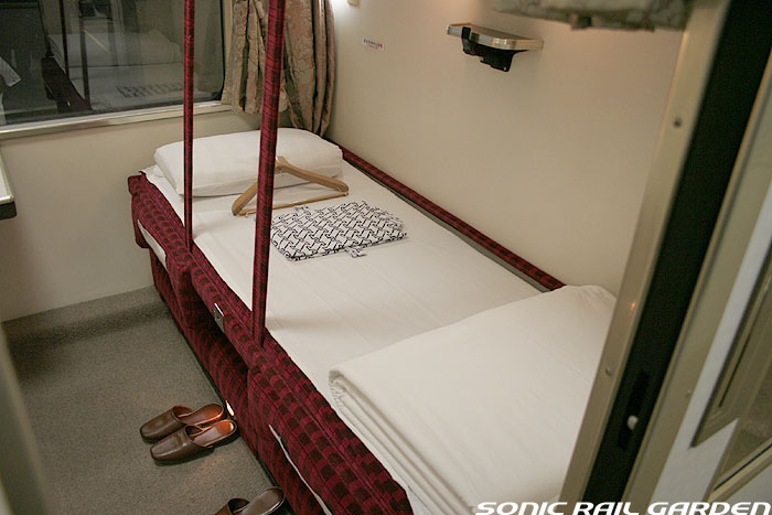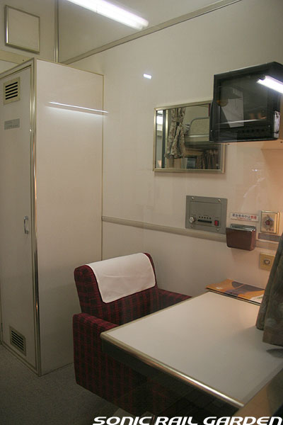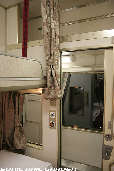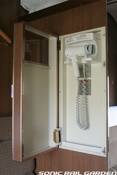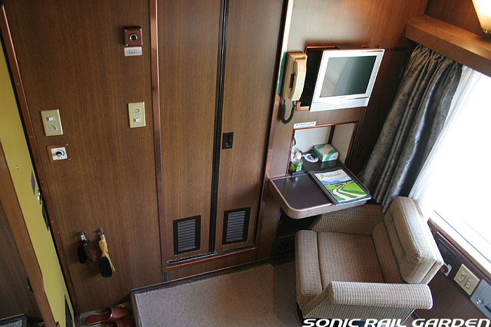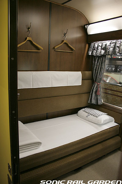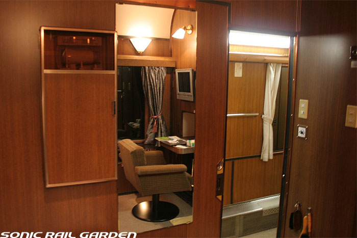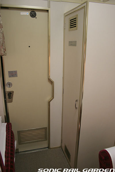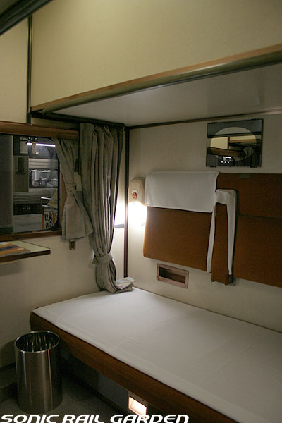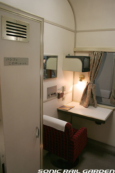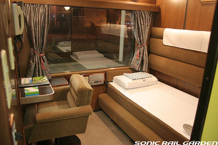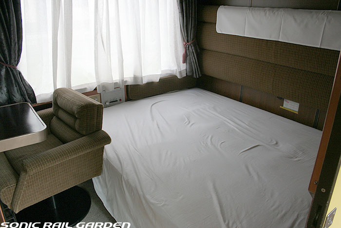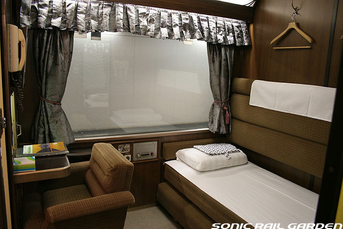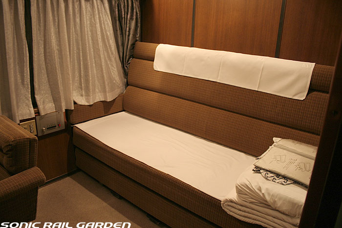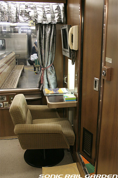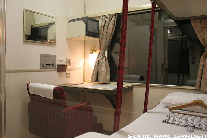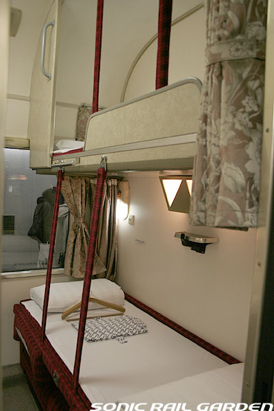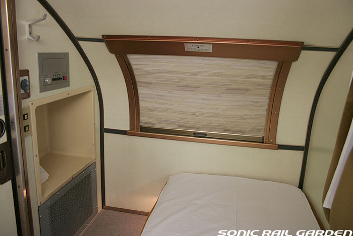 1,920×1,940の、ほぼ正方形の空間を半分が2段ベッド、半分がリビングスペースとした2人用個室。 赤系のタータンチェック柄は、シックな木目柄が多いJR東日本編成の個室では華やかさを強調した色調です。 (個室の基本構造はJR北海道編成のツインデラックスと同じ作りになっています) ベッドの下段はソファーベッドになっていて、ソファーの背もたれを下ろすとベッドに早変わり。 上段ベッドは跳ね上げ式ではなく固定式ですが、天井が高い空間で上段ベッド位置も高めにセットされているので、 上段ベッドが目障りに感じたりすることは、さほどでもありません。 上段には583系の上段ベッドにも似た小さな窓があるので、寝ながらでも外の風景を確認することができます。 ちなみにベッド幅は上段が70センチ幅、下段は75センチ幅となっています。 リビングスペースには、まず入り口脇にロッカー。もちろんコートや荷物を収納するのに使うわけですが、 このロッカーの中には上段ベッドに上がるためのハシゴがあり、利用者がセットするようになっています。 ちなみに荷物収納スペースは入り口ドアの上部、ちょうど通路の天井になる部分にも大きく確保されています。 窓側には大きめのライティングデスクとソファーチェア、オットマン(足置き)。 そしてデスクを中心にビデオ放送モニターとコントロールパネル、カガミなどが集中的に配置されています。 このモニターでは「ロイヤル」と同じく2チャンネルの映画放送がプログラムとして組まれています。 空調のコントロールパネルは入り口脇の柱に「暖房」と「冷房」がそれぞれ別に設置されています。 なお、室内にはコンセントはないので、電子機器や携帯電話の充電などはできません。 旅行会社の「北斗星」を使ったプランでは、料金上乗せでこの「ツインデラックス」が使えるプランをよく見かけられます。 カップルで・仲の良い友達とちょっと豪華な「北斗星」の旅をしたいという時には、おすすめの個室です。 |