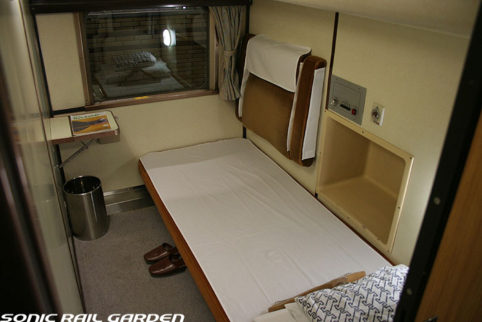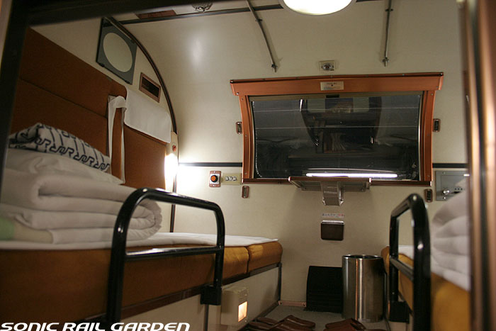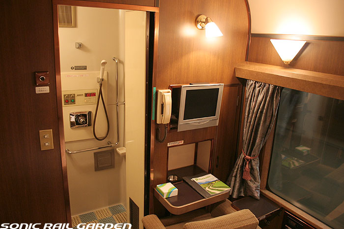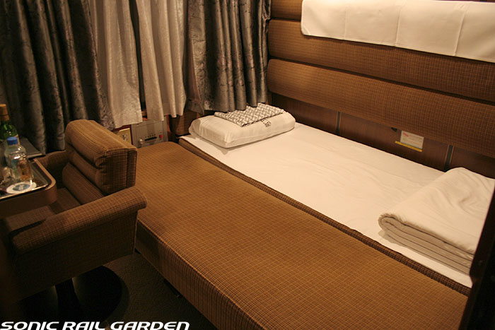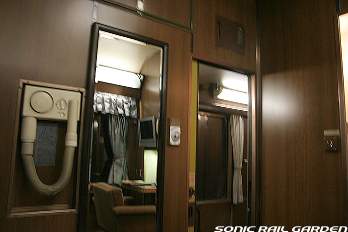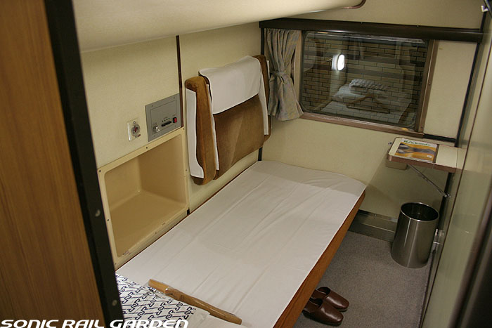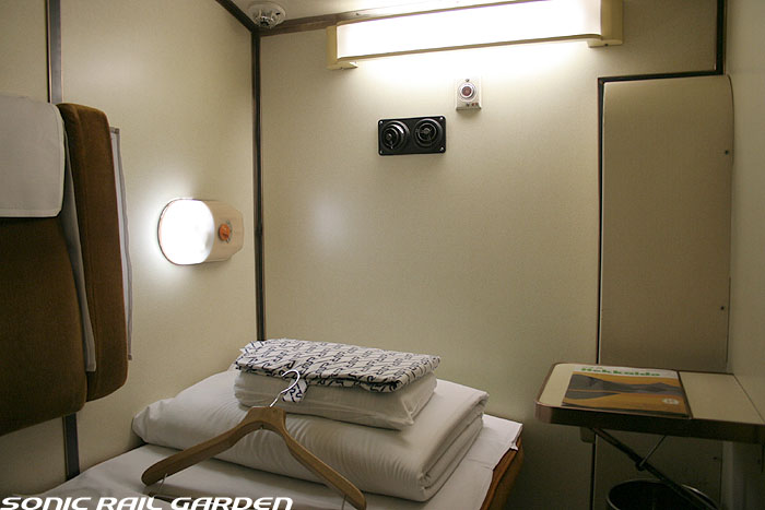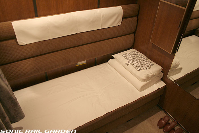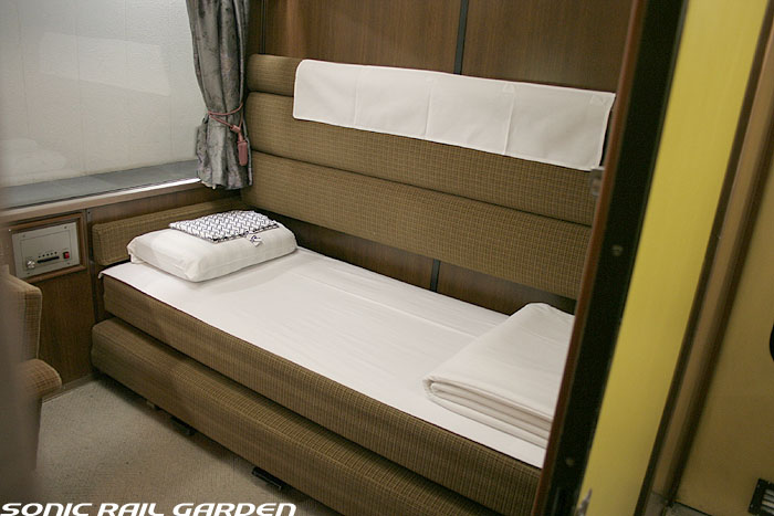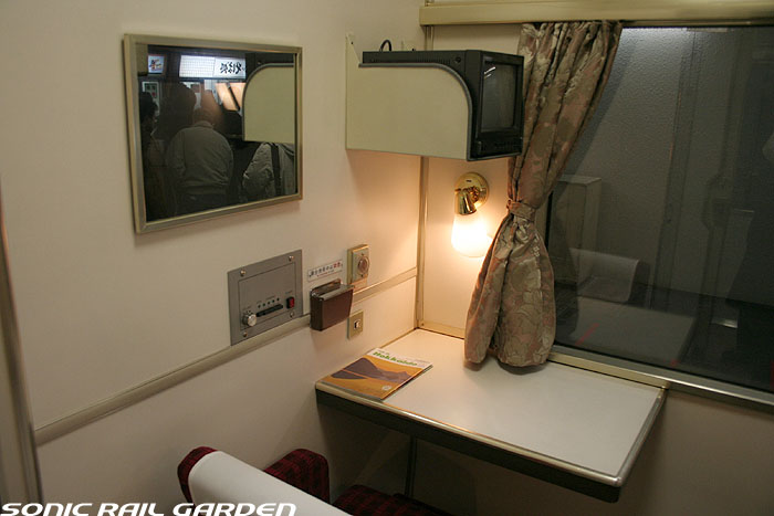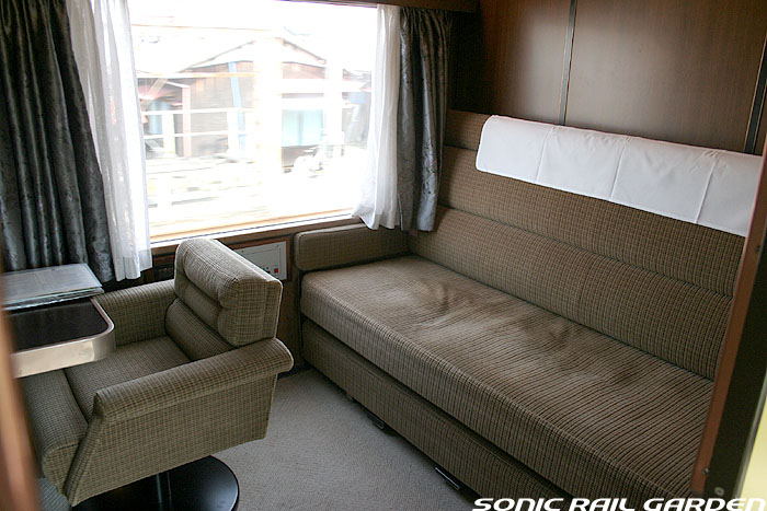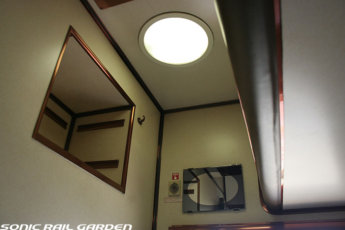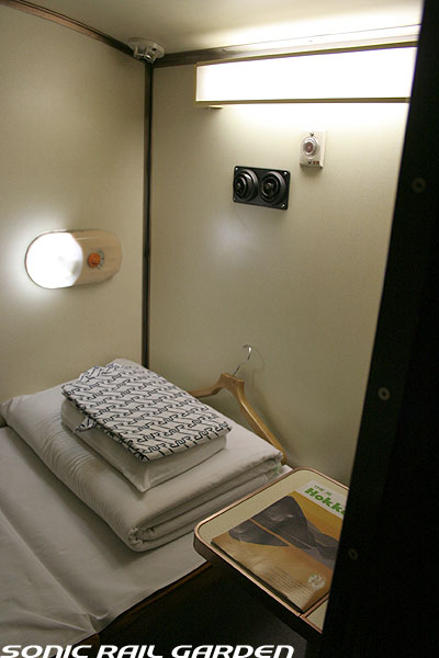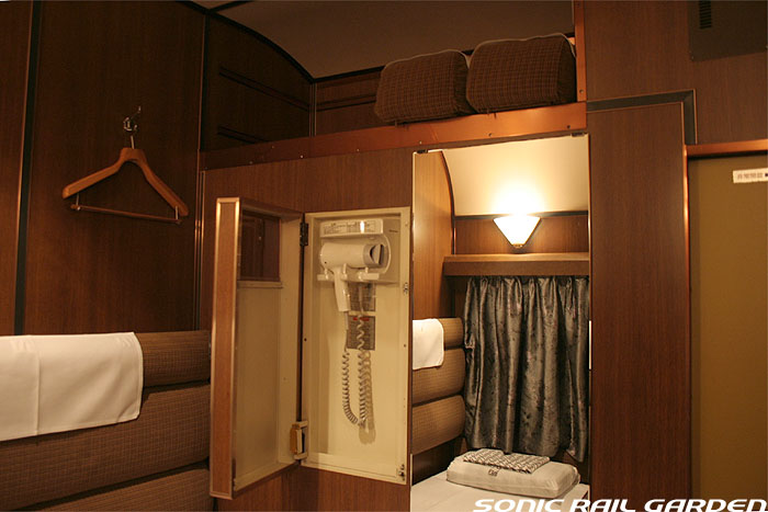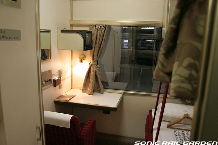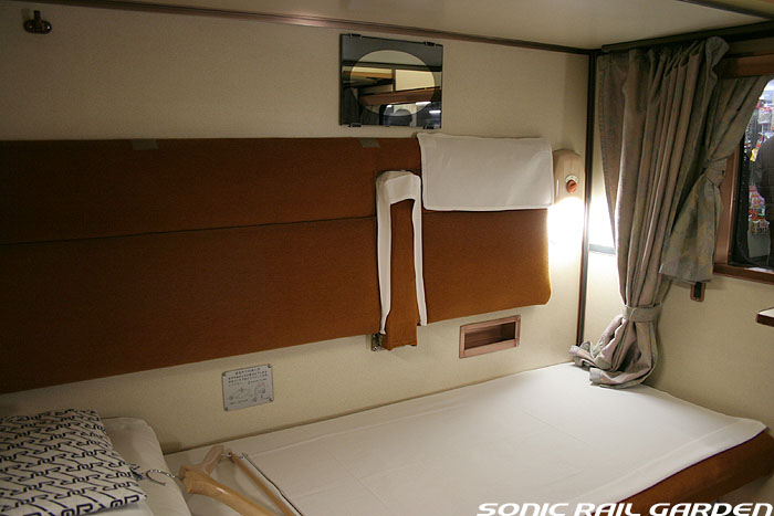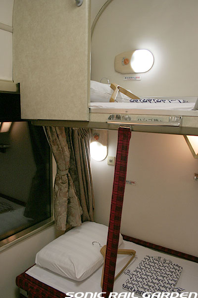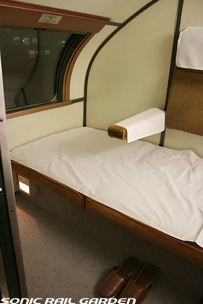 1,920×1,940の、ほぼ正方形の空間を半分が2段ベッド、半分がリビングスペースとした2人用個室。 赤系のタータンチェック柄は、シックな木目柄が多いJR東日本編成の個室では華やかさを強調した色調です。 (個室の基本構造はJR北海道編成のツインデラックスと同じ作りになっています) ベッドの下段はソファーベッドになっていて、ソファーの背もたれを下ろすとベッドに早変わり。 上段ベッドは跳ね上げ式ではなく固定式ですが、天井が高い空間で上段ベッド位置も高めにセットされているので、 上段ベッドが目障りに感じたりすることは、さほどでもありません。 上段には583系の上段ベッドにも似た小さな窓があるので、寝ながらでも外の風景を確認することができます。 ちなみにベッド幅は上段が70センチ幅、下段は75センチ幅となっています。 リビングスペースには、まず入り口脇にロッカー。もちろんコートや荷物を収納するのに使うわけですが、 このロッカーの中には上段ベッドに上がるためのハシゴがあり、利用者がセットするようになっています。 ちなみに荷物収納スペースは入り口ドアの上部、ちょうど通路の天井になる部分にも大きく確保されています。 窓側には大きめのライティングデスクとソファーチェア、オットマン(足置き)。 そしてデスクを中心にビデオ放送モニターとコントロールパネル、カガミなどが集中的に配置されています。 このモニターでは「ロイヤル」と同じく2チャンネルの映画放送がプログラムとして組まれています。 空調のコントロールパネルは入り口脇の柱に「暖房」と「冷房」がそれぞれ別に設置されています。 なお、室内にはコンセントはないので、電子機器や携帯電話の充電などはできません。 旅行会社の「北斗星」を使ったプランでは、料金上乗せでこの「ツインデラックス」が使えるプランをよく見かけられます。 カップルで・仲の良い友達とちょっと豪華な「北斗星」の旅をしたいという時には、おすすめの個室です。 |