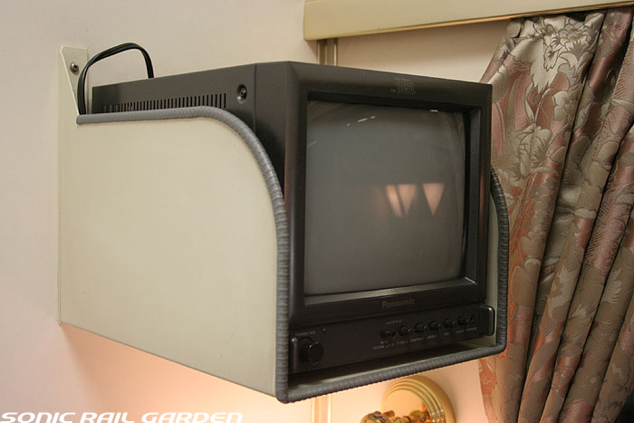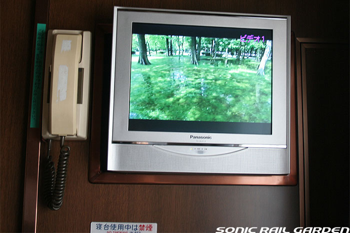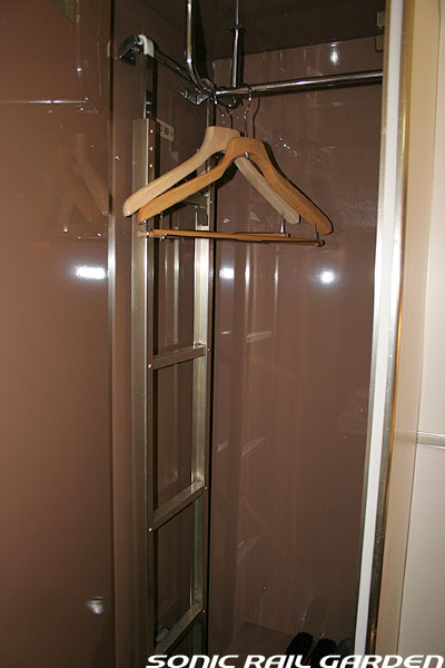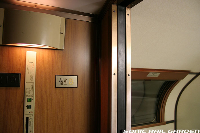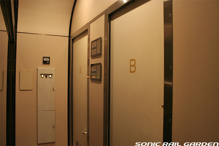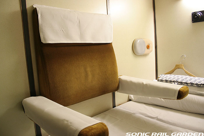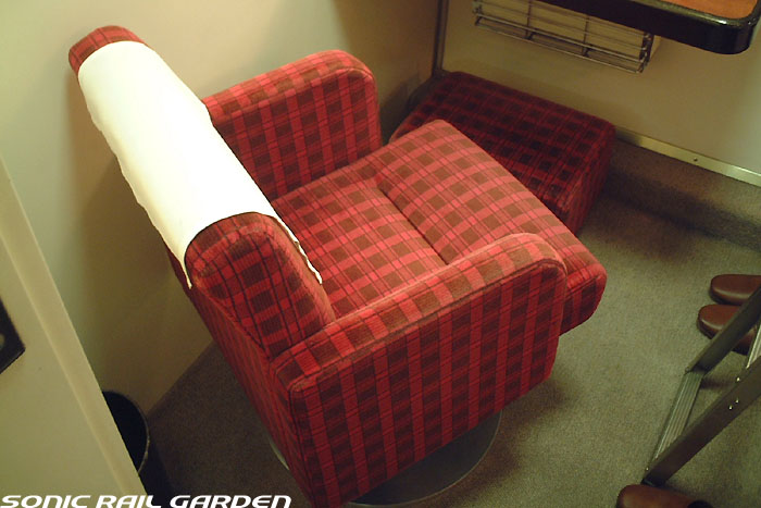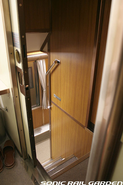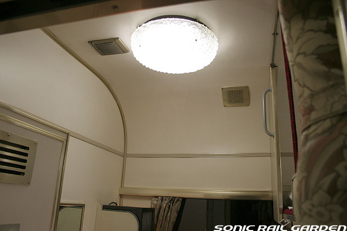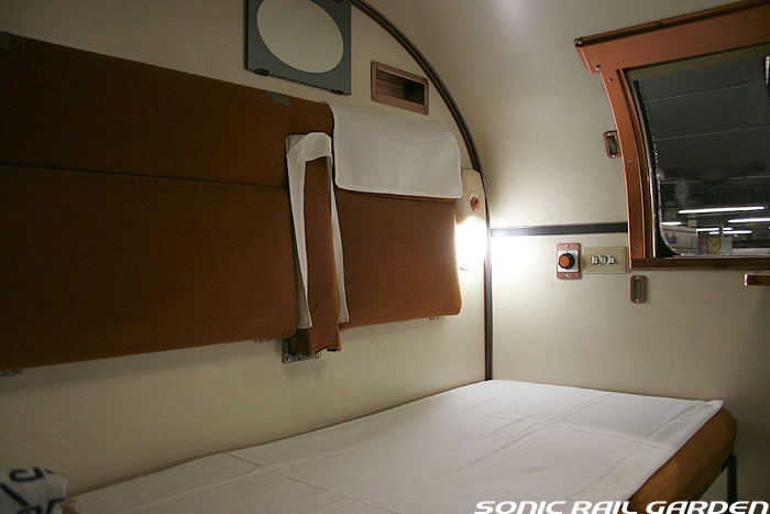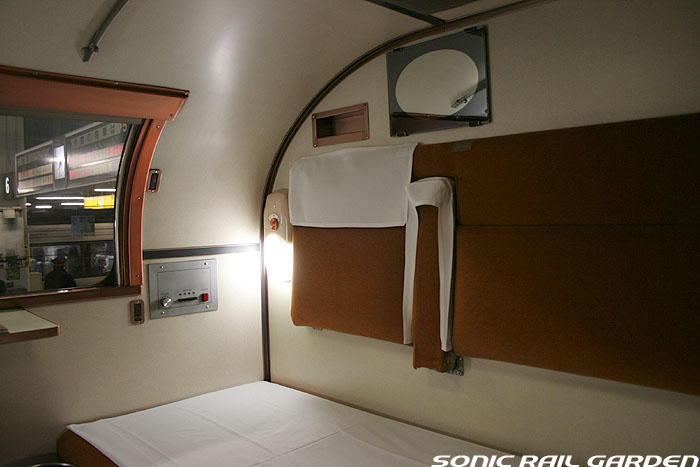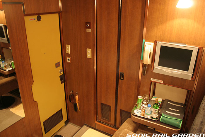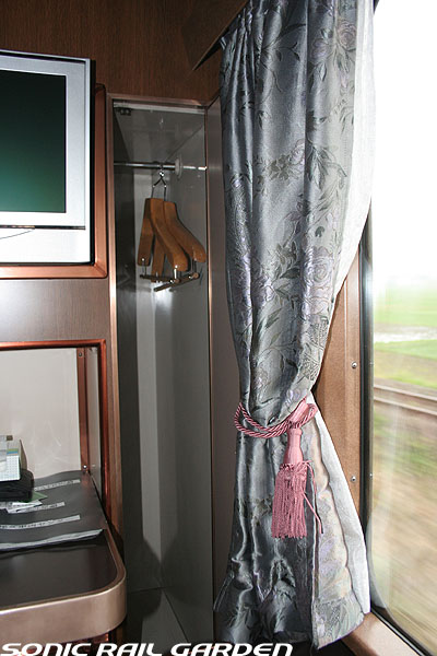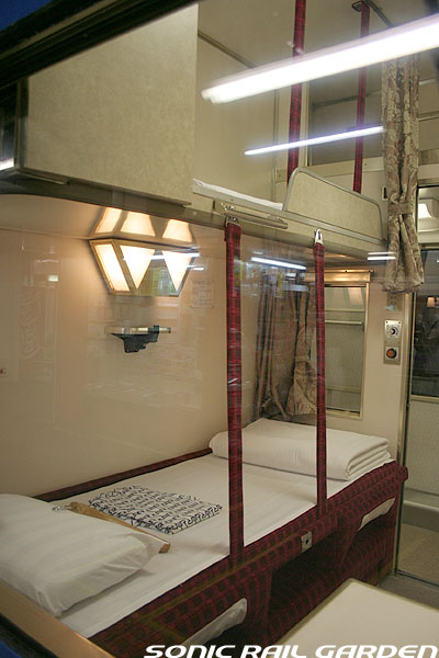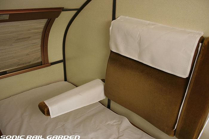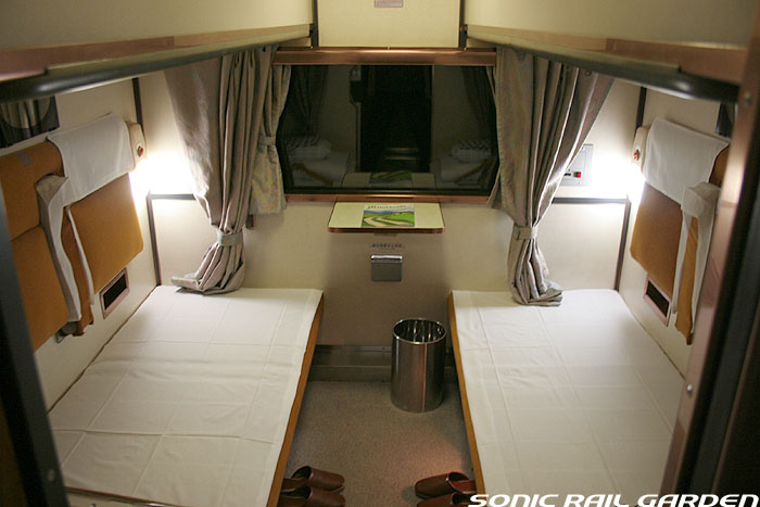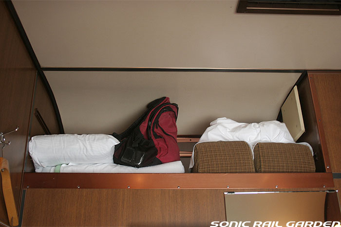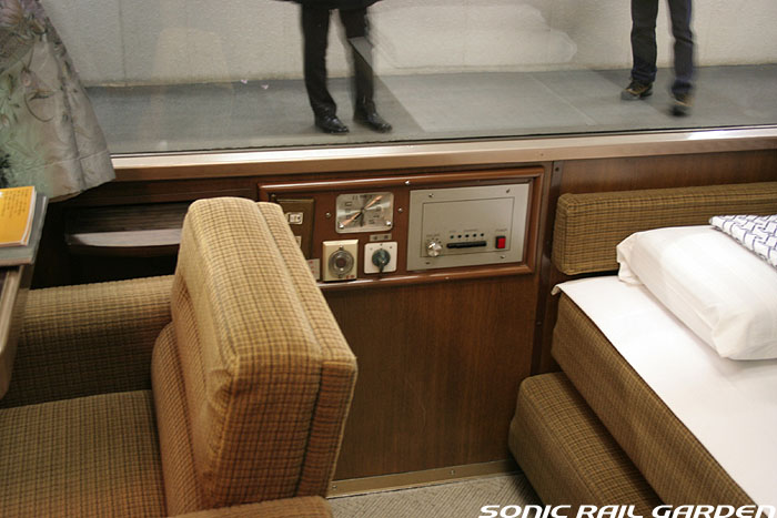 1,920×1,940の、ほぼ正方形の空間を半分が2段ベッド、半分がリビングスペースとした2人用個室。 赤系のタータンチェック柄は、シックな木目柄が多いJR東日本編成の個室では華やかさを強調した色調です。 (個室の基本構造はJR北海道編成のツインデラックスと同じ作りになっています) ベッドの下段はソファーベッドになっていて、ソファーの背もたれを下ろすとベッドに早変わり。 上段ベッドは跳ね上げ式ではなく固定式ですが、天井が高い空間で上段ベッド位置も高めにセットされているので、 上段ベッドが目障りに感じたりすることは、さほどでもありません。 上段には583系の上段ベッドにも似た小さな窓があるので、寝ながらでも外の風景を確認することができます。 ちなみにベッド幅は上段が70センチ幅、下段は75センチ幅となっています。 リビングスペースには、まず入り口脇にロッカー。もちろんコートや荷物を収納するのに使うわけですが、 このロッカーの中には上段ベッドに上がるためのハシゴがあり、利用者がセットするようになっています。 ちなみに荷物収納スペースは入り口ドアの上部、ちょうど通路の天井になる部分にも大きく確保されています。 窓側には大きめのライティングデスクとソファーチェア、オットマン(足置き)。 そしてデスクを中心にビデオ放送モニターとコントロールパネル、カガミなどが集中的に配置されています。 このモニターでは「ロイヤル」と同じく2チャンネルの映画放送がプログラムとして組まれています。 空調のコントロールパネルは入り口脇の柱に「暖房」と「冷房」がそれぞれ別に設置されています。 なお、室内にはコンセントはないので、電子機器や携帯電話の充電などはできません。 旅行会社の「北斗星」を使ったプランでは、料金上乗せでこの「ツインデラックス」が使えるプランをよく見かけられます。 カップルで・仲の良い友達とちょっと豪華な「北斗星」の旅をしたいという時には、おすすめの個室です。 |