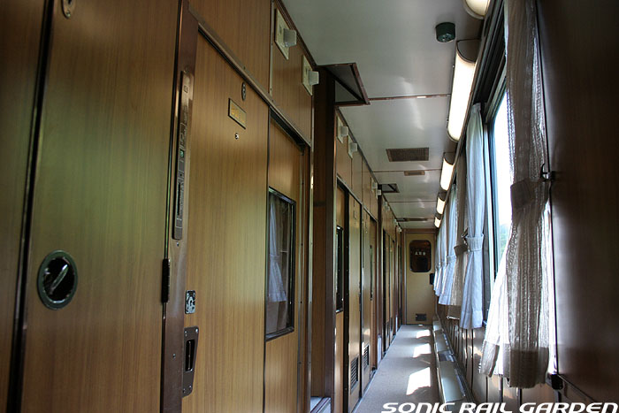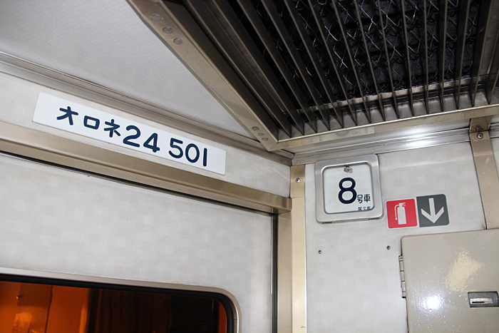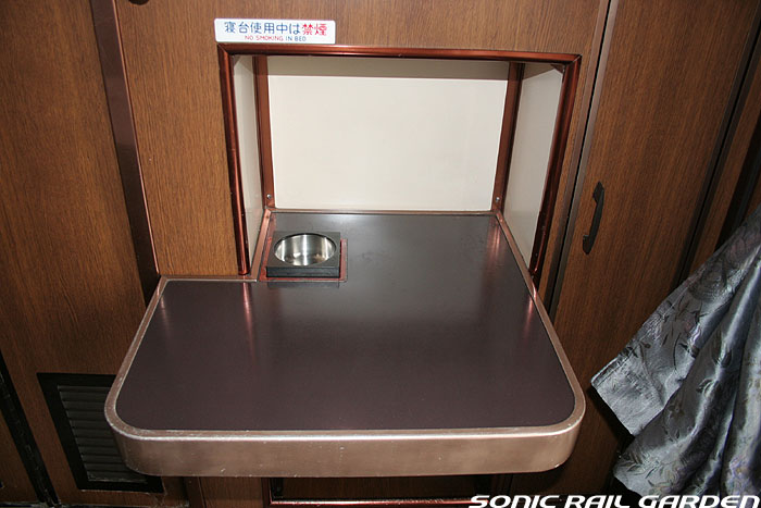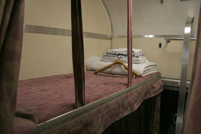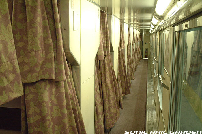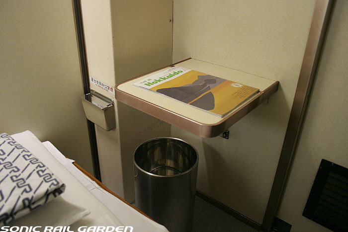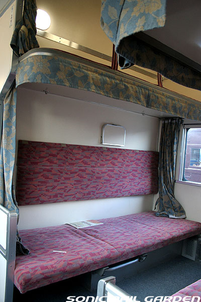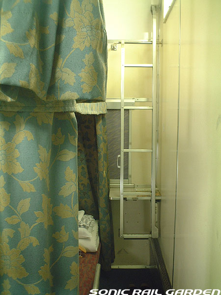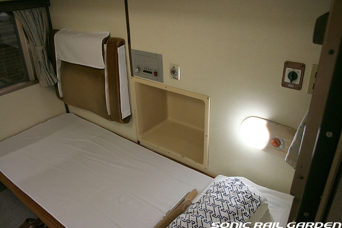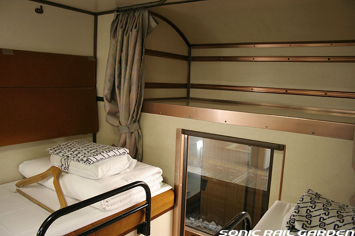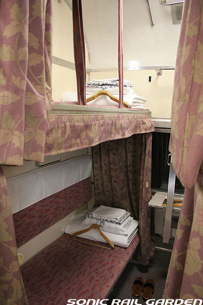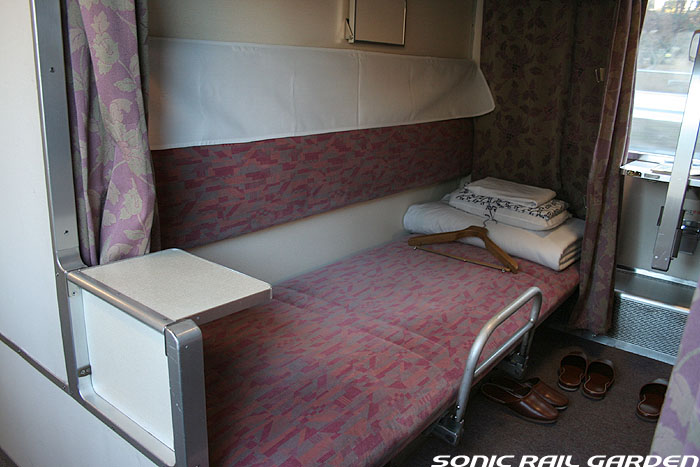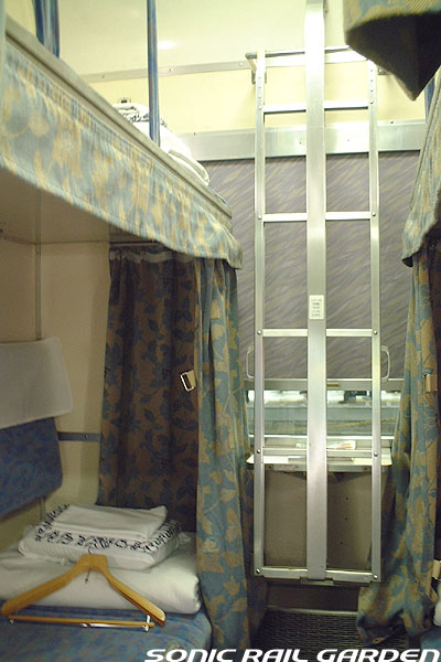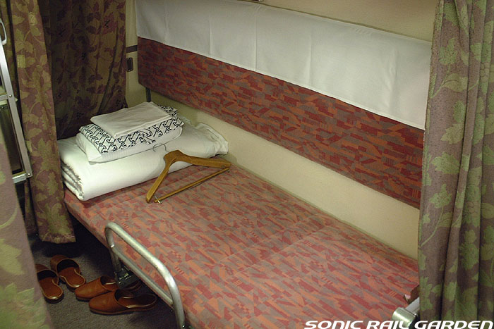 東日本編成の「北斗星」3・4号(デビュー当初の5・6号)では、編成の半分が昔ながらの「開放型B寝台」で占められています。 カーテンやベッドは車両によってローズピンクやブルー系の色調に改められて、ずいぶんと明るい雰囲気になりました。 ベッド幅は70センチ。ベッド周りの設備は折り畳みテーブル・読書灯・小物置きと、昔とほとんど変化なし。 マクラ・毛布・浴衣・ハンガーがベッド上に、窓下のテーブルにはJR北海道の冊子がそれぞれセットされています。 「オハネ25」形式の車両が入る号車の17番区画は対面が壁になっているので、ちょっとした個室のよう。 基本は2〜4号車がこの「オハネ25」になるようですが、編成組み換えなどで変更となる場合もあります。 |
