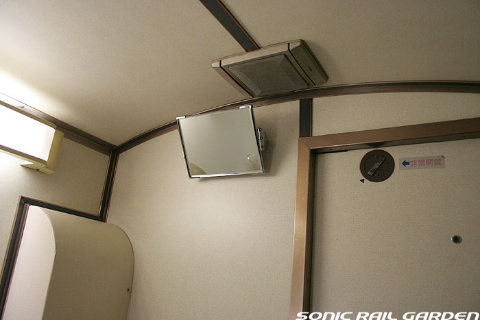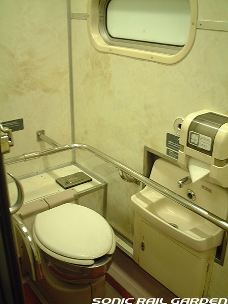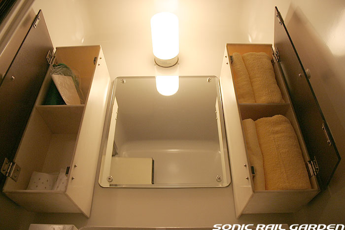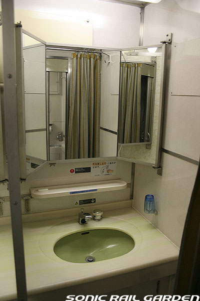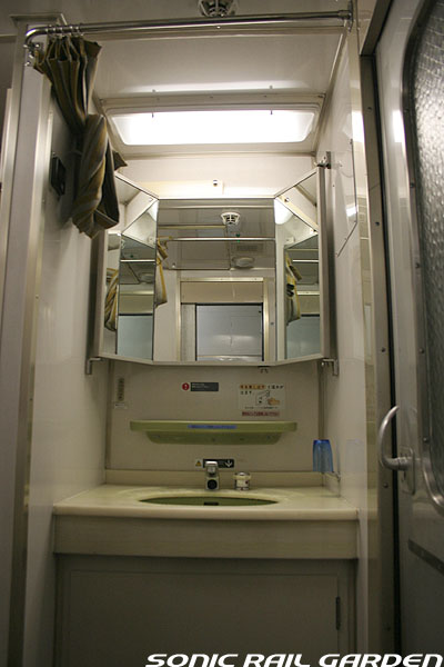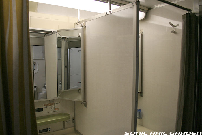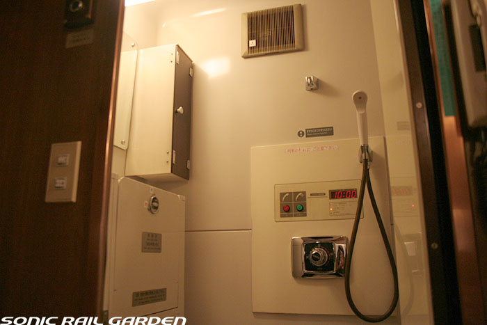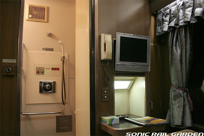シャワーブースにはシャワーのほか、収納式の洗面台とトイレが設置されています。 個室内でシャワーを浴び、洗面台で歯を磨き、トイレもOK・・・室内から出ることなく一晩を過ごせるほどです。 シャワーは1カウントで10分の連続利用が可能(ちなみにロビーカーの共用シャワーは6分利用)。 この「10分」は、シャワーブース入口の「シャワーご利用ボタン」を押すといつでも10分にリセットできます。 洗面台上部にはカガミと洗面用具の収納ボックス。このボックスの中にはバスタオルとコップ、そして洗面セット。 洗面セットは、北斗星のワンポイントが入ったアメニティポーチに入っていて、もちろん持ち帰り可能。 ポーチの中にはシャンプー・リンス・石鹸・くし・ハブラシ・シェーバー・アフターシェーブローションが入っています。 シャワー装置の下部にはトイレットペーパーが収納された小さな扉がありますが、 これがかなり緩いのでシャワーのお湯が入り込み、中のトイレットペーパーは確実に濡れてしまいます。 シャワー利用前にトイレットペーパーを先に取り出しておくのがベストです。 JR北海道編成のロイヤルでもそうですが、室内全体で見てコンセントがシャワーブースの洗面台脇の奥まったところ、 この1ヶ所しかありません。室内でパソコンを使ったり、携帯電話やデジカメの充電をするつもりだという人は、 “お荷物”でも2〜3メートルの長さの「延長コード」を持参されることをお薦めします。 コンセントの口は水濡れ防止のカバー付きなので、持参する延長コードはプラグ側が可動するタイプにしましょう。 (情報提供:「錆び鉄の部屋」 ちゅう様より ありがとうございます) --------------------------------------------------------------------------------- 室内コンセント情報:追記2007-09-04 デスク下のゴミ箱がおいてある空間の奥にコンセントがあるとのこと。(情報提供:ほしやま様) ただし、ロイヤルの全個室にあるのか、また清掃・業務用コンセントではないかなどの詳細は不明です。 --------------------------------------------------------------------------------- (ここまでの画像は「オロハネ24-501」のロイヤルにて撮影。) |