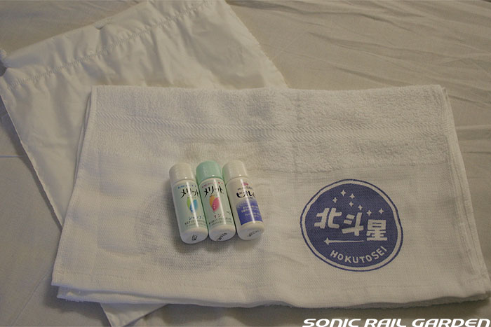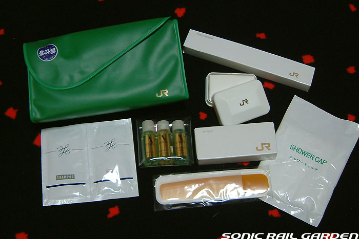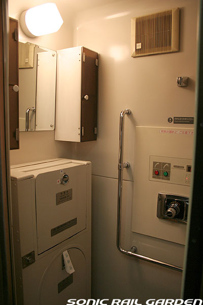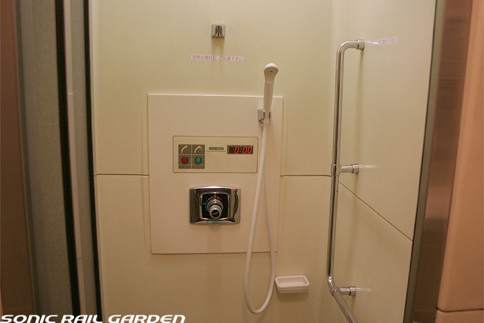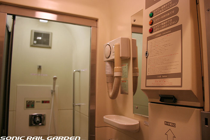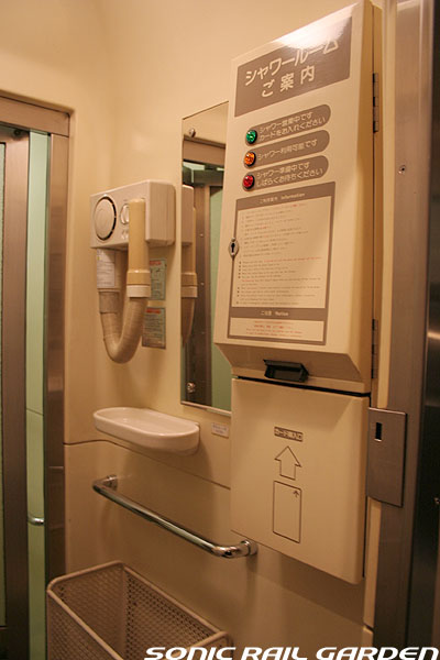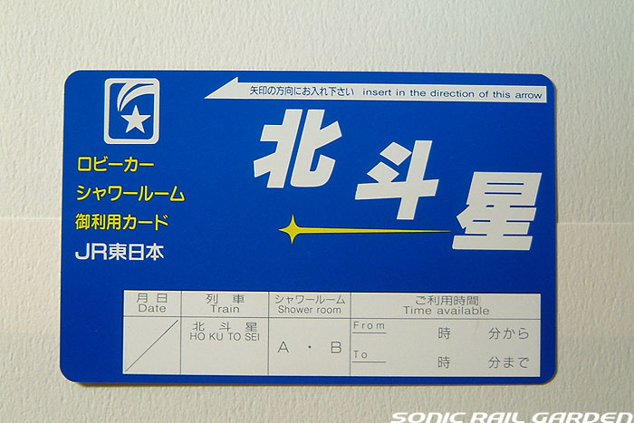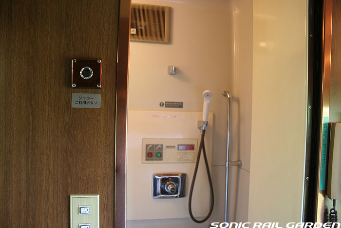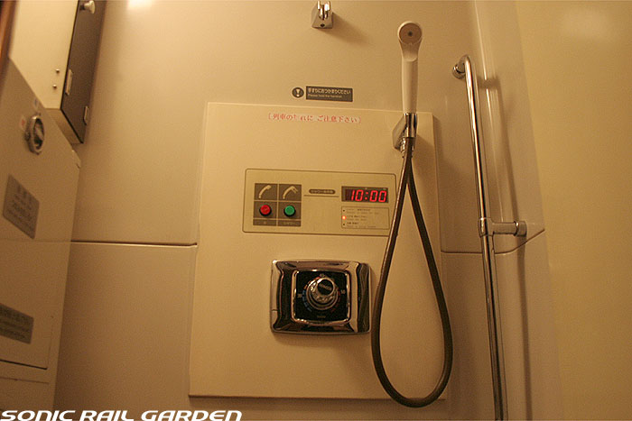 シャワーブースはA室とB室の2スペースがあり、利用するにはまず食堂車でシャワーカードを購入、予約が必要です。 利用時間は上野(札幌)発車後から23:30までと、翌朝6:00から札幌(上野)到着の30分前までです。 シャワーカードは1枚310円で、1回の利用で30分の時間が確保できます。 シャワーは6分間の給湯で、途中「一時停止」を使えば、身体と頭を洗って泡を流し、体を暖めるには充分な利用時間です。 (洗髪に時間を掛ける女性には6分は短いかもしれません) 残り時間が1分を切ると、室内に「緊急事態発生!」の如くブザー音が鳴り響き、ちょっとビックリします。 残り時間に余裕があっても、うっかりドアを開けるとそこで残り時間がゼロになり、利用終了になるのでご注意を! 更衣スペースには、脱いだ服を入れる簡単なカゴ(最初ゴミ箱かと思った)とカガミ、ドライヤーがあります。 ドライヤーは風量が大変弱いので、なかなか髪の毛が乾きません。女性は間違いなくドライヤーを持参したほうがよいです。 このシャワー室にはタオルや石鹸などは一切設置されていないので、利用者が自分で用意する必要があります。 もし洗面用具を忘れてしまっても、食堂車でこのようなシャワーセットが売られているので大丈夫。 このシャワーセットは1セット420円。タオルには「北斗星」のロゴ入りで、持ち帰れば旅の記念になりますね。 |