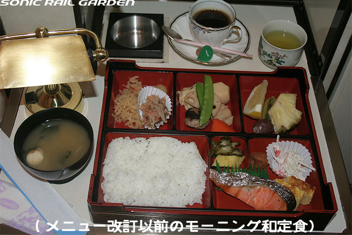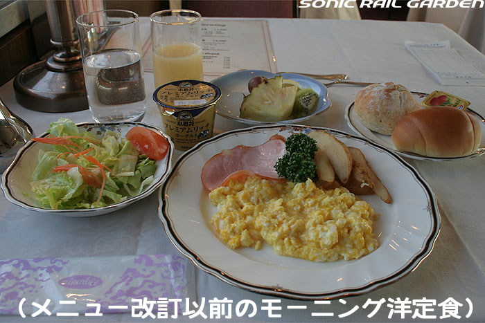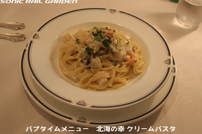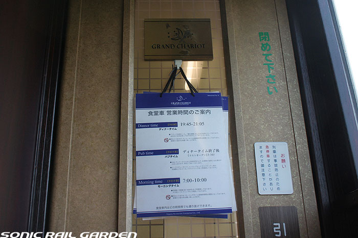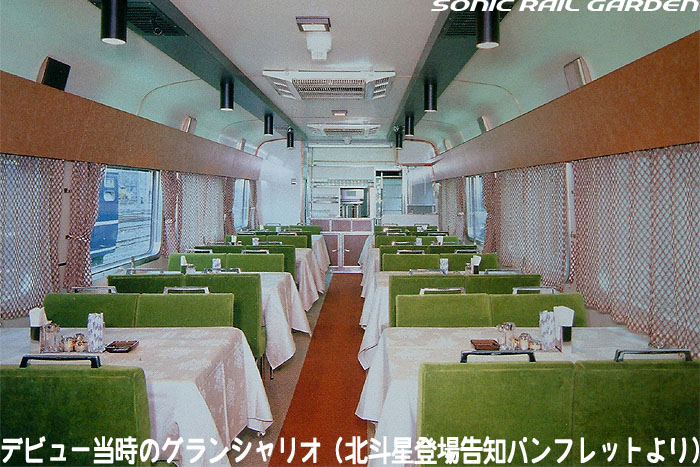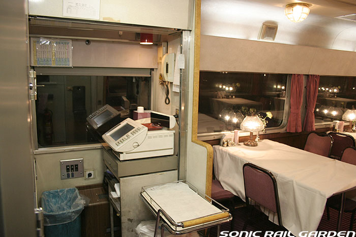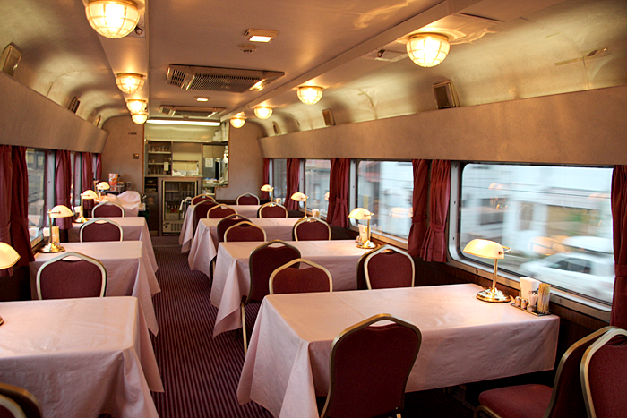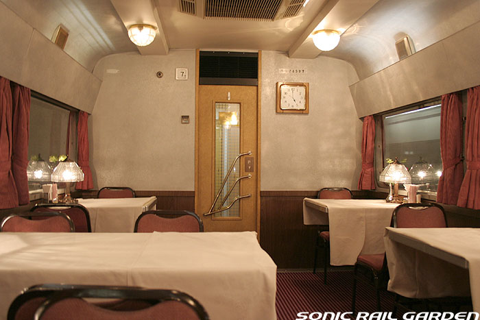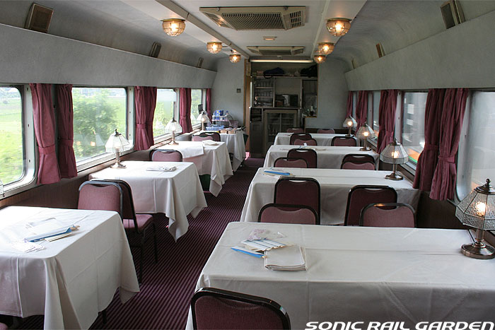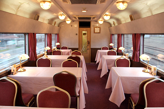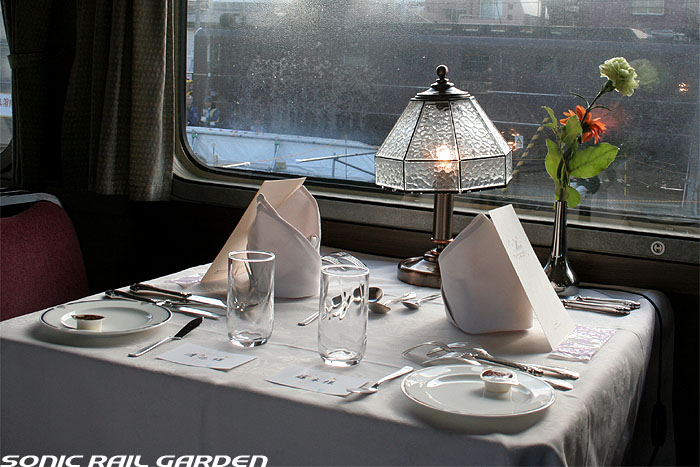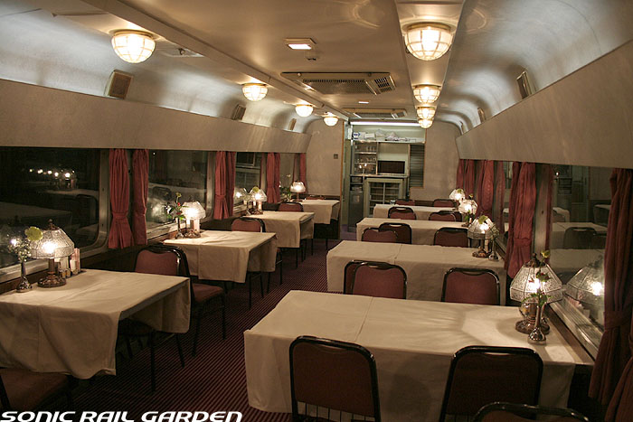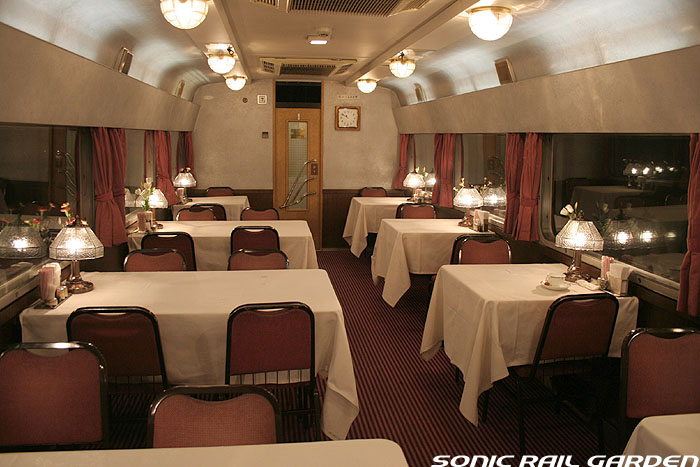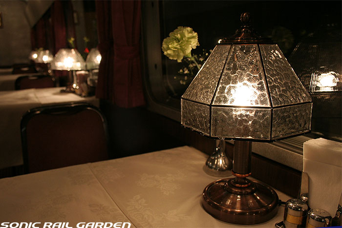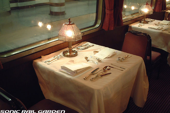 「北斗星」の名を世間に轟かせたのが、豪華個室「ロイヤル」とこの食堂車「グランシャリオ」の存在ではないでしょうか。 当時のブルートレインの食堂車は、どこか殺風景でメニューの内容も大衆食堂のようだったのですが、 「北斗星」の食堂車では“完全予約制フレンチディナーフルコース”を導入し、ダイニングホールのインテリアも高級路線に。 まさに「走るレストラン」の決定版として、マスコミやメディアがこぞって取り上げ、「北斗星」の存在を印象付けました。 JR東日本編成の「グランシャリオ」はクリスタル調のインテリアとなっています。 JR北海道編成の重厚なアールデコ調インテリアとは対照的で、あっさりした中にもどこか格調の高さを感じるインテリアです。 カットガラスを組み合わせたダイニングライトが照らし出すホールは、旅の気分を大きく盛り上げてくれます。 また、夜と朝ではダイニングホールの印象が全く異なるので、夜と朝のどちらも利用する価値があります。 食堂車「グランシャリオ」の営業は、北斗星3・4号ともに、19:45〜21:05が予約制のディナータイム。 予約不要のパブタイムは、ディナータイム終了後〜23:00までとなっています。 モーニングタイムは、3号が6:30〜10:00頃まで。4号は7:00〜10:00ごろまで。朝食は予約不要です。 |