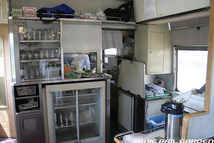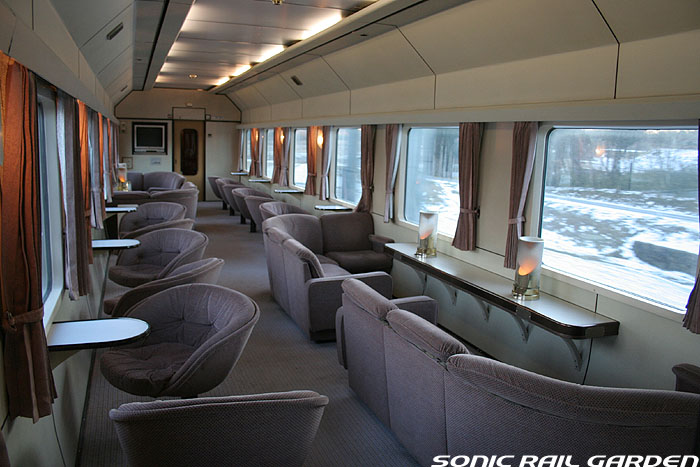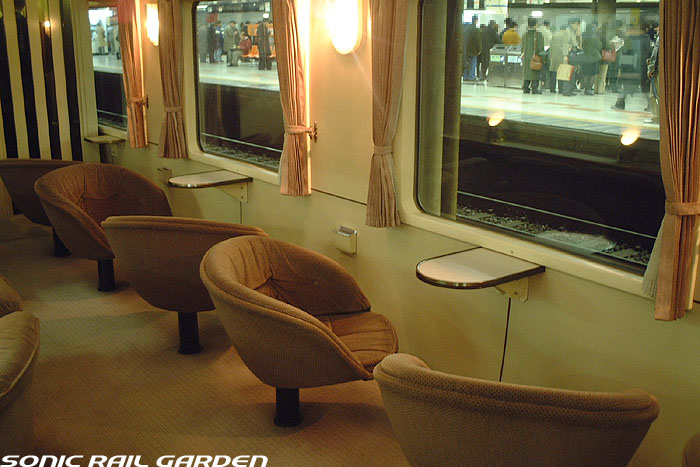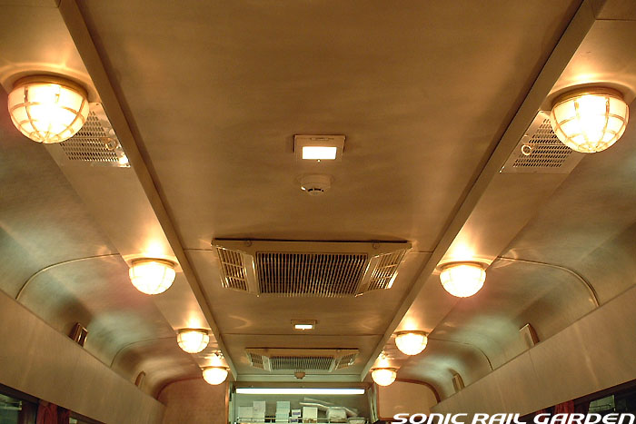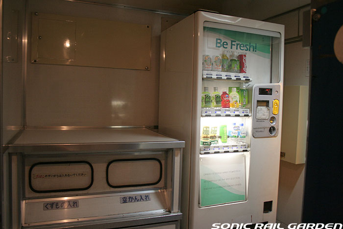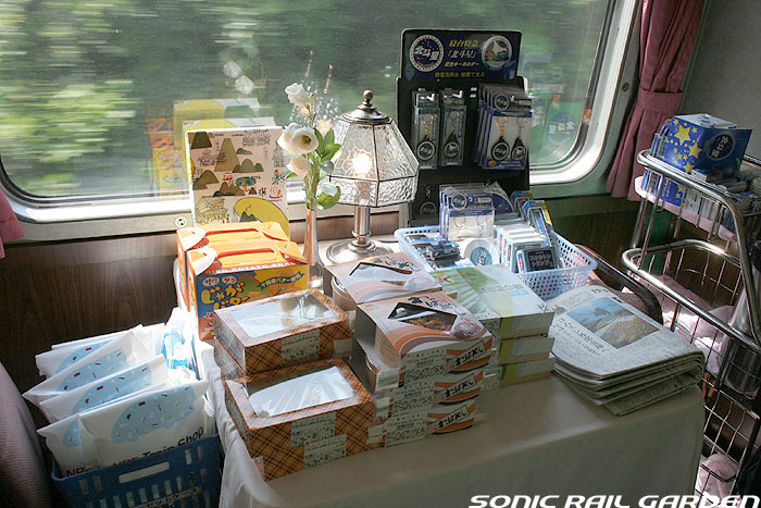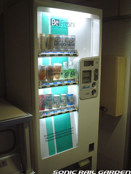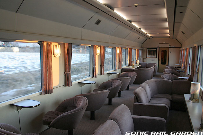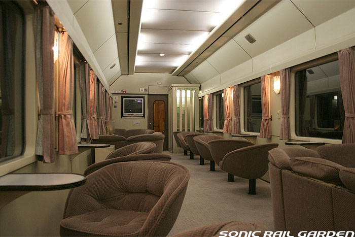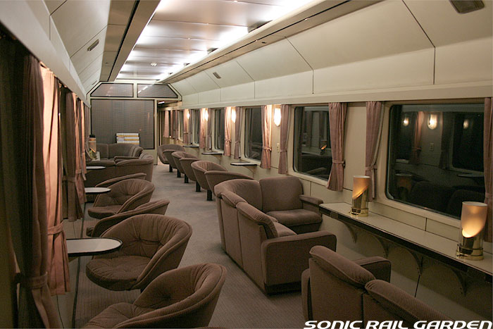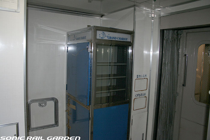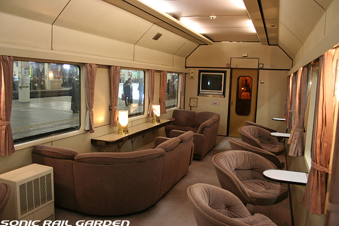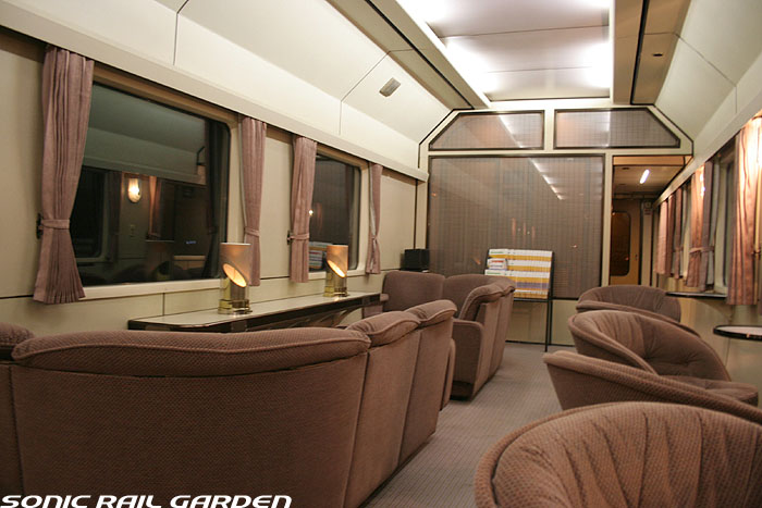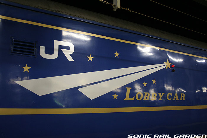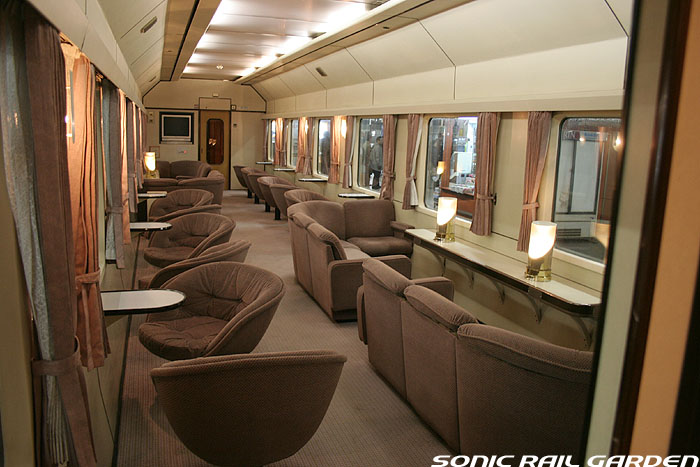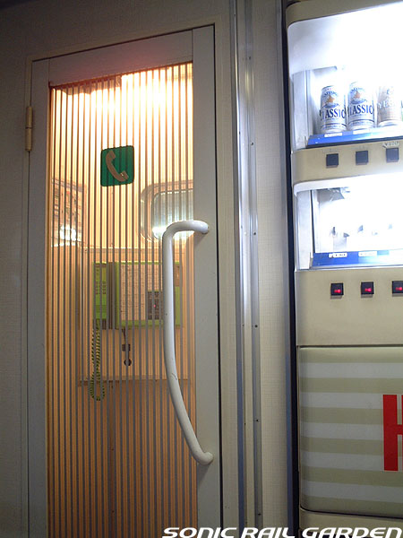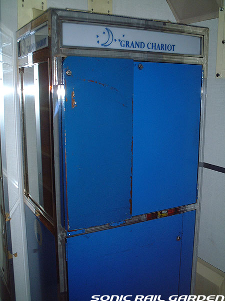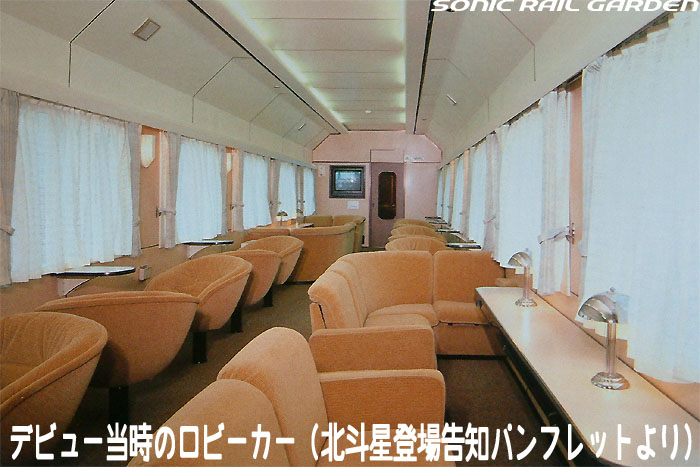 「北斗星3・4号」の6号車には1両丸まるはフリースペースとなっている「ロビーカー」が連結されています 広々とした空間には、L字ソファーと丸型の回転スツールソファが並び、誰でも自由にここで過ごすことができます。 登場初期には、このロビーカーで「クリスマス・スペシャルライブ」なんかが行われたこともありました。 室内のビデオ放映は、2番組が上野〜札幌間でエンドレスで延々と流されています。 車端部にはそれぞれシャワーブースや電話ボックス・飲み物の自動販売機があります。 自販機は車両によっては設置されていない場合もあるので、ご注意。 (現在、自販機でのアルコール飲料の販売は行われておりません。ビール類は食堂車にて購入できます) また、食堂車寄りの車端部には販売カウンターの名残でその設備の一部が残っています。 昔は飲み物や軽食、グランシャリオグッズ、シャワーカードがここで販売されていましたが、現在は食堂のレジで購入します。 |
