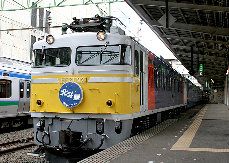 JR北海道とJR東日本の共同運行となり、JR東日本は定期列車5・6号を担当。 同時に多客期運転の臨時列車3・4号も担当。(開放B寝台のみ。個室車連結無し) 1989年 3月 臨時列車の3・4号を定期列車化。JR北海道編成とJR東日本編成が隔日で担当。 3・4号はロイヤル・ソロ・デュエット・食堂車・ロビーカー連結編成に変更。 5・6号は2号車に「ロイヤル/デュエット」車両を組み込み開始。 開放B寝台のみの臨時列車は列車名を「エルム」に変更。 1991年 3月 食堂車の営業担当が仙台営業所から上野営業所に変更。 1999年 7月 「カシオペア」運行開始。「北斗星」3・4号は臨時格下げとなり、81・82号に改番。 「北斗星」5・6号は、3・4号に改番。 2004年 4月 「北斗星」81・82号の運休期間に同編成用の個室車両を3・4号のB寝台と入れ替え。 閑散期中の3・4号は編成中の大多数が個室車両となり、ロイヤルが8室に増室。 (以降、個室需要対応と乗車率向上を目的に、2007年まで閑散期に同施策を継続) 2007年 8月 臨時列車「エルム」の運行を終了。 「北斗星」81・82号は「エルム」のダイヤに変更となり、「北斗星」91・92号に改番。 2008年 3月 海峡線の北海道新幹線工事が本格化。「北斗星」は1・4号を廃止して1往復化。 1-6号車がJR北海道車、7-11号車がJR東日本車の混成編成となる。 JR東日本所属のロビーカーは編成から外れたため、定期運用を終了。 (撮影時期:2002年・2003年・2005年・2006年・2007年) |