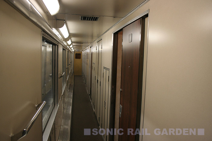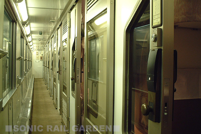 当初、季節運転だった「北斗星3・4号」を定期化の上、個室中心としたJR東日本編成とJR北海道編成で隔日と運転するため、 平成元年頃に、両社で一般寝台車の個室寝台車両化改造やロビーカー・食堂車の増備が進められました。 JR北海道では、すでに「北斗星1・2号」編成に組み込んでいた「ツインデラックス(上項)」を1両、「3・4号」用に捻出し、 新たに「1・2号」用に「ツインデラックス」車両を改造製作したのですが、この時に生まれたのがこの「ニューツインデラックス」です。 個室構造をB寝台「デュエット」と同じ上下2段の交互配置として、従来の「ツインデラックス」と同じ8室16名定員で構成。 1室あたりの空間面積は従来のタイプより大幅に広く大きくなりました。まさに絶妙な空間設計の個室車です。 個室内には900mm幅のベッドを「デュエット」と同様に合い向かいに配置。2階個室は室内に階段を抱え込む構造になっています。 室内に入ったすぐ脇には洗面台を設置。アメニティキットのサービスはありませんが、コップとタオルが用意されています。 室内にはAV装置・小型液晶テレビ・アラーム付き時計・空調コントロールパネル・読書灯などが装備されています。 この車両はこの1両だけが登場。「北斗星1・2号」で従来の「ツインデラックス」と交互に隔日運行されていました。 |