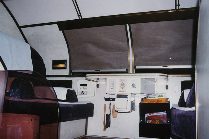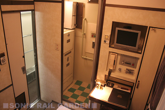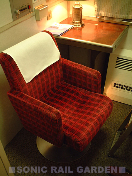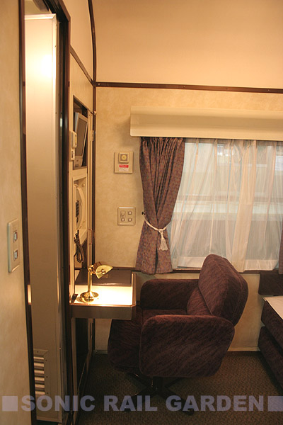 数々の趣向を凝らした寝台個室が活躍している中で、依然「1人用個室」の頂点を極めるのがこの「ロイヤル」。 ビジネスホテルのシングルルームをそのまま「鉄道車両」サイズにして持ってきたかのようで、 数々のアメニティを味わう前に、まず室内で“歩き回れる”広さに感動することでしょう。 約5.7平方メートルの室内にはベッド・ソファー・ライティングデスク・コートクローク、そしてプライベートシャワー。 上野→札幌間を、部屋から一歩も出ずとも不自由なく過ごせるほどです。 ベッド幅は80cm。各種B寝台のそれより10cm幅広で、1人で寝るには充分なワイドさです。 このベッドの下にはエキストラベッドが収納されていて、これを引き出すとダブルベッドに早変わり。 ベッド幅140cmという驚異的な大きさになります。(もっとも部屋全体がベッドになってしまうような感じですが) このベッド、入線時からベッドモードでセットされているのですが、簡単にソファーへと変えることができます。 窓と背もたれのわずかな隙間にレバーがあり、これを引くと壁面の背もたれが下りてきます。 下ろした背もたれは、若干のリクライニング角度が付けられていて、これで立派なソファーの出来上がり。 |