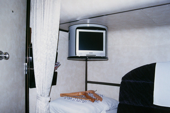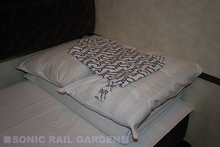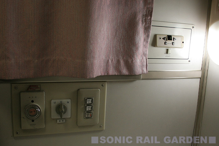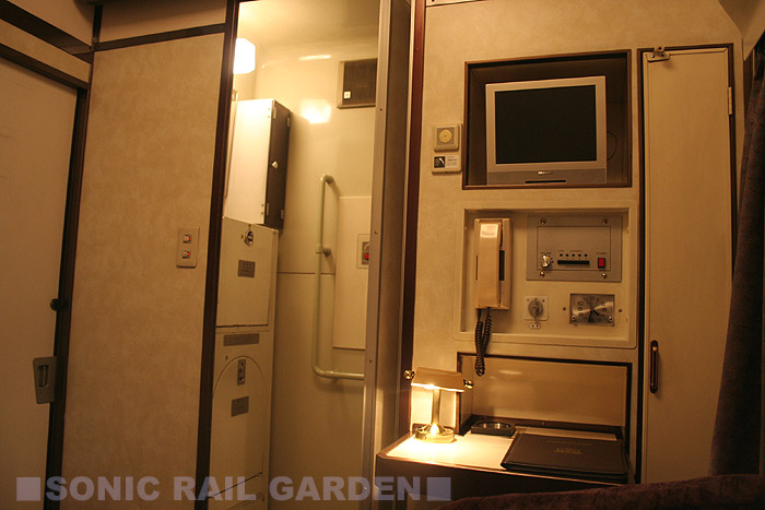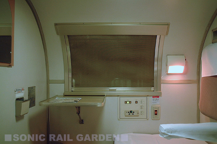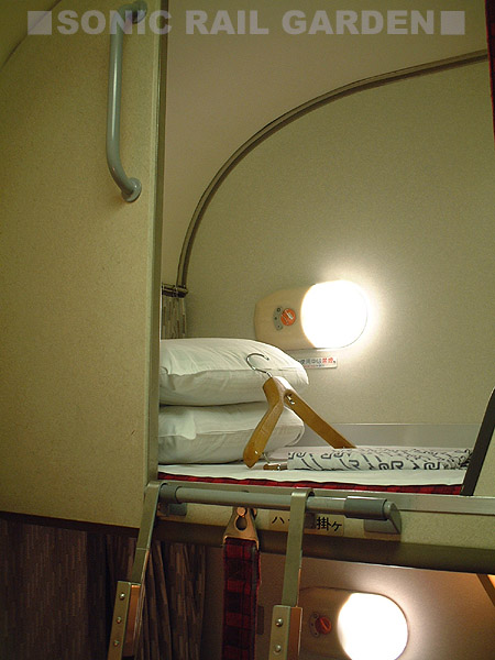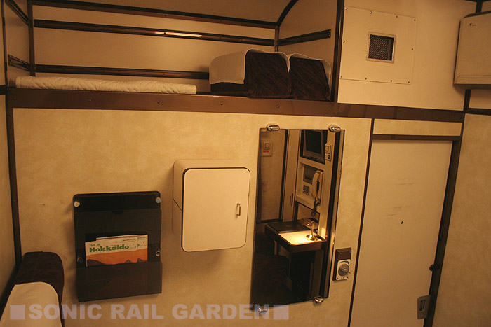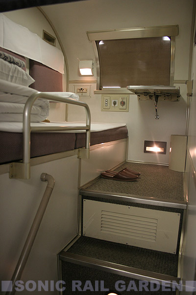 一人用B個室寝台の「ソロ」は様々なタイプが登場していますが、JR北海道の仕様は比較的ベーシックなスタイル。 上段と下段を千鳥状に交差させて配置させ、上段個室は室内に階段を抱え込んだ設計になっています。 上段はこの階段部分で、下段は天井方向へ突出した部分で完全に立ち上がることができ、着替えもラクラク行えます。 寝台幅は上下段とも70センチ。空調と室内音楽放送のコントロールパネルも設置されています。 上段は大きく湾曲した空間になっていて若干圧迫感がありますが、 天井へと繋がるかのような曲面窓ガラスからは、まるでプラネタリウムのような星空が・・・・! お世辞にも「広々とした・・」なんて表現はできませんが、1人で気兼ねなく過ごすには充分な空間です。 個室内には電源コンセントはありません。移動中の充電などはできませんのでご注意を。 ちなみに「JR北海道」編成の「ソロ」は、「ロイヤル」や「ロビー」と合造になっている車両(6号車・9号車)と、 「オールソロ」と呼ばれる1両丸々が「ソロ」になっている車両(5号車)では、室内の雰囲気が若干違います。 合造タイプの「ソロ」はドアロックがカギ式で、室内は落ち着いた雰囲気。 「オールソロ」タイプはドアロックが電子式で、室内は明るめになっています。 |