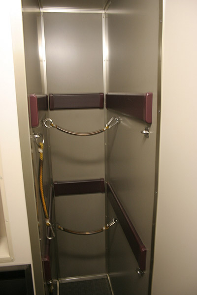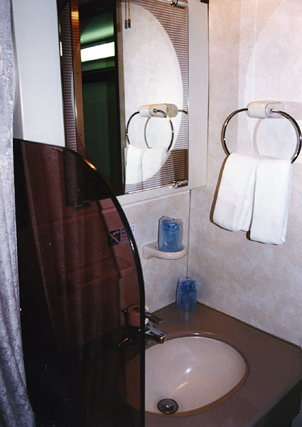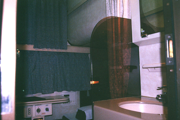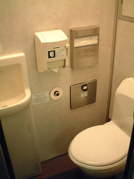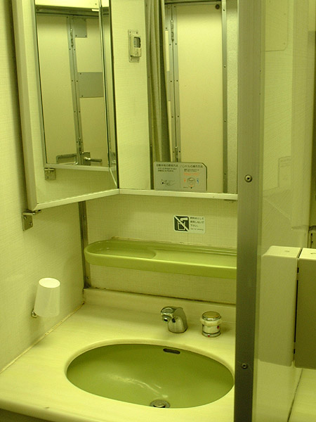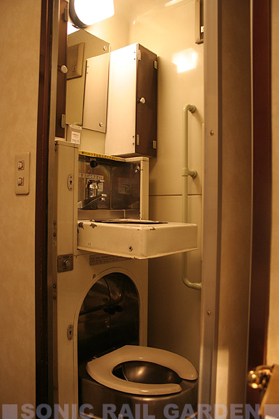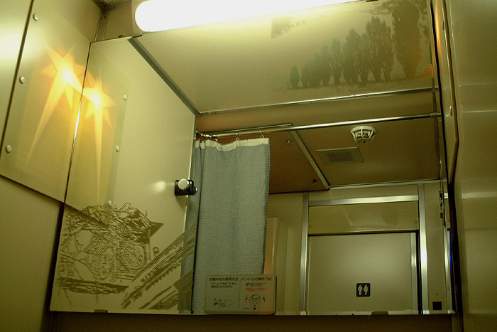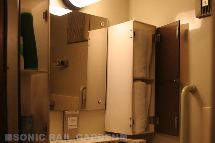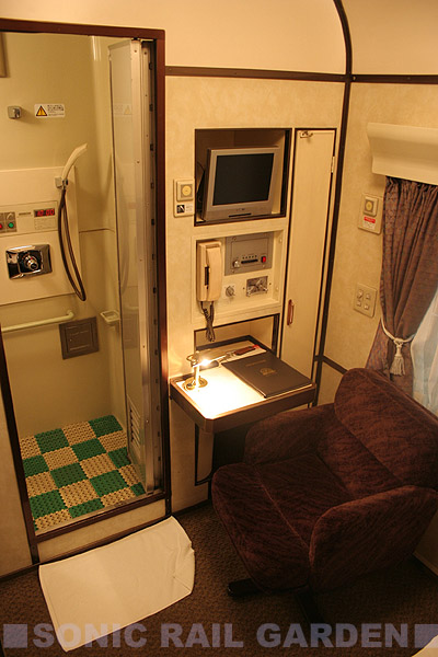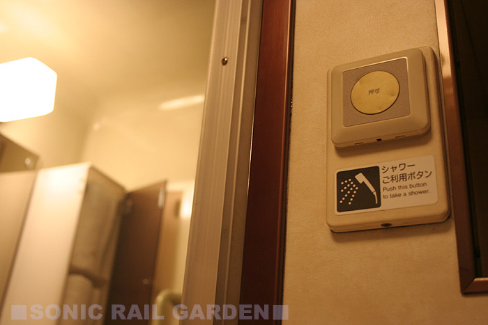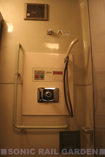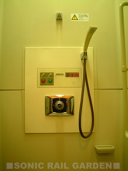 シャワーブースには、メインとなるシャワーのほか、収納式の洗面台と洋式トイレを完備。 いつでも好きな時にシャワーを思う存分浴びることができ、 わざわざ部屋から出なくても歯を磨いたり、顔を洗ったり、用を足すことができる。 これらの利便性を体感しただけでも、「ロイヤル」のリピーターになってしまいそうです。 シャワーは1カウントで10分の利用が可能。 この「10分」の利用は、(多分タンクのお湯が尽きるまで)何度でもリセットができます。 リセットボタンはシャワー扉の横の丸いボタン。これを押せばタイマーがまた「10分」に元通り! ちなみに上野→札幌の乗車で、10分利用を5回(つまり50分!)ほど使ってみましたが、 問題なく熱々のシャワーを浴びることができました。 収納式の洗面台とトイレは、引き出し/折り畳みとも動きが重いので指などを挟まないようにご注意。 トイレットペーパーは壁面の銀色の小さな扉の中にセットされています。 もちろんこの扉はシャワーを使っても、中のペーパーが濡れないためのものだとは思いますが・・・・ けっこう隙間があるみたいで、シャワーを一度使うと中のペーパーは確実に濡れます。 シャワーを使う前には、先にこのトイレットペーパーをシャワーブースから出しておくのが正解! ------------------------------------------------------------------------------------------ さて、完全無欠の室内装備を誇る「ロイヤル」のようですが・・・・ 実は電源コンセントがシャワーブースの洗面台脇の奥に1つしかないという、不便な点があります。 室内でパソコンを使ったり、携帯電話やデジカメの充電をするつもりだという人は、 “お荷物”でも2〜3メートル延長コードを持参されることをお薦めします。 シャワーはシャワー室の扉を完全に閉めないと給湯機能が作動しないのですが、 扉の下は柔らかいゴムになっているので、延長コードを室内へ伸ばした状態でも扉は閉まります。 コンセントは水濡れ防止のカバー付きなので、持参する延長コードはプラグ側が可動するタイプにしましょう。 (情報提供:「錆び鉄の部屋」 ちゅう様より ありがとうございます。) |