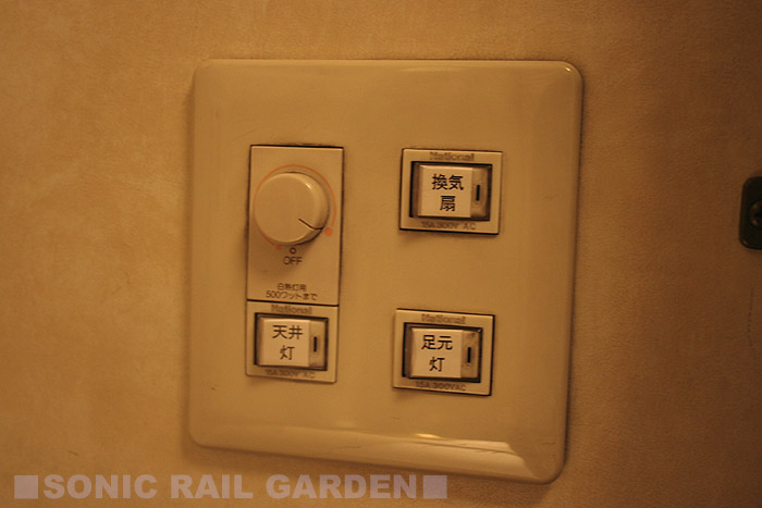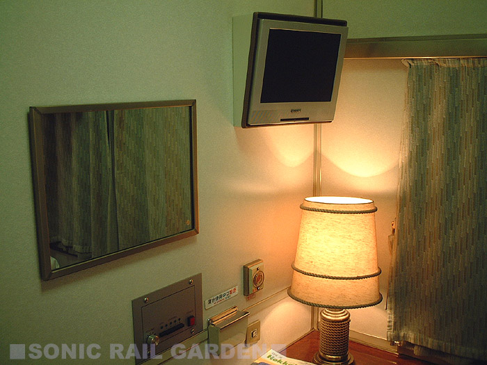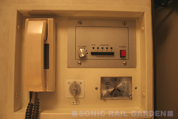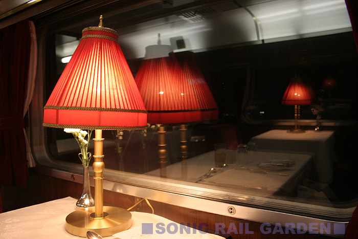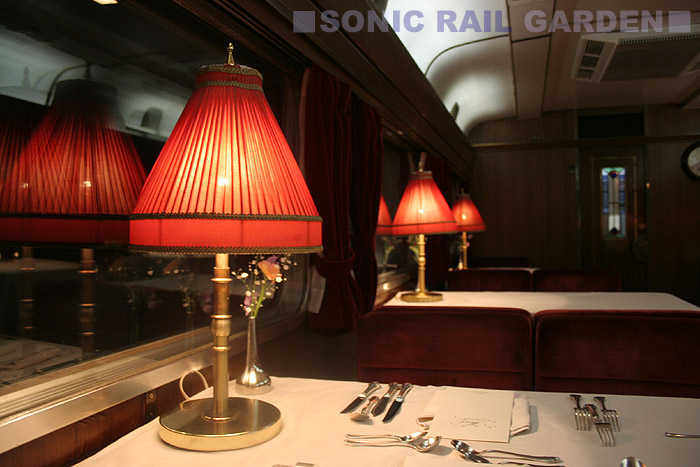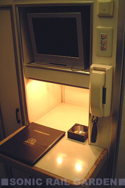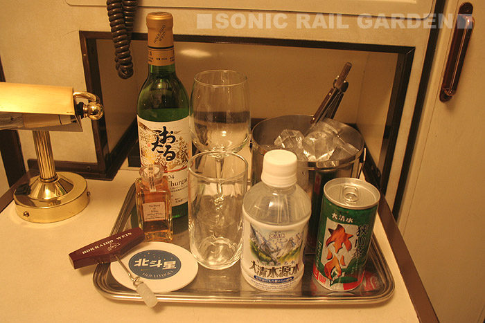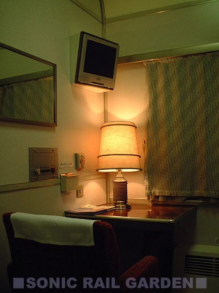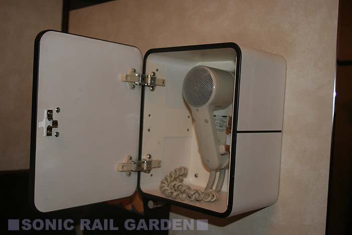 室内の装備品(例えばルームサービス用の電話機やオーディオコントロールパネルなど)は、 ボタンやスイッチ類が若干ヘタレてたりして・・・今となってはやや古めかしさが漂う、ちょっとレトロな雰囲気。 天井等はON/OFFのほかにも、光量を絞ったり明るくしたりすることができます。 夜間の車窓に見える星空を眺めたり、2人でちょっとムーディな雰囲気になってみたりと、用途によって自由自在。 ドライヤーは風量がとてつもなく弱いので、特に女性の方は自前のドライヤー持参での乗車がベストです。 備え付けの電話は外線発信はできません。食堂車にルームサービスなどを頼む際に使えるハウスフォーンです。 ロイヤルの乗客は、食堂車がパブタイムの時間に限りルームサービスを頼むことができます。 また乗車後に部屋にはウェルカムドリンクがサービスされるのですが、 この時に朝食のルームサービスを予約しておくことができます。(ただし和定食のみ) |