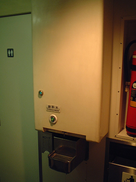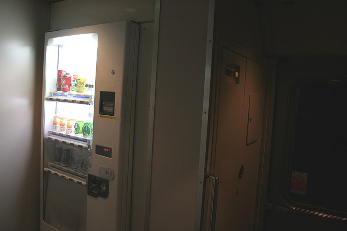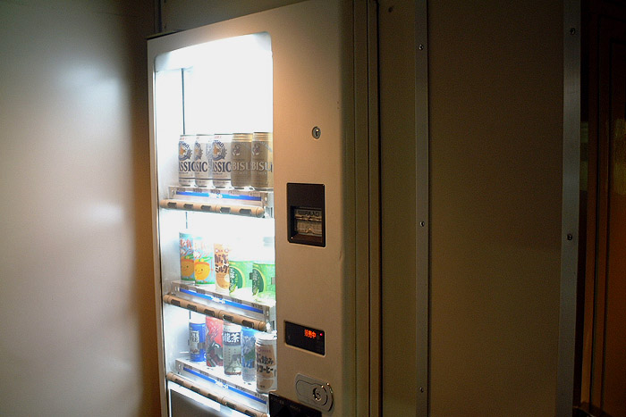 洗面台とトイレは、全てキレイにリニューアルがなされていて、「寝台列車」特有の暗く侘しい雰囲気は全くありません。 車両によってリニューアルの内容が異なり、三面鏡を備えた洗面台もあれば、ブラックベースでシックに生まれ変わったものも。 そんな中、ほとんどの洗面台で「冷水器」が元気に稼動中なのが、面白くもマニア的に心強いです。 トイレはほとんどが「洋式」に改造済み。こちらも清潔感あふれる仕上がりになっています。 一部の車両のデッキには縦長の荷物置き場が設置されています。 スーツケースやカバンを入れるには、あまりに中途半端な大きさの空間で、おそらくスキー板・スノボ収納用ですね。 6号車「ロビー室」のある車両のデッキには飲み物の自動販売機が設置されています。 以前は「サッポロ・クラシック」や「エビスビール」なんかがラインナップされていたのですが、 自販機におけるアルコール類の販売制限が強くなってきた頃に姿を消しましたが、食堂車で営業時間内に購入が可能です。 |