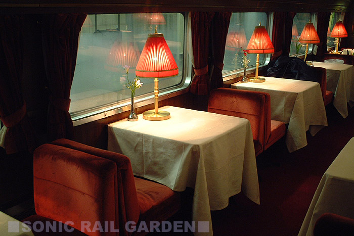 登場したばかりの「北斗星」で、メディアがこぞって取り上げたのがこの食堂車「グランシャリオ」 日本初の“完全予約制フレンチディナーフルコース”を導入したことで、庶民の「北斗星」への高級感はいっそう高まり、 また「いつか乗ってみたい」と思わせるに充分なインパクトを与えてくれました。 JR北海道の「グランシャリオ」は、ご存知の通り重厚なアールデコ調のインテリアとなっていて、大人の雰囲気たっぷり。 この雰囲気の中でワインとフレンチディナーに酔いしれる瞬間はもちろん、 走り去っていく「北斗星」にこの食堂車の明かりを見ただけでも、旅する憧れが沸いてくる、「北斗星の名役者」です。 室内は海側に2人席テーブル、山側に4人席テーブルの配置。赤系の椅子がなんともゴージャスです。 この椅子は、照明の加減や朝夕の陽の入り方で色が真っ赤なワイン色に見えたり、赤茶色にも見えたり。 そんなわけで、「北斗星」ご乗車の際は、ぜひ夜の食堂車と朝の食堂車のどちらも体験していただきたいところです! 化粧板は木目調で、かなり濃いめの色調。これがまた赤いランプシェードに照らされると艶っぽい色になるんですねぇ。 パントリー側の壁面にはステンドグラスを埋め込むというこだわりようで、しかもしっかり「JR」ロゴ入り(^^) 食堂車「グランシャリオ」の営業は・・・・ 【北斗星1号】17:30〜18:50−1回目のディナータイム 19:10〜20:30−2回目のディナータイム (いずれも要予約) 【北斗星2号】18:00〜19:20−1回目のディナータイム 19:40〜21:00−2回目のディナータイム (いずれも要予約) 予約不要のパブタイムは1号・2号とも、2回目のディナータイム終了後〜23:00までとなっています。 (稀にパブタイムの開始時間が前倒しとなることがあります。) |
