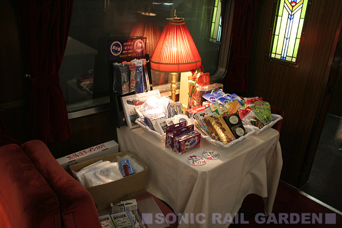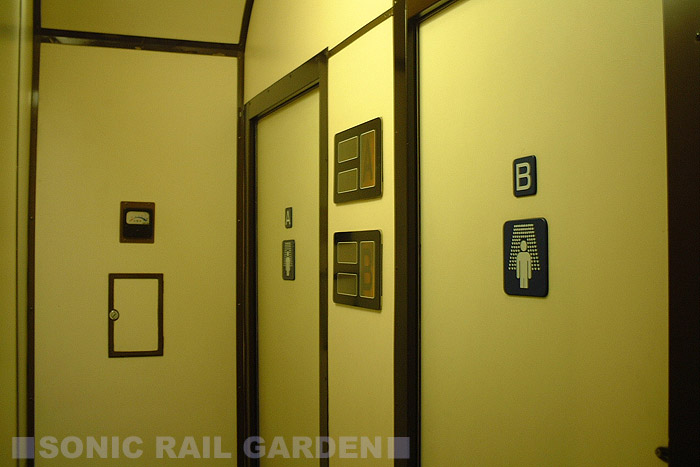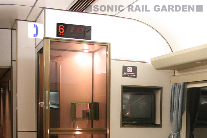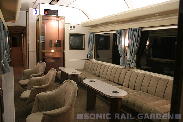「北斗星1・2号」の6号車にある「ロビー室」には3脚の回転スツールにソファー。 電話コーナーとシャワーブースも備えていて、小さいながらも、けっこう充実した空間になっています。 お弁当を持ち込んだグループ客がここで小宴会を開いていることがありますが、 ほかの利用者が居づらくなってしまい、また壁を隔てた隣は寝台個室なので、ハシャギ過ぎにはご注意。 |
