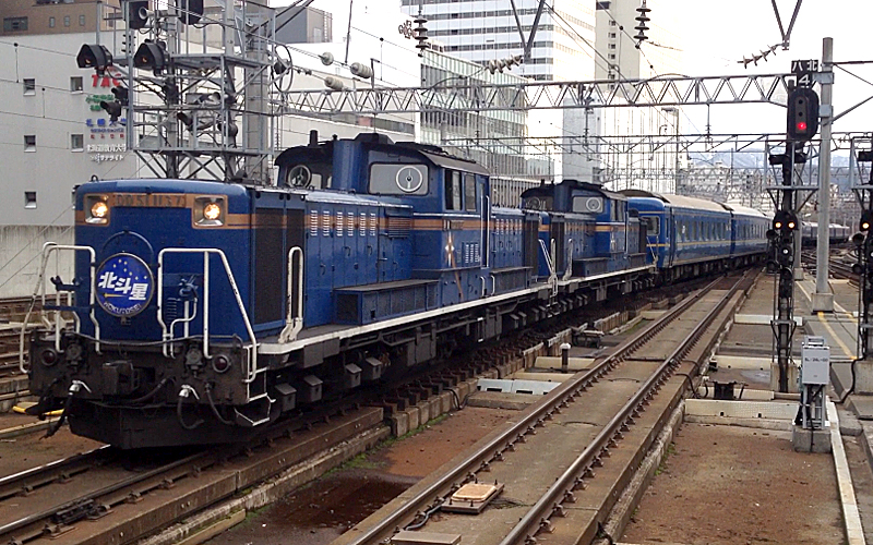 JR北海道とJR東日本の共同運行となり、JR北海道は定期列車1・2号を担当。 1989年 3月 臨時列車の3・4号を定期列車化。JR北海道編成とJR東日本編成が隔日で担当。 1989年 7月 1・2号にニューツインデラックスを組み込み。 1990年 7月 1・2号に「ロイヤル・ソロ」合造車を組み込み。 1991年 9月 1・2号の5号車を「ソロ」個室車両に変更。 1991年11月 1・2号の4号車を「デュエット」個室車両に変更。 1997年 3月 1・2号の11号車をB寝台コンパート車両に変更。 1997年 6月 1・2号の1号車をB寝台コンパート車両に変更。 1997年10月 1・2号の3号車を「デュエット」個室車両に変更。 1998年 3月 1・2号の2号車を「デュエット」個室車両に変更。1・2号は全車個室化が完了。 1999年 7月 多客期に1・2号を「北斗星小樽号」として小樽まで延長運行。 2008年 3月 海峡線の北海道新幹線工事が本格化。「北斗星」は1・4号を廃止して1往復化。 1-6号車がJR北海道車、7-11号車がJR東日本車の混成編成となる。 JR北海道所属のロイヤル、ツインDX、ロビーカー、食堂車は運用を終了し引退。 (撮影時期:2002年・2003年・2006年・2007年) |